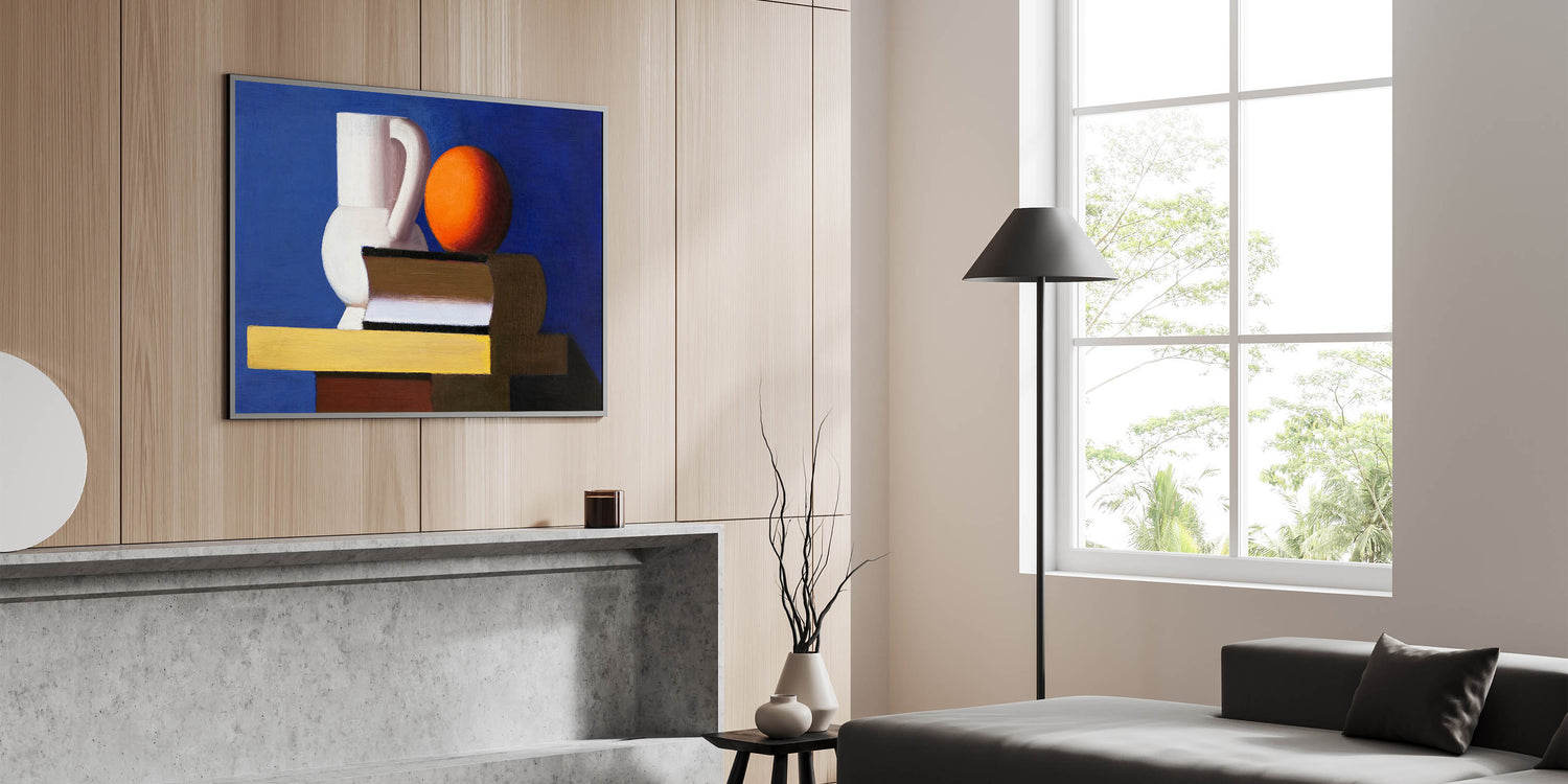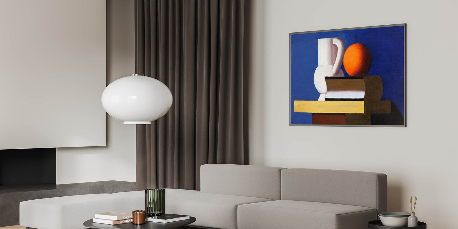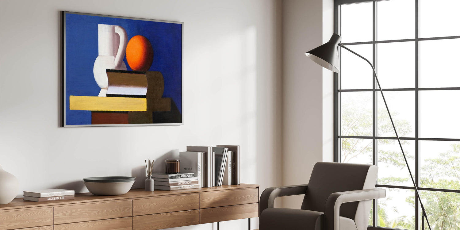 Brighten up your space with this Modern Wall Art, a striking still life featuring a white jug, a vibrant orange, and stacked books against a deep blue background. The bold color contrasts and clean geometric shapes create a visually captivating composition, perfect for Trendy Home Décor. This artwork celebrates the beauty of simplicity while adding a contemporary touch to your living space.