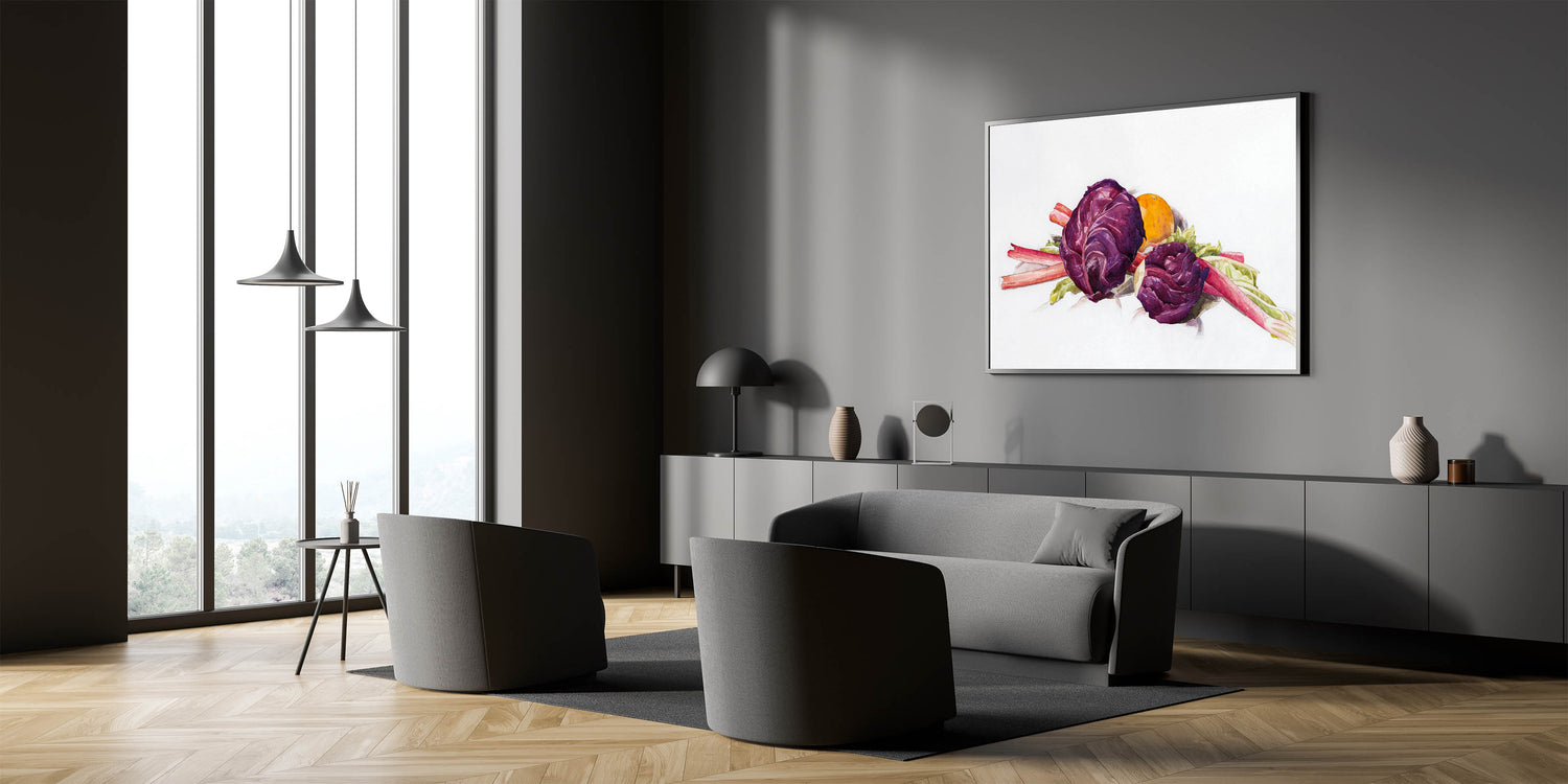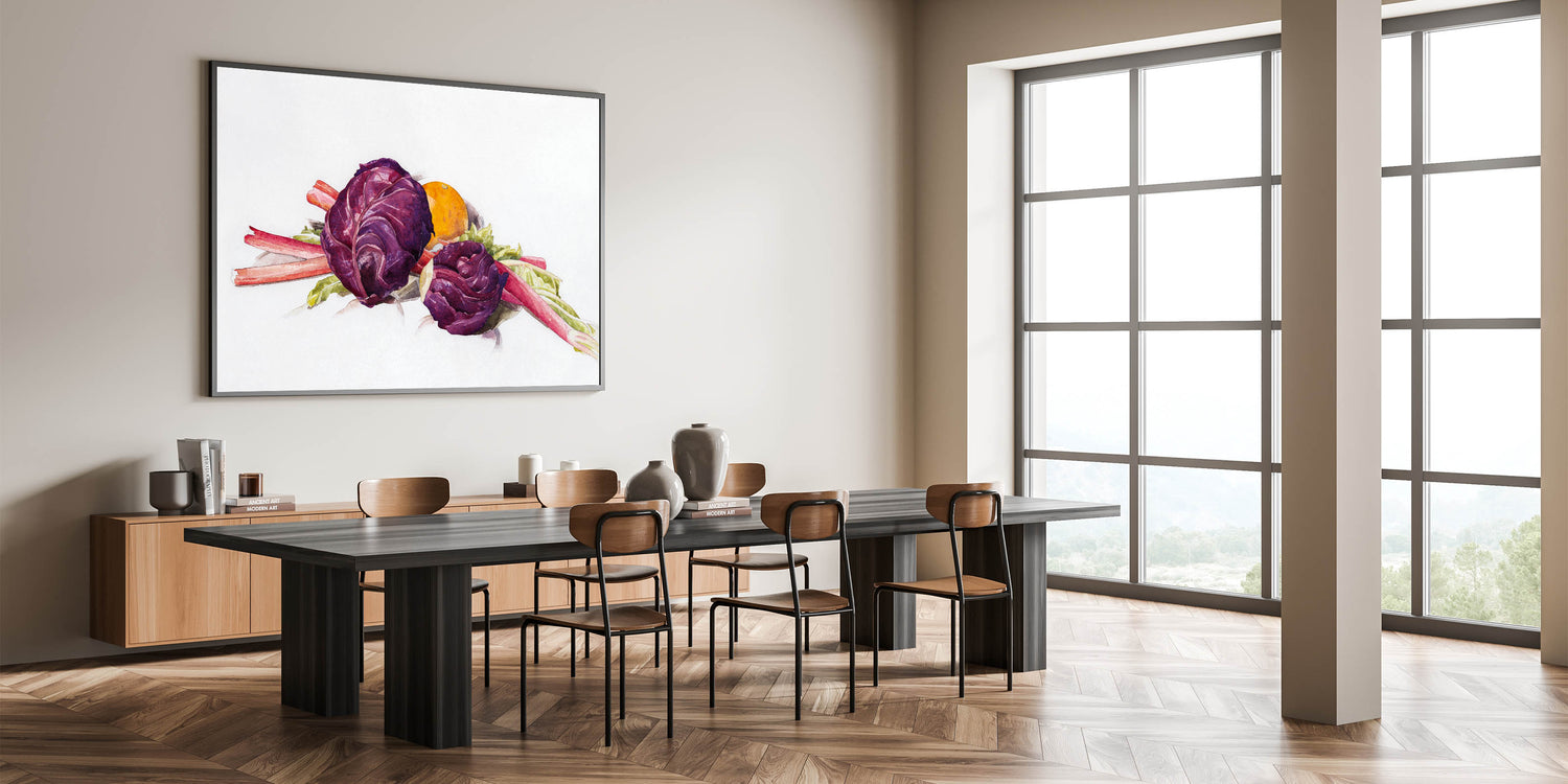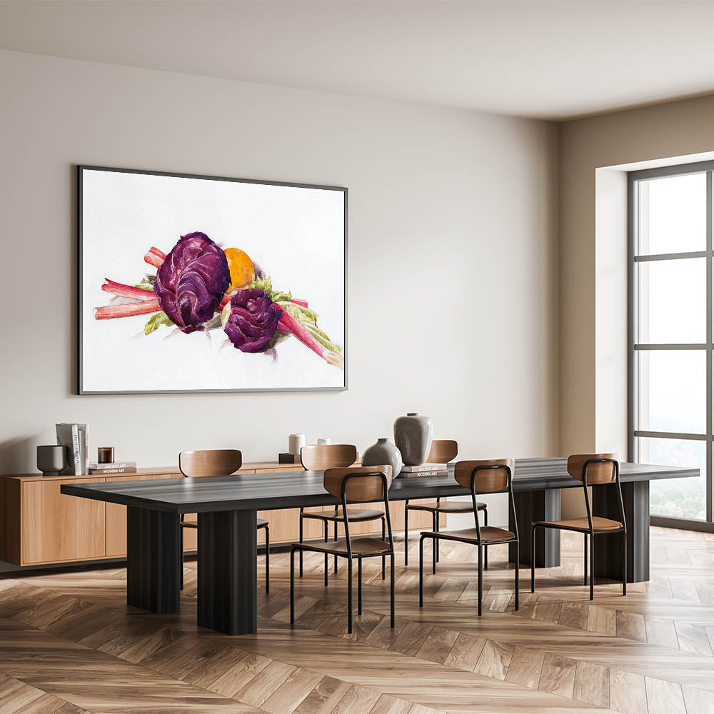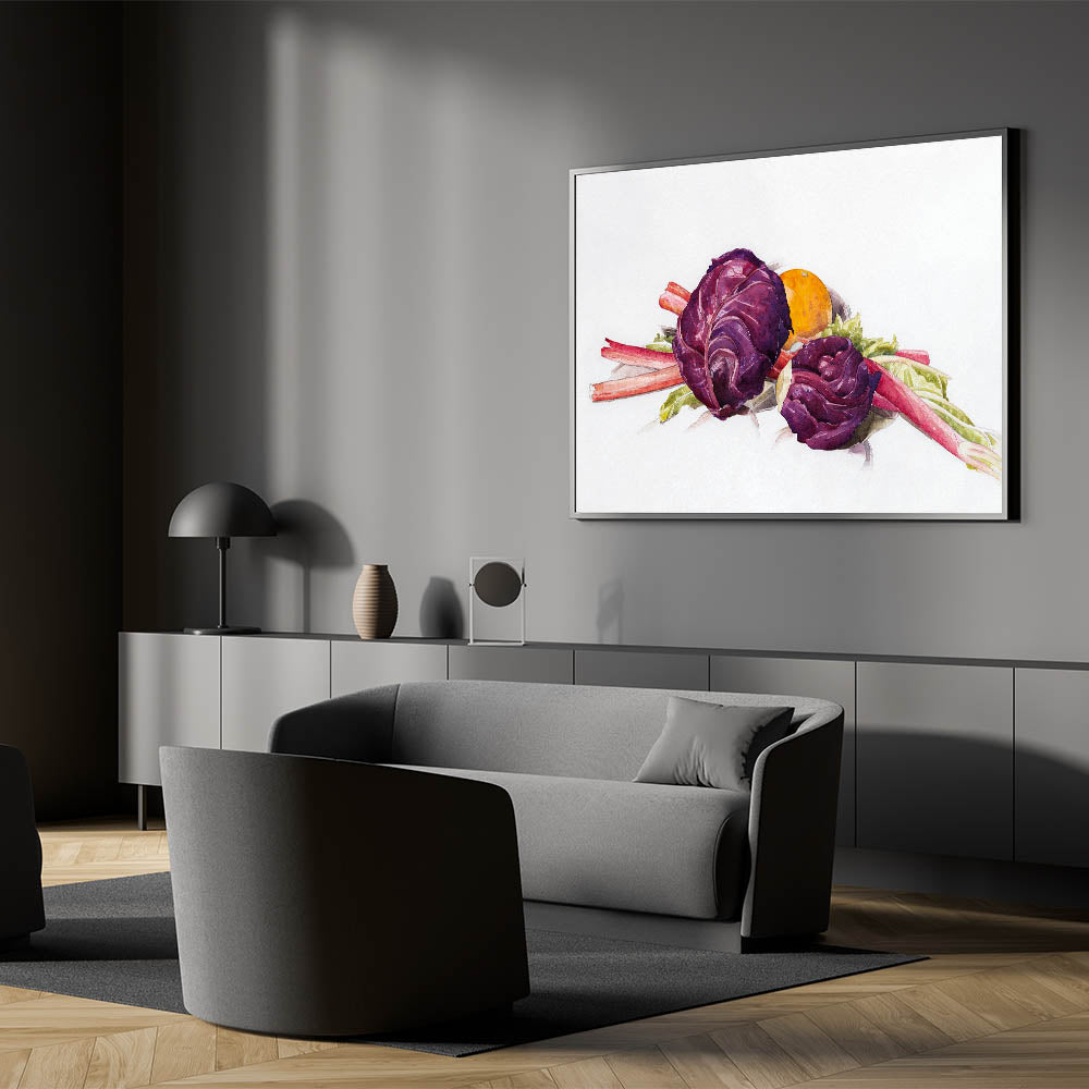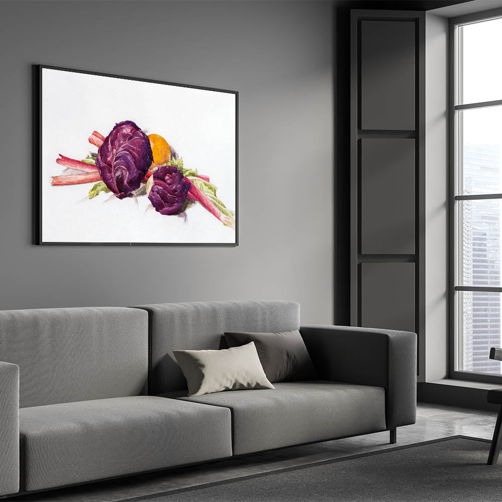 Bring a touch of natural elegance to your space with this beautifully detailed still-life wall art. Featuring a vibrant arrangement of red cabbages, rhubarb, and an orange, the artwork showcases intricate textures and rich, bold colors. The deep purples, soft reds, and pops of orange and green create a harmonious balance, making this piece an eye-catching addition to any modern or classic interior.