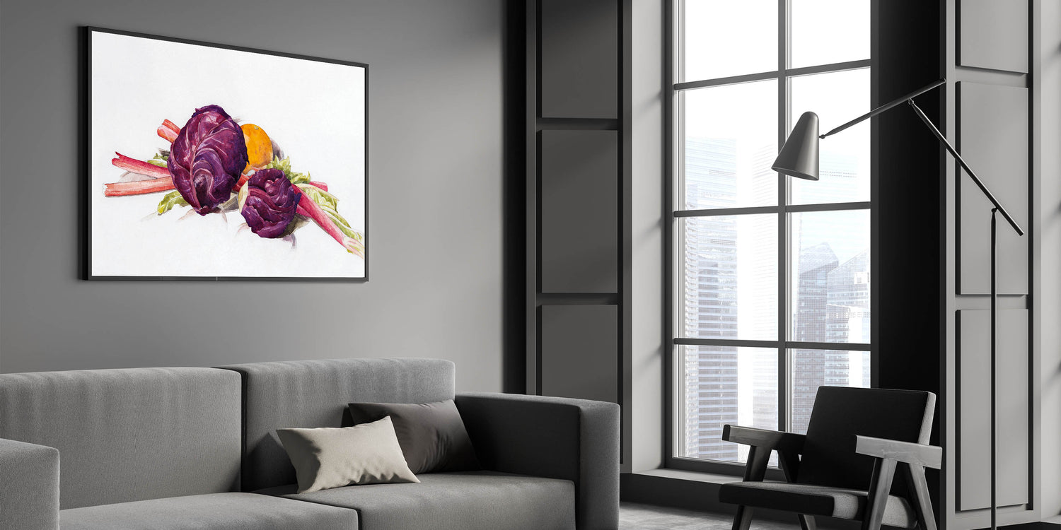 Modern Wall Art: Still Life with Red Cabbages, Rhubarb, and Orange