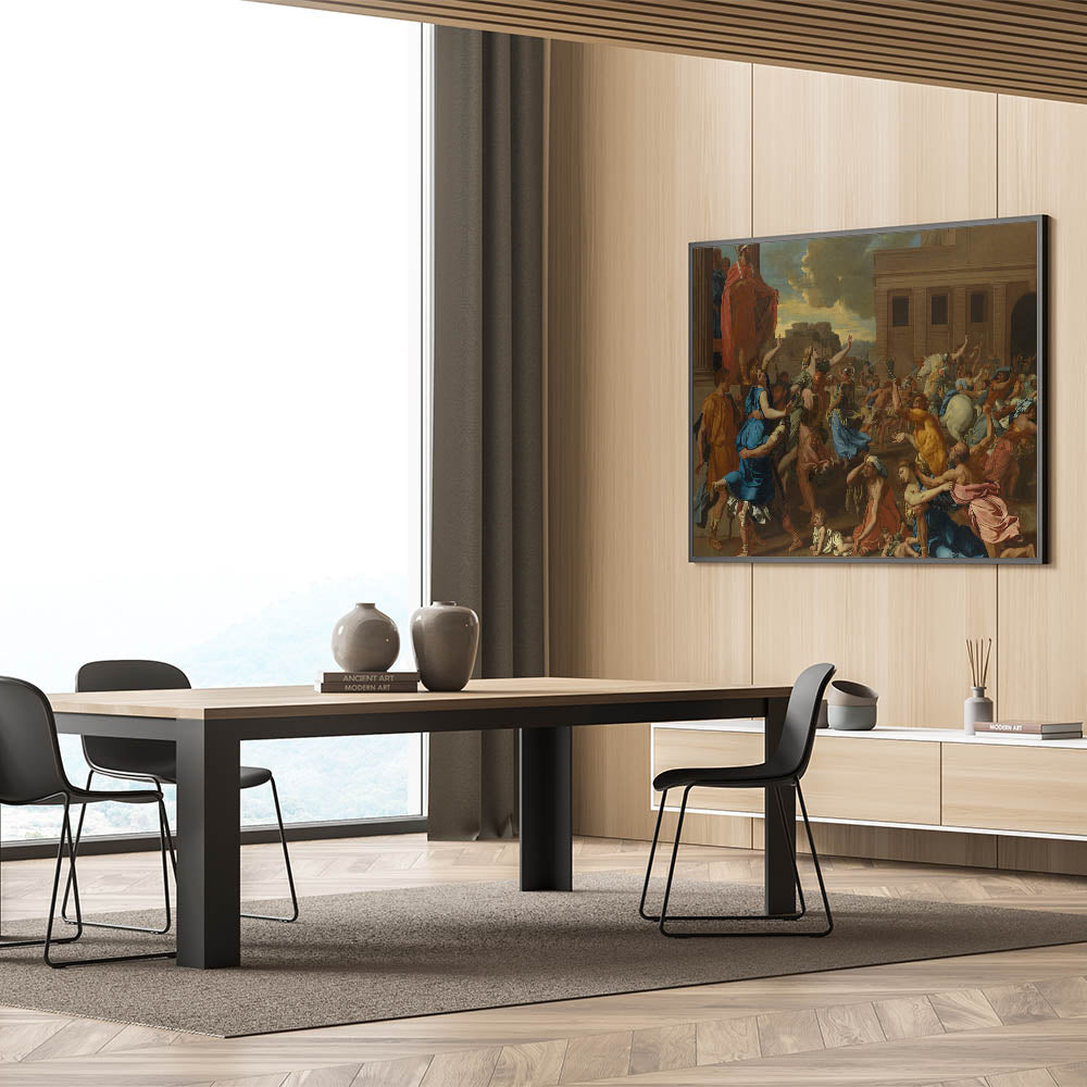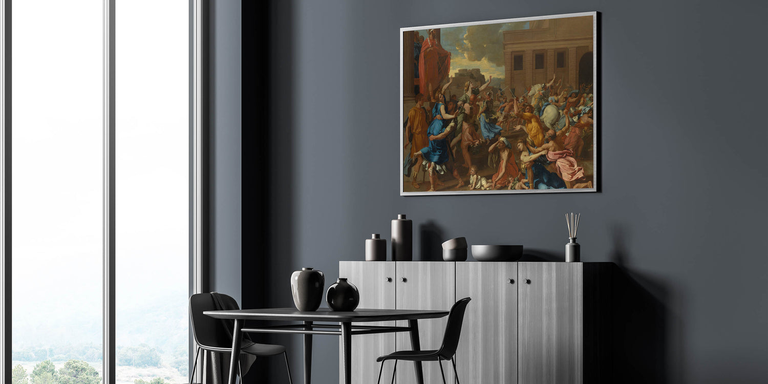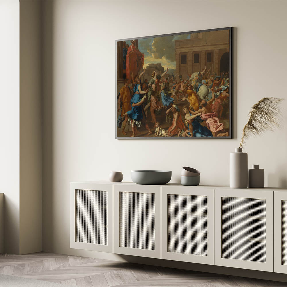Bring a touch of classical drama to your space with this modern wall art inspired by Nicolas Poussin's iconic masterpiece, "The Abduction of the Sabine Women." This artwork captures a pivotal historical moment with intense emotions, dynamic movement, and intricate detailing. Featuring vibrant colors and dramatic lighting, it’s a timeless piece that blends historical storytelling with modern decor trends.