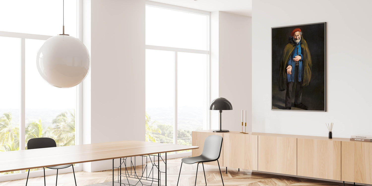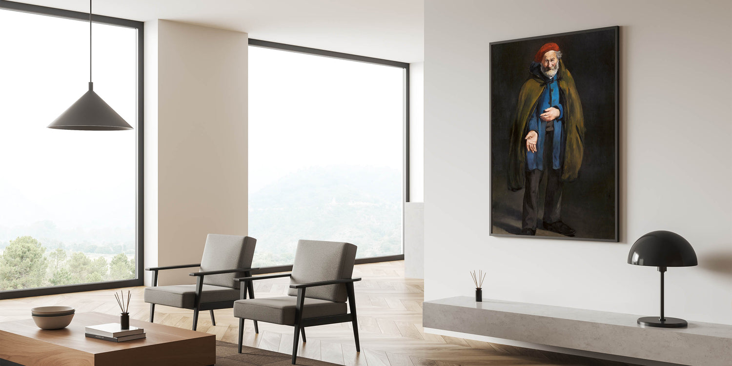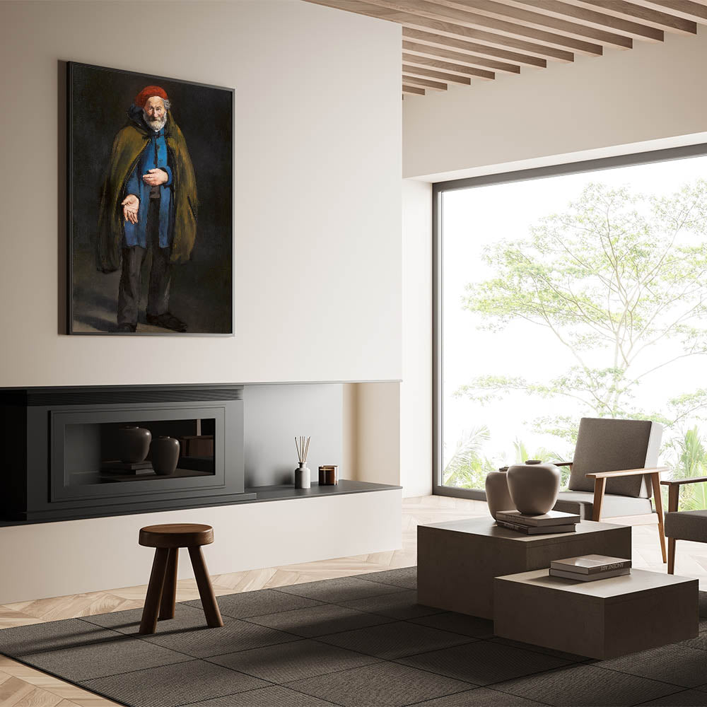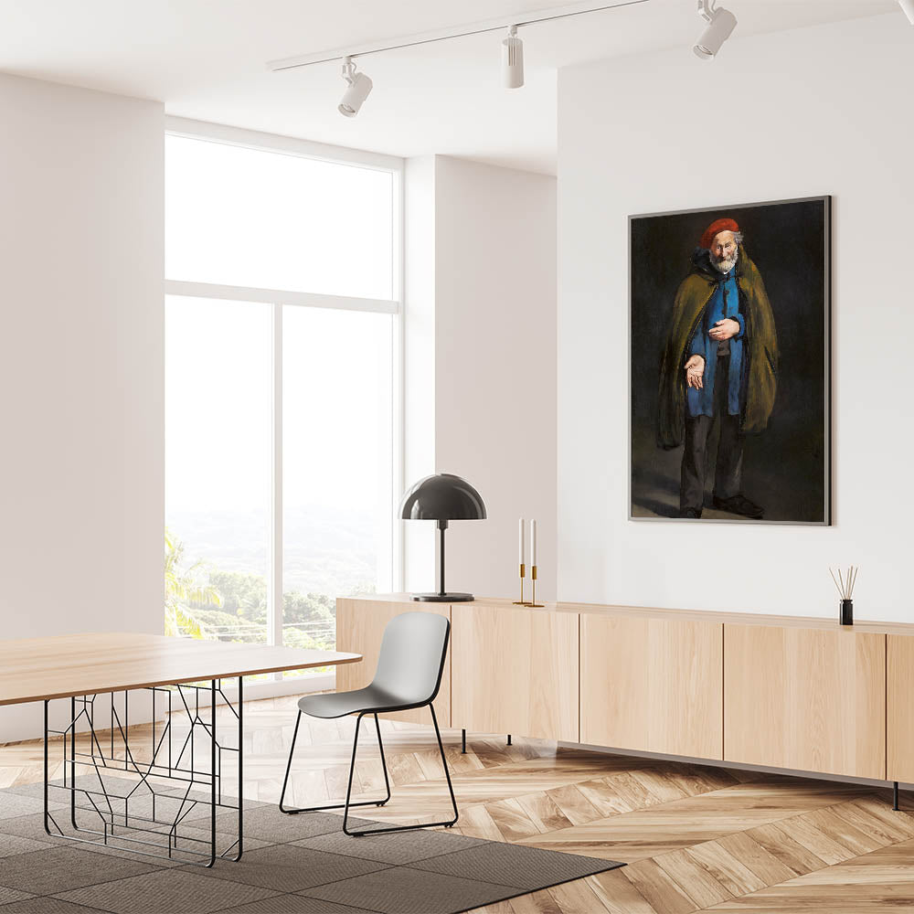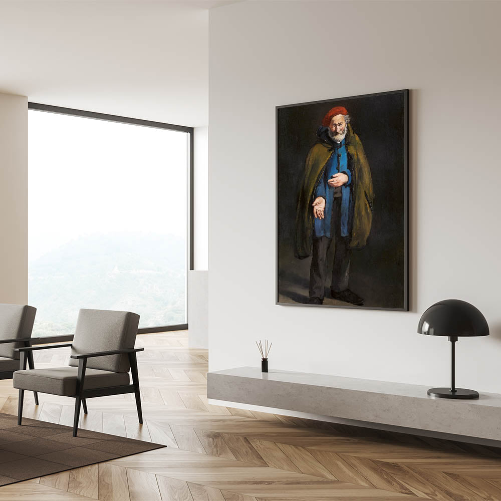 Introduce timeless elegance to your decor with the "The Beggar" Modern Wall Art. This striking piece, inspired by Édouard Manet's work (1865–1867), features a detailed portrait of a bearded man in a vibrant blue coat and red beret, contrasted against a dark background. The dramatic use of light and shadow gives this artwork a captivating and contemporary edge, making it an excellent addition to any modern design-focused interior.