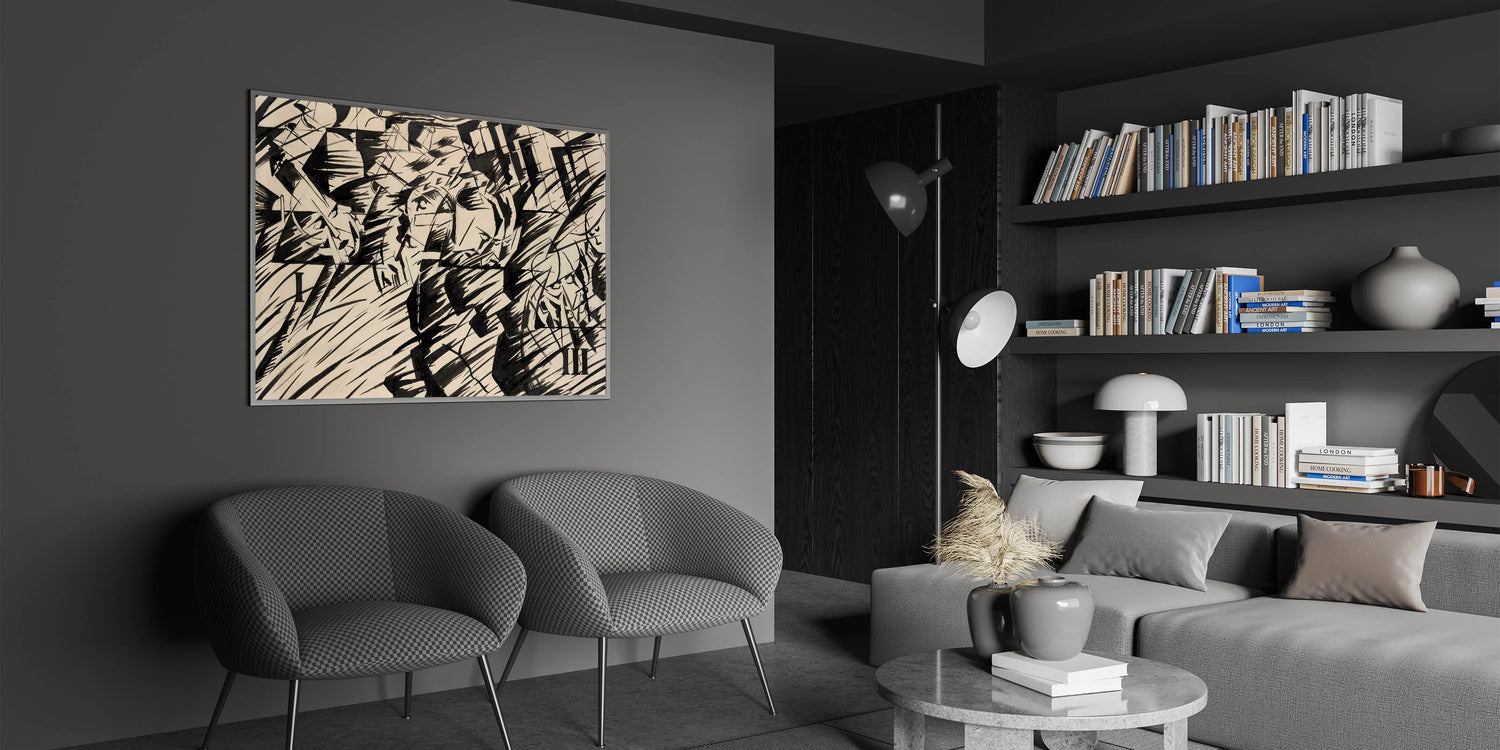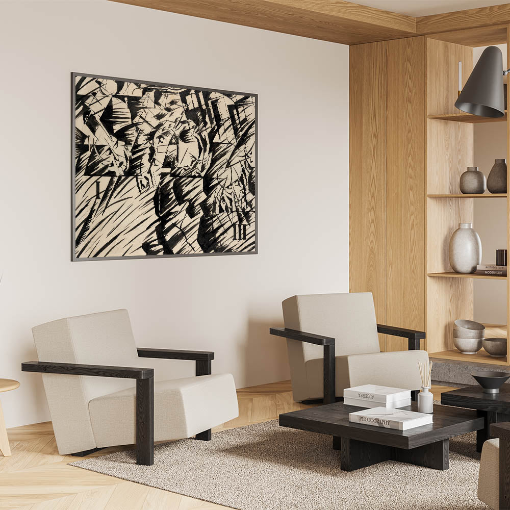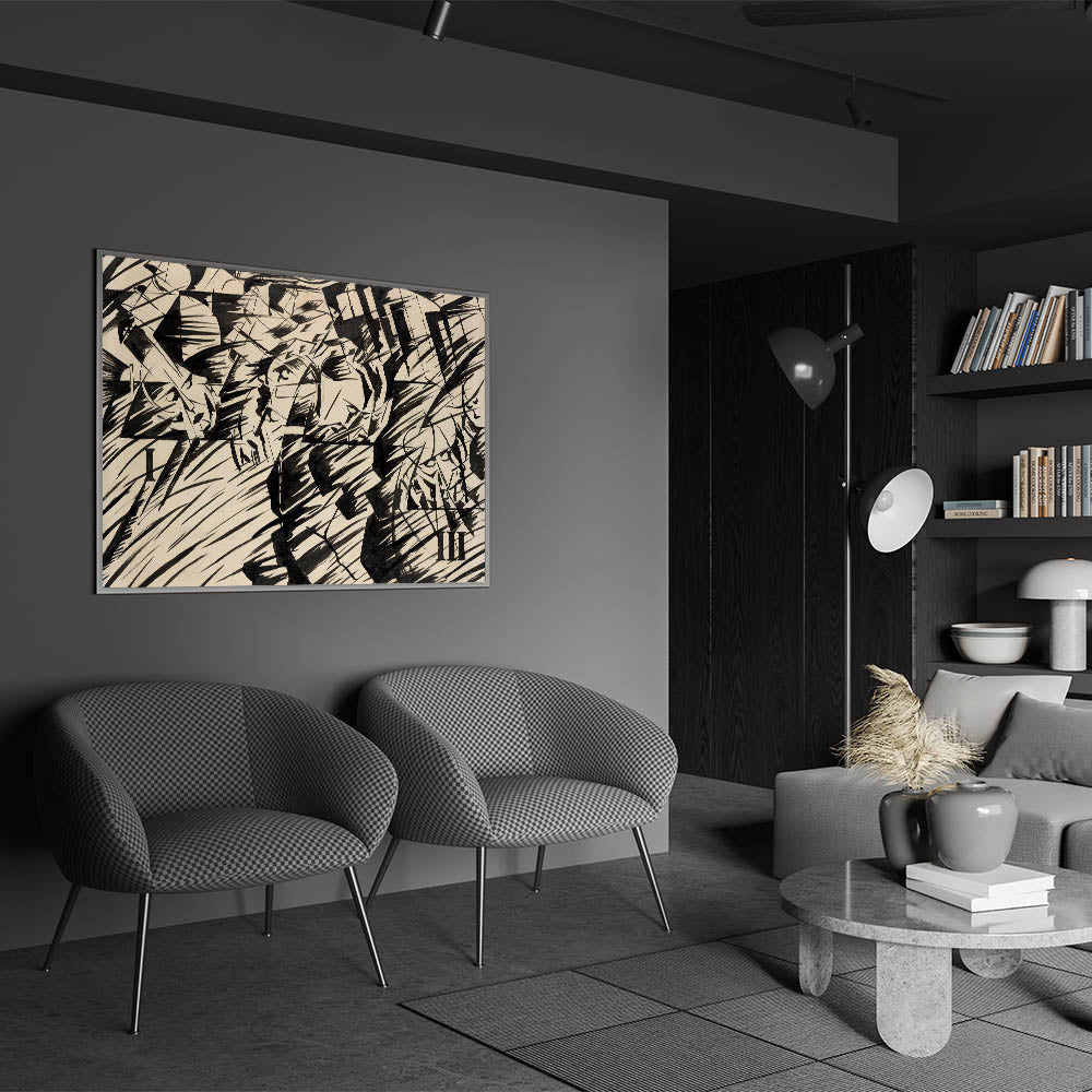 Bring the energy of Futurism into your space with this Modern Wall Art featuring Umberto Boccioni's "States of Mind: Those Who Go." This powerful black-and-white composition captures the chaos and emotion of movement and departure, showcasing dynamic lines and fragmented forms that are hallmarks of Contemporary Art and Trendy Home Décor.