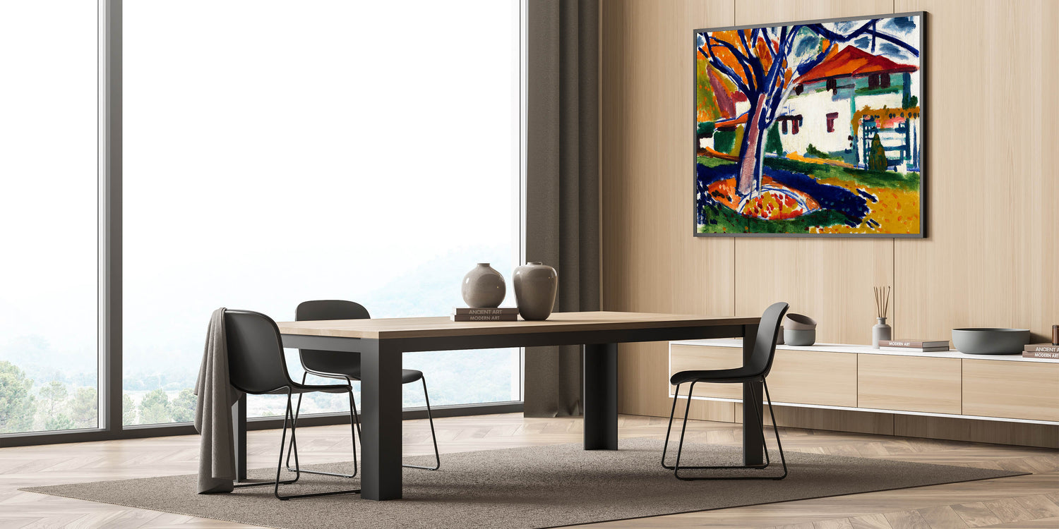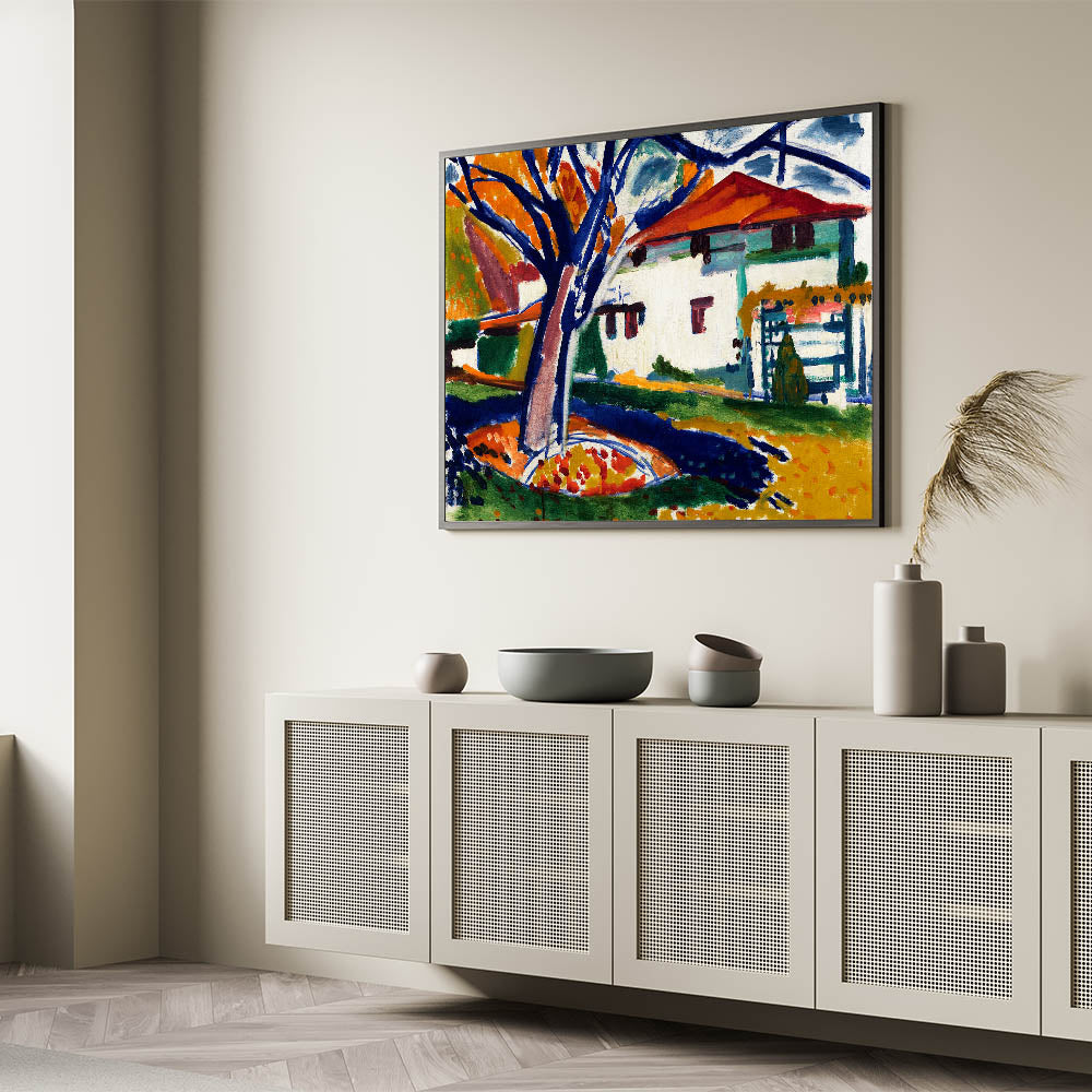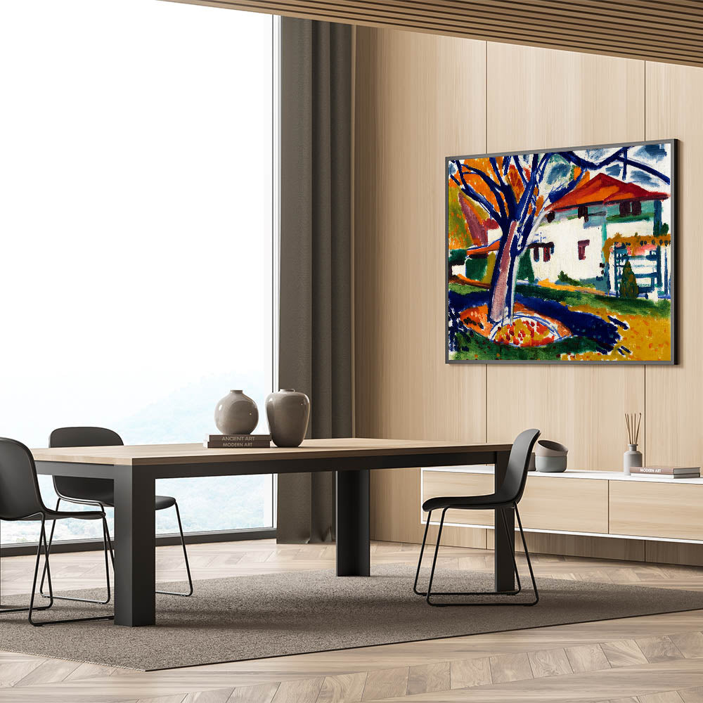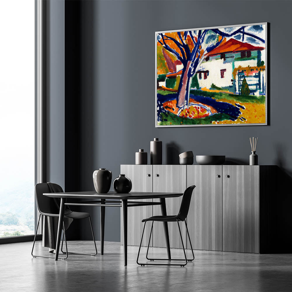 Bring a bold statement to your home with this striking modern wall art inspired by Henry Lyman Sayen's "Blue Trees" (1915–1916). This dynamic composition features vibrant blue tree branches, a lively mix of autumn tones, and a charming white house in the background. The bold brushstrokes and energetic color palette capture the essence of modern expressionism, making it an ideal piece for contemporary art lovers.