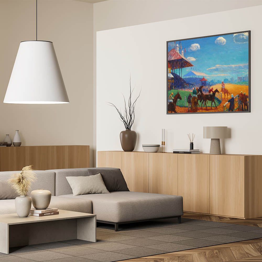 Add a burst of dynamic energy to your space with this vibrant piece of modern wall art. Depicting a lively race track scene, the artwork captures the excitement of the moment with bold brushstrokes and rich colors. The vivid blues of the sky and the golden hues of the track contrast beautifully with the deep reds and greens of the spectators and horses. The grandstands, flags, and figures add intricate details, bringing the bustling atmosphere to life.