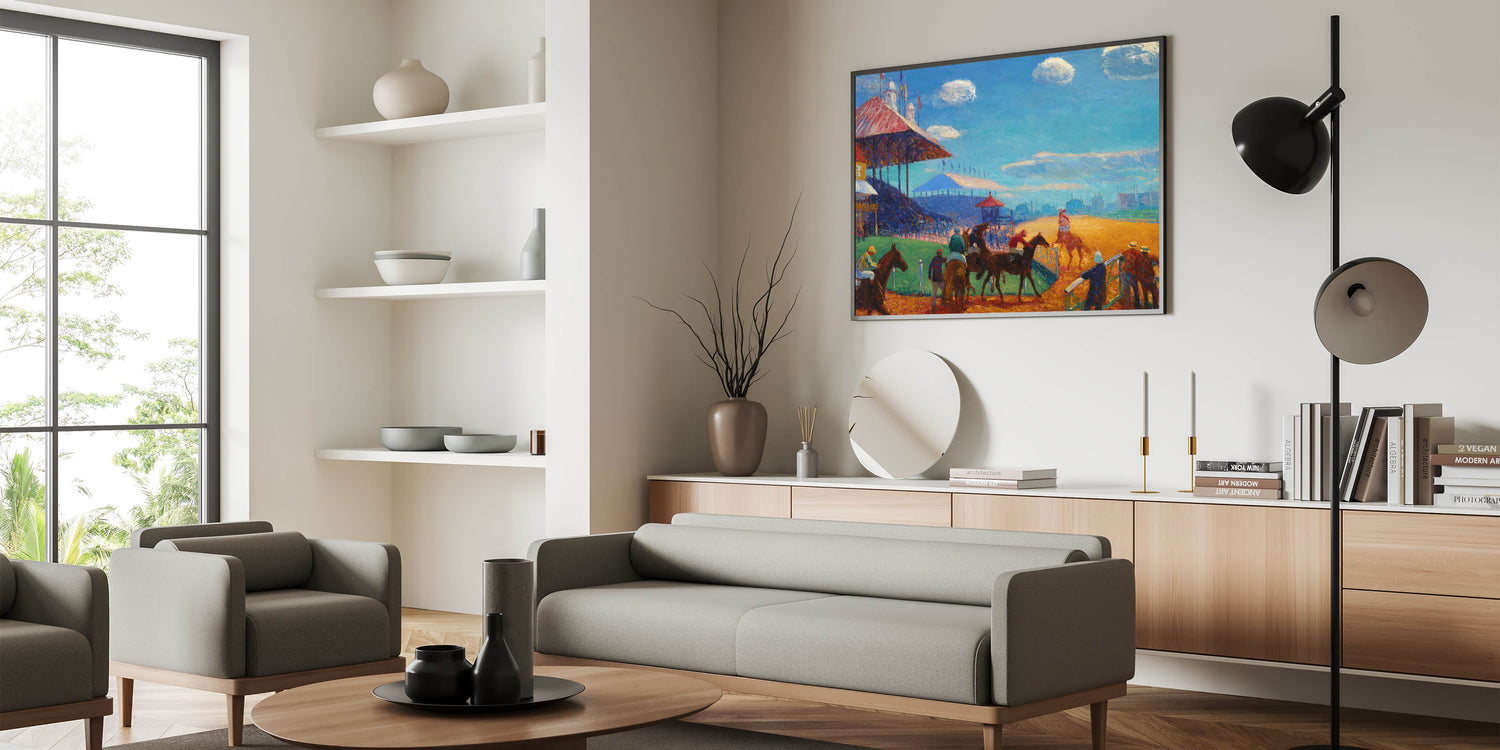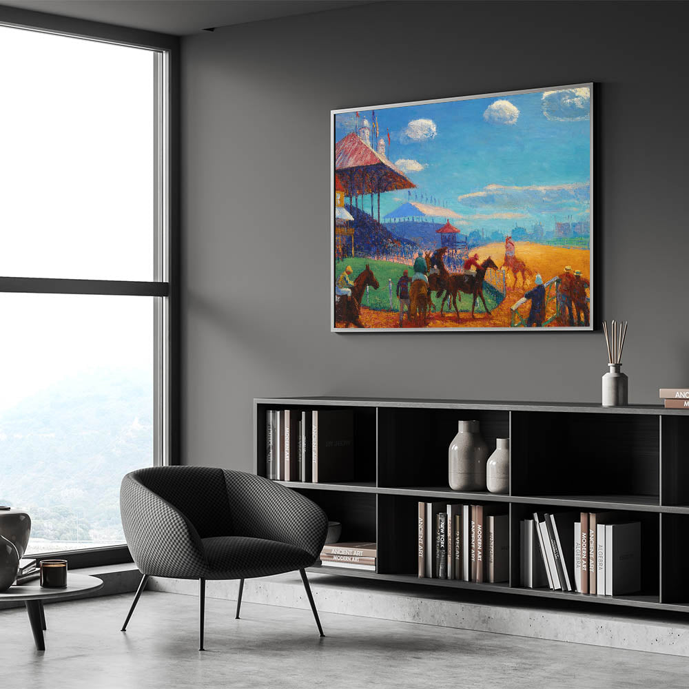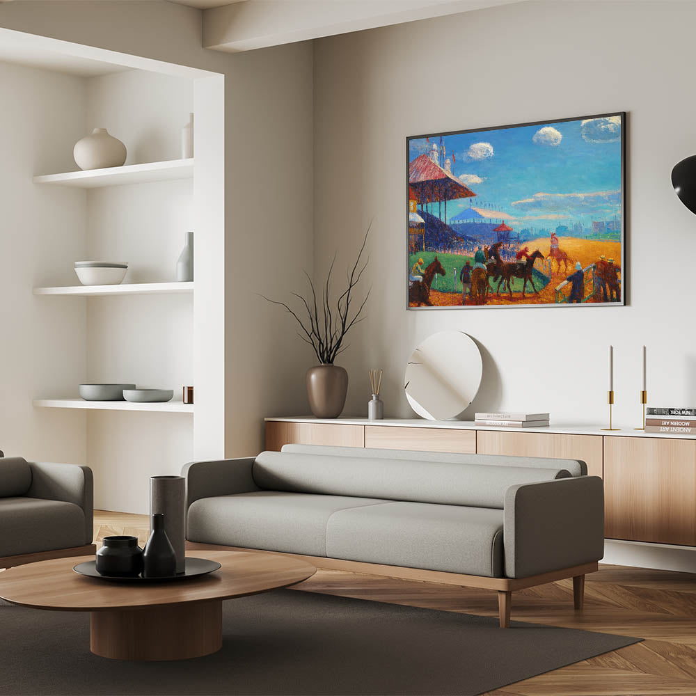 This artwork celebrates the thrill and beauty of equestrian sports with an impressionistic touch. Its bold palette and energetic composition make it a timeless piece for art enthusiasts and horse racing fans alike.