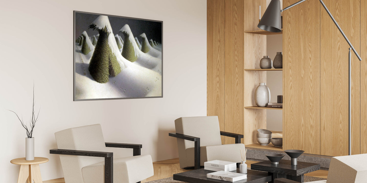 This Stylish Wall Art captures the subtle beauty of nature during the colder months, bringing a sense of calm and serenity to your space. Its muted greens and soft whites complement Modern Design Elements, making it an excellent choice for contemporary interiors. Available in multiple sizes to suit your decor style.