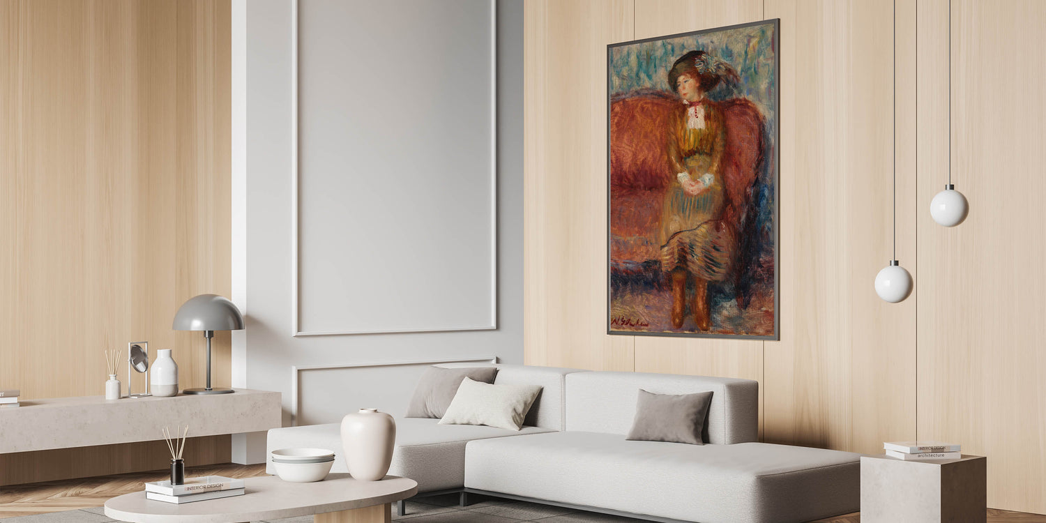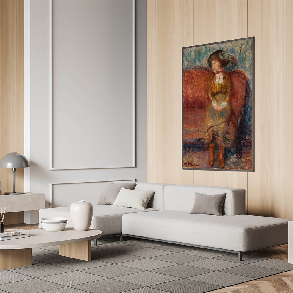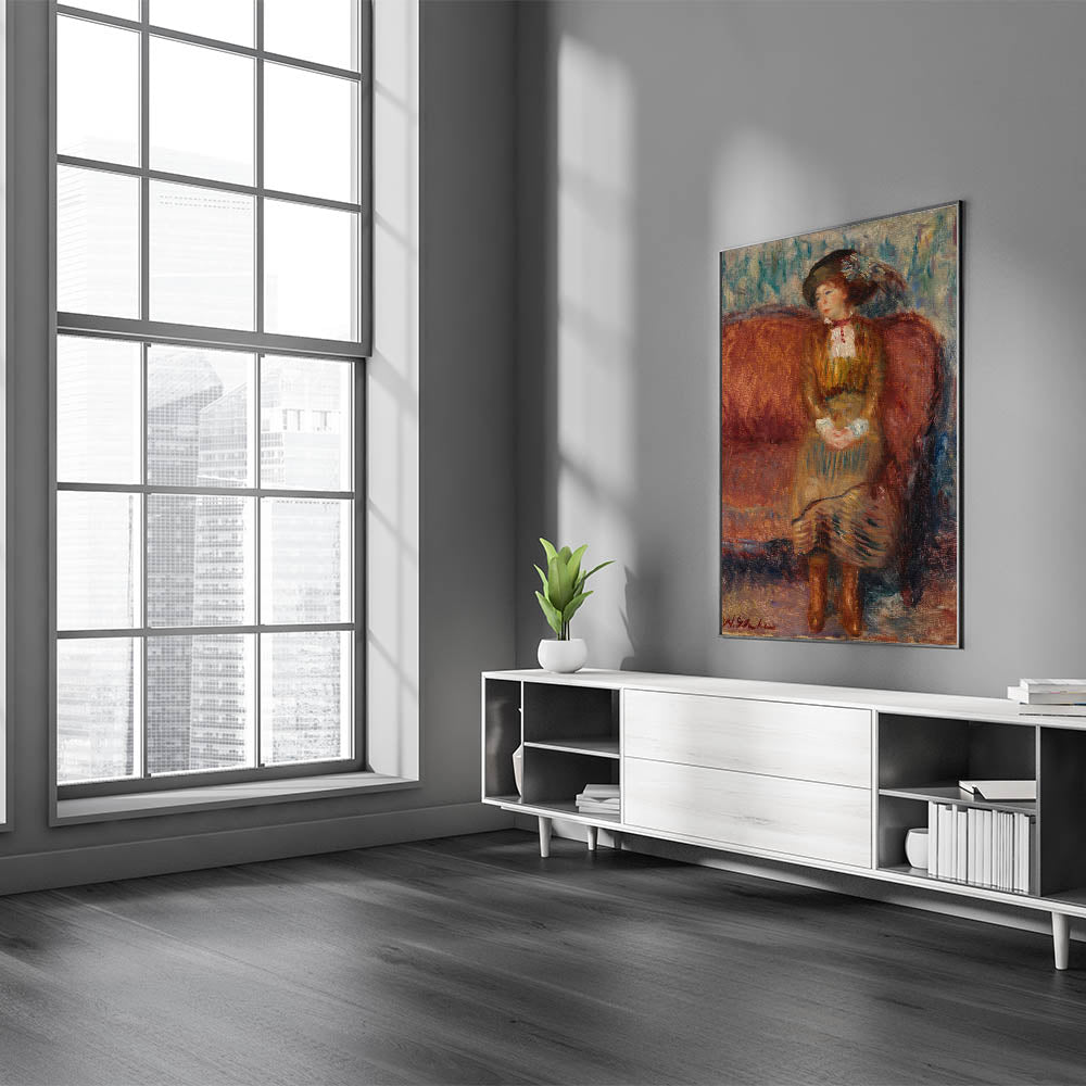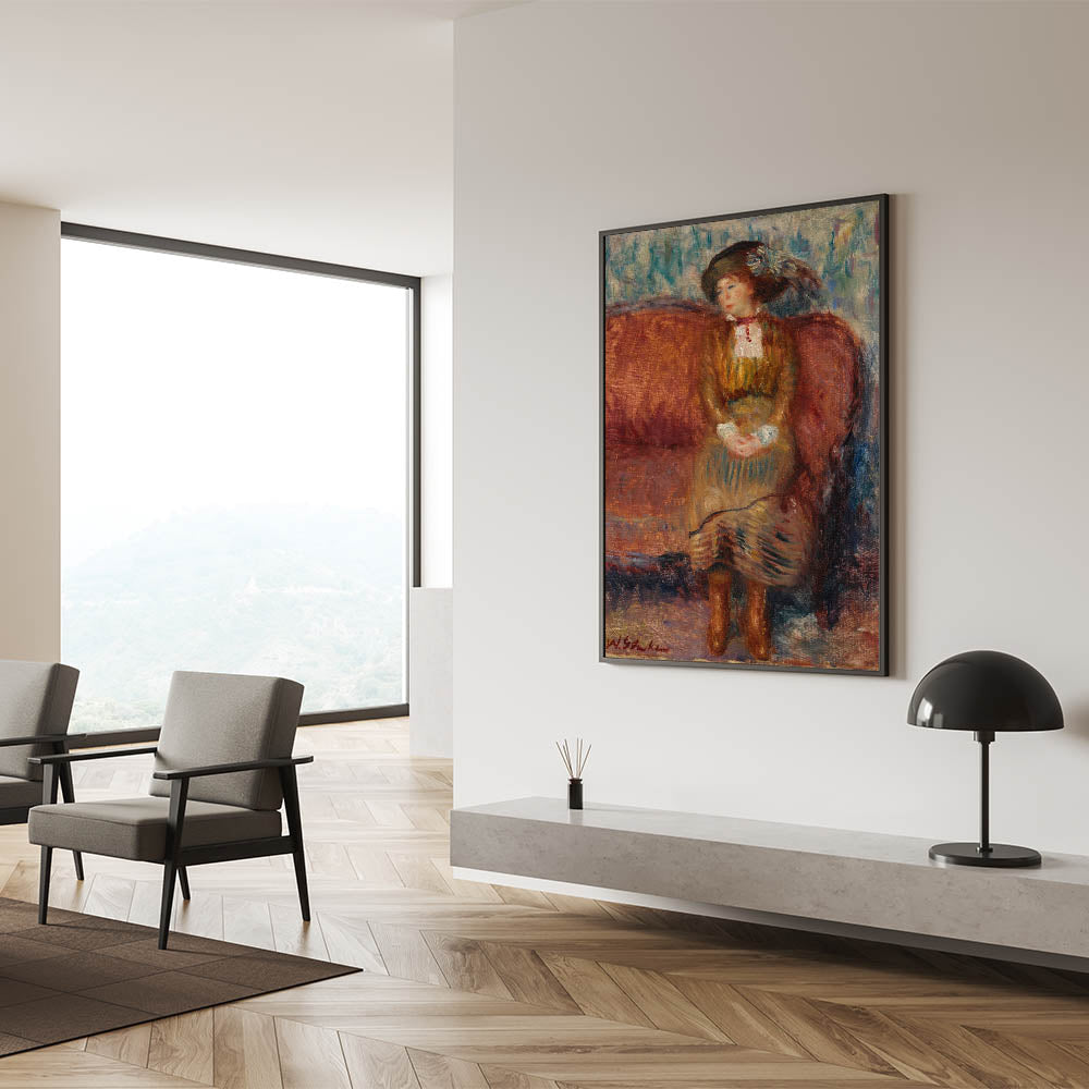 Modern Wall Art - Woman Seated on Red Sofa in Vibrant Impressionist Style