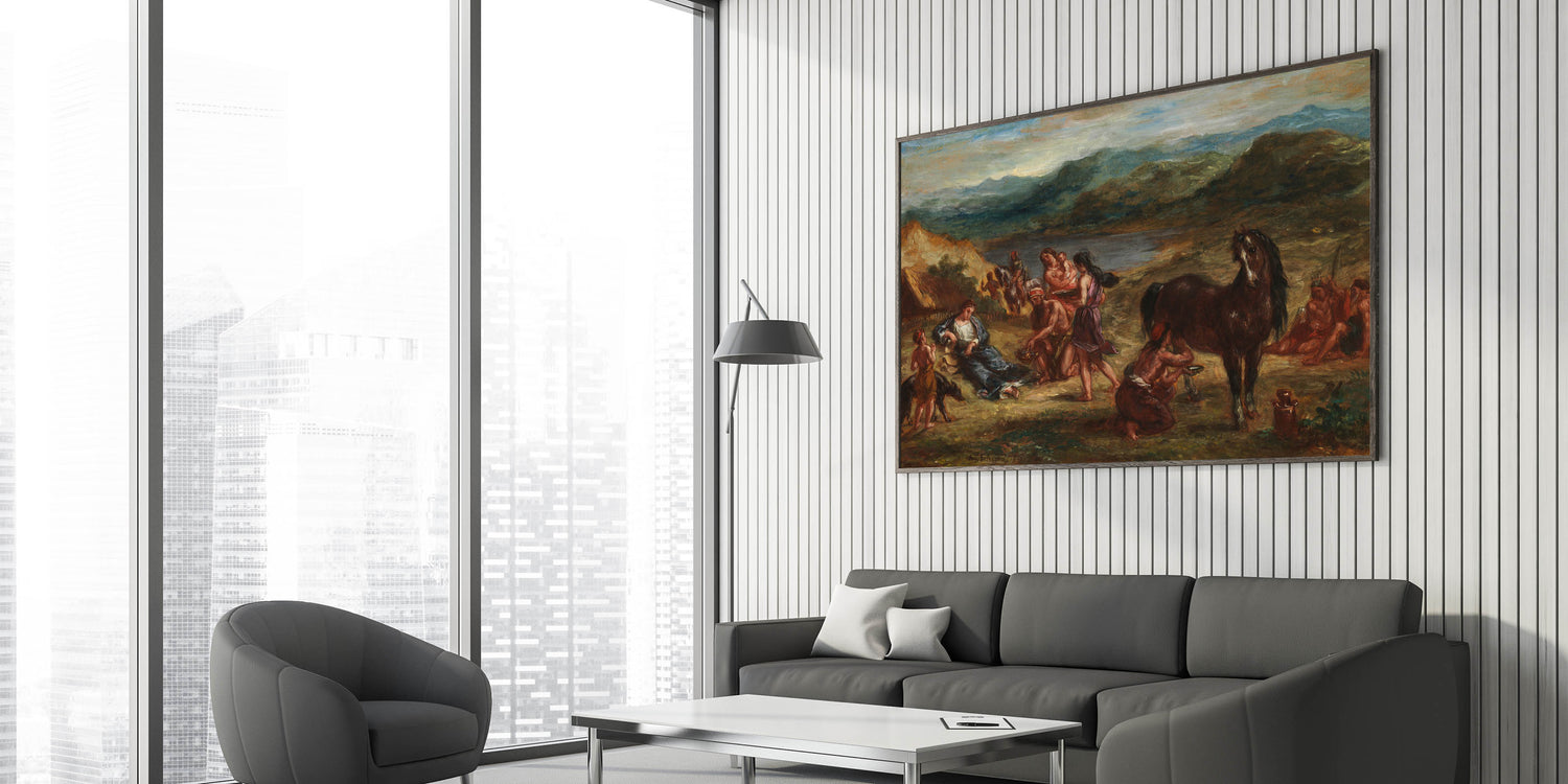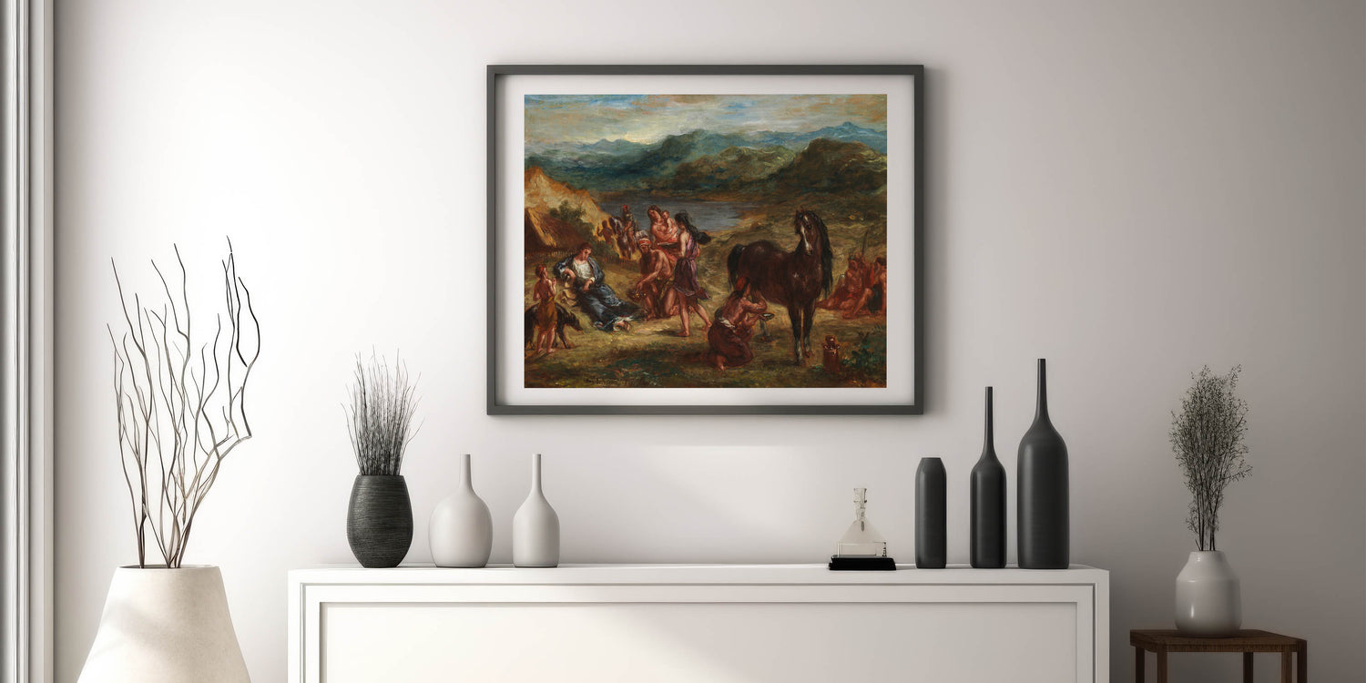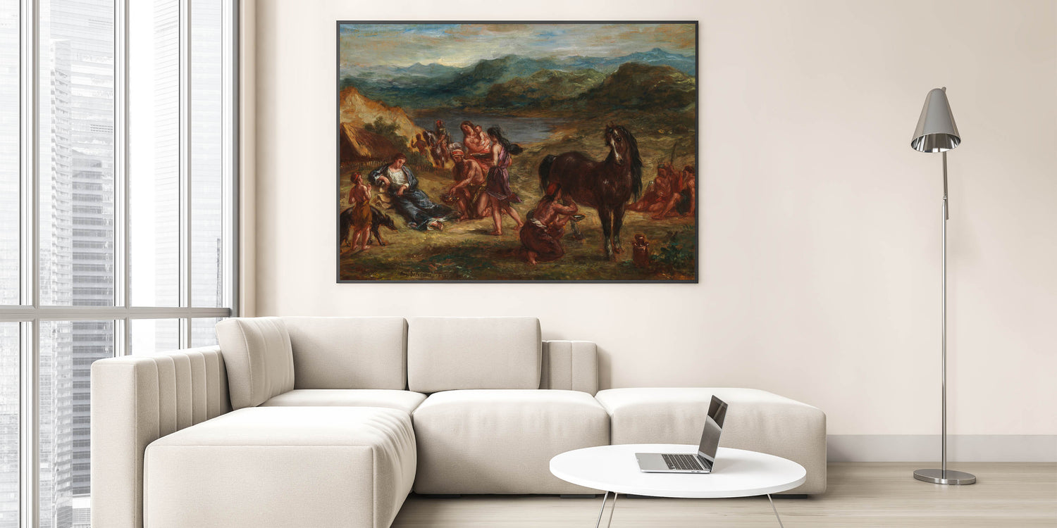 Immerse yourself in the captivating narrative of Ovid Among the Scythians by Eugène Delacroix. This iconic Romanticism art piece depicts the Roman poet Ovid during his exile, surrounded by Scythians in a pastoral landscape. Delacroix masterfully combines vibrant colors and dynamic composition to convey a profound sense of emotion, cultural interaction, and historical significance.