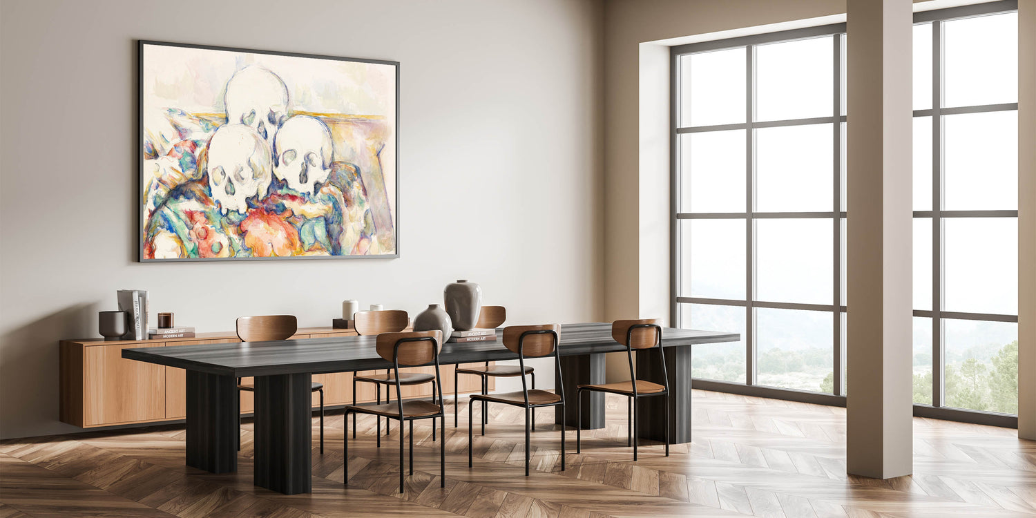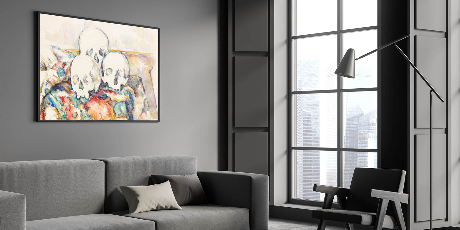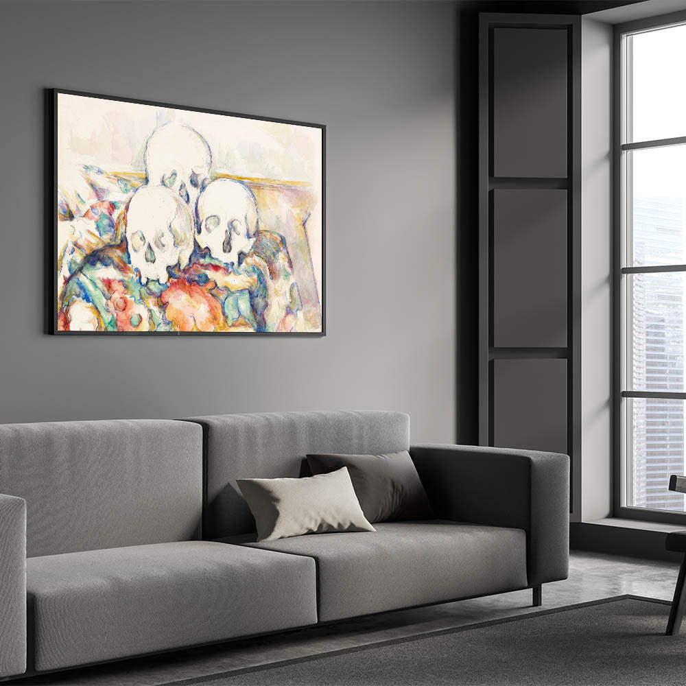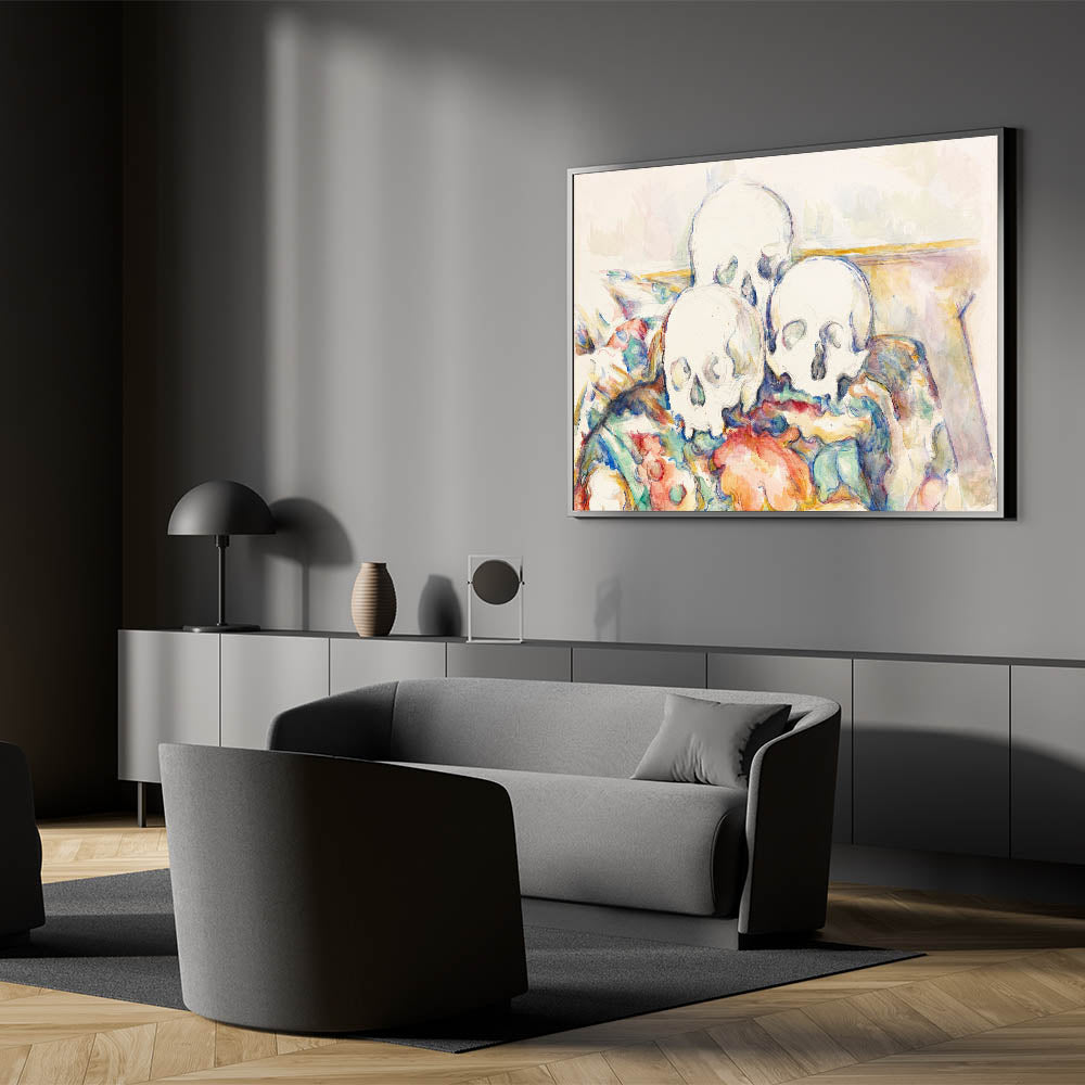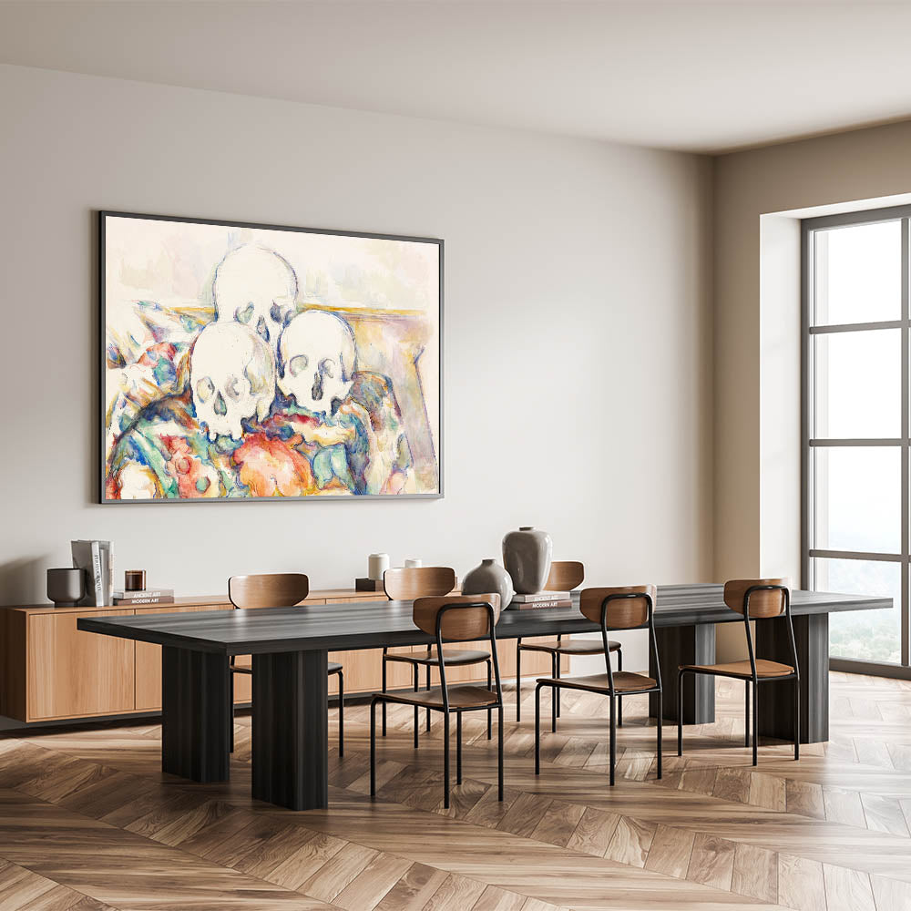 "The Three Skulls" is more than a still-life painting; it is a profound statement on life and impermanence. This timeless artwork is a captivating addition to any collection, blending Cézanne’s artistry with philosophical reflection.