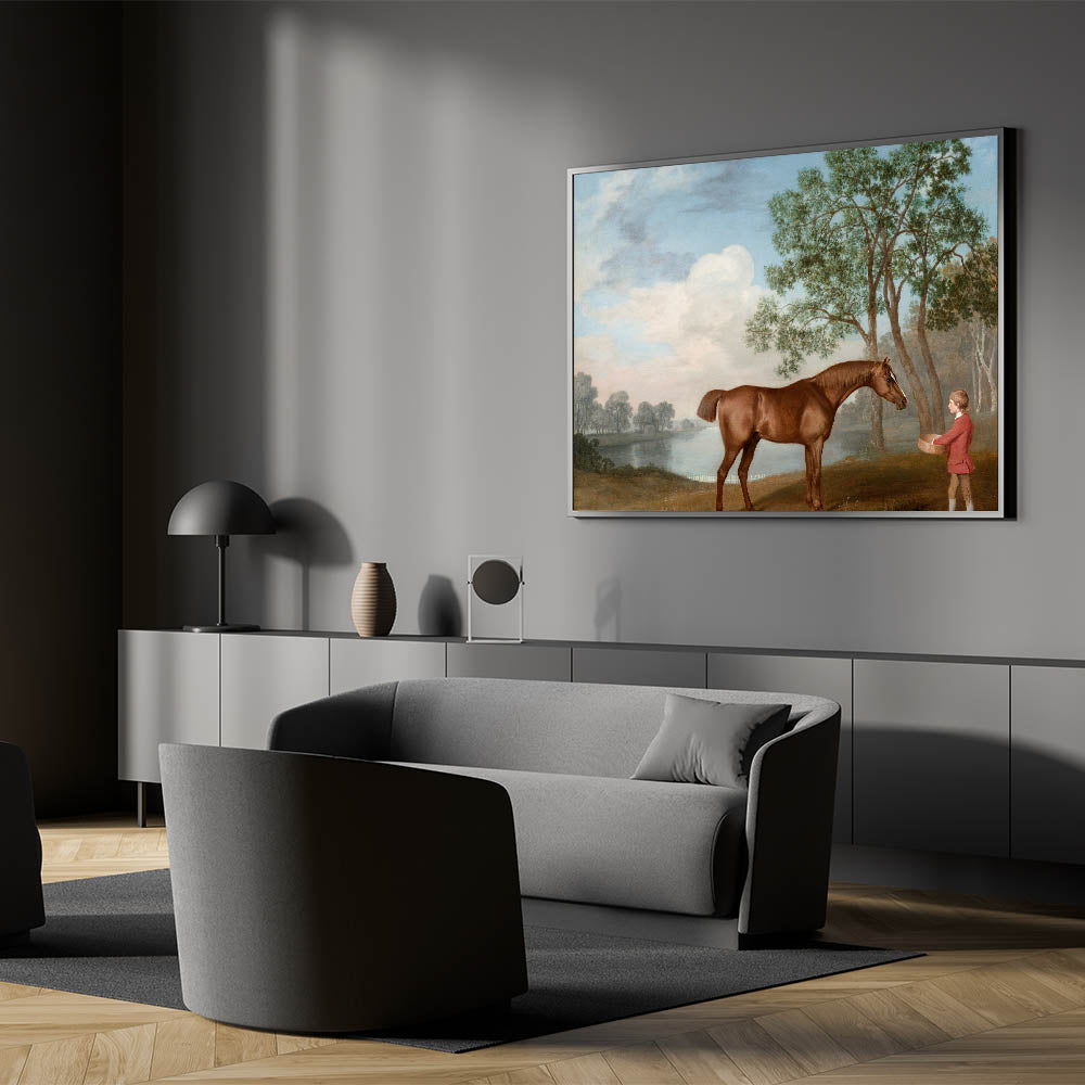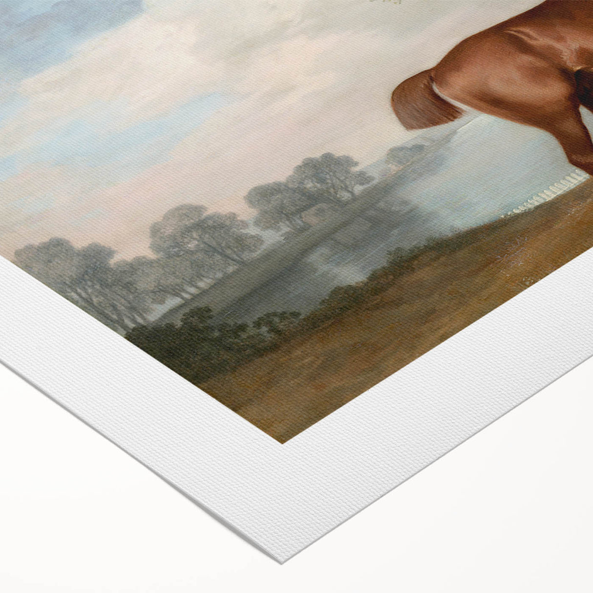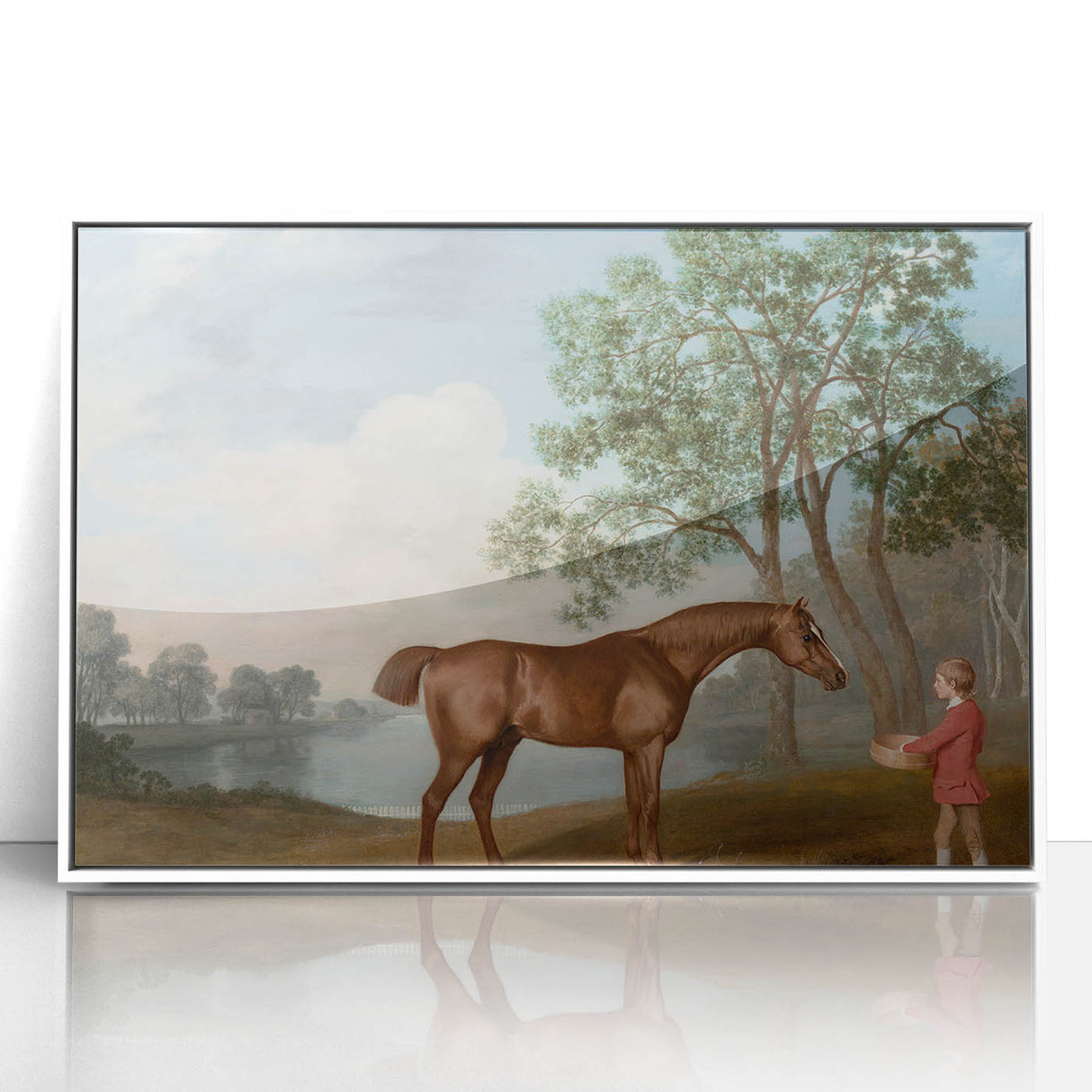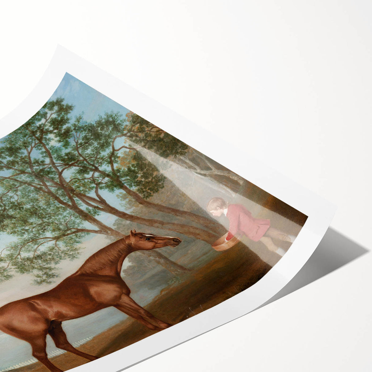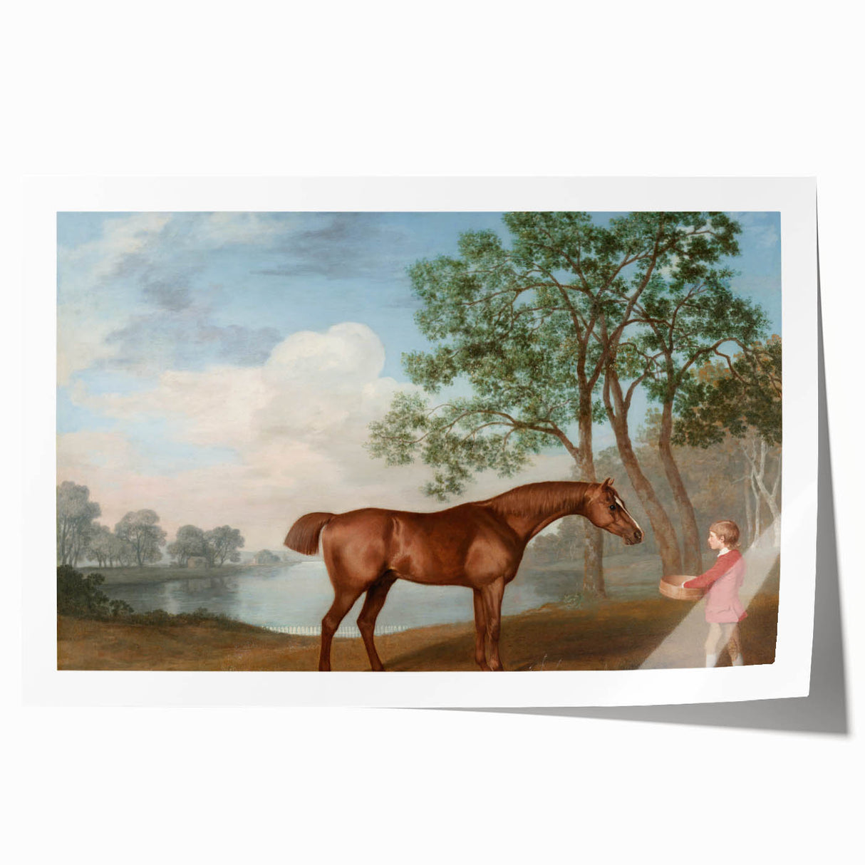 Celebrate the timeless elegance of Pumpkin with a Stable Lad (1774) by George Stubbs, a masterful work from the Romantic era. This serene composition captures a young stable boy feeding a chestnut horse named Pumpkin in a tranquil pastoral setting. Stubbs’ meticulous attention to detail brings the scene to life, showcasing the lifelike musculature of the horse and the gentle interaction between boy and animal.