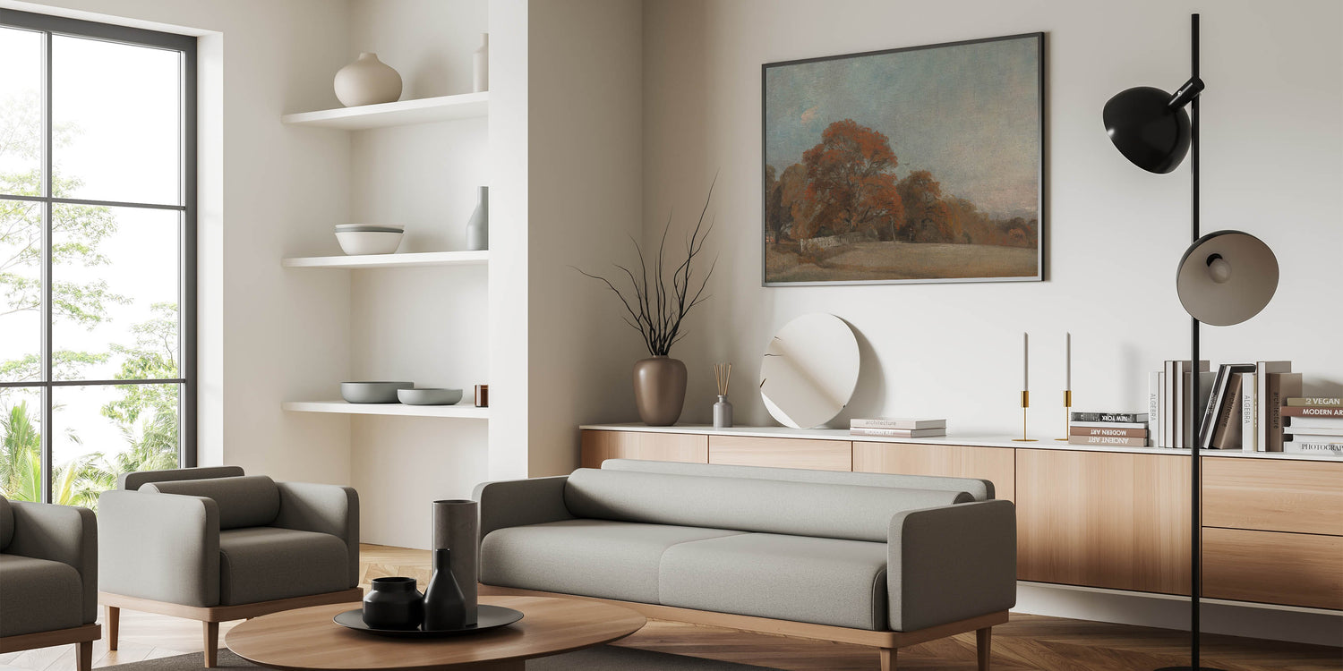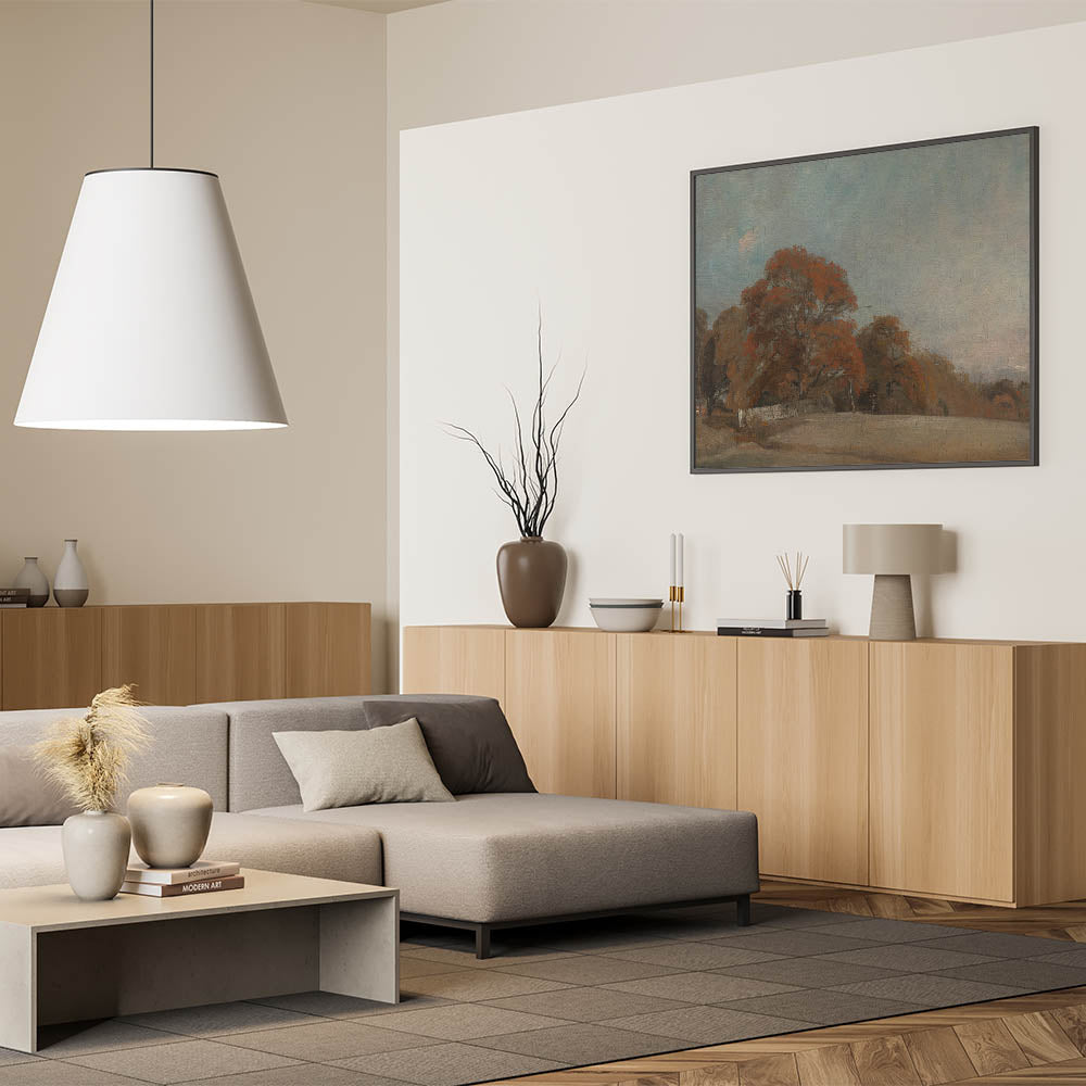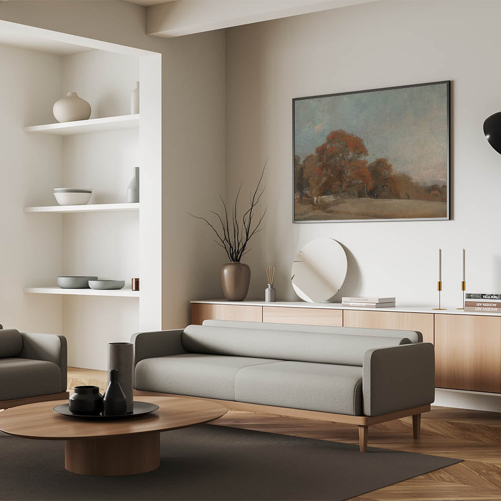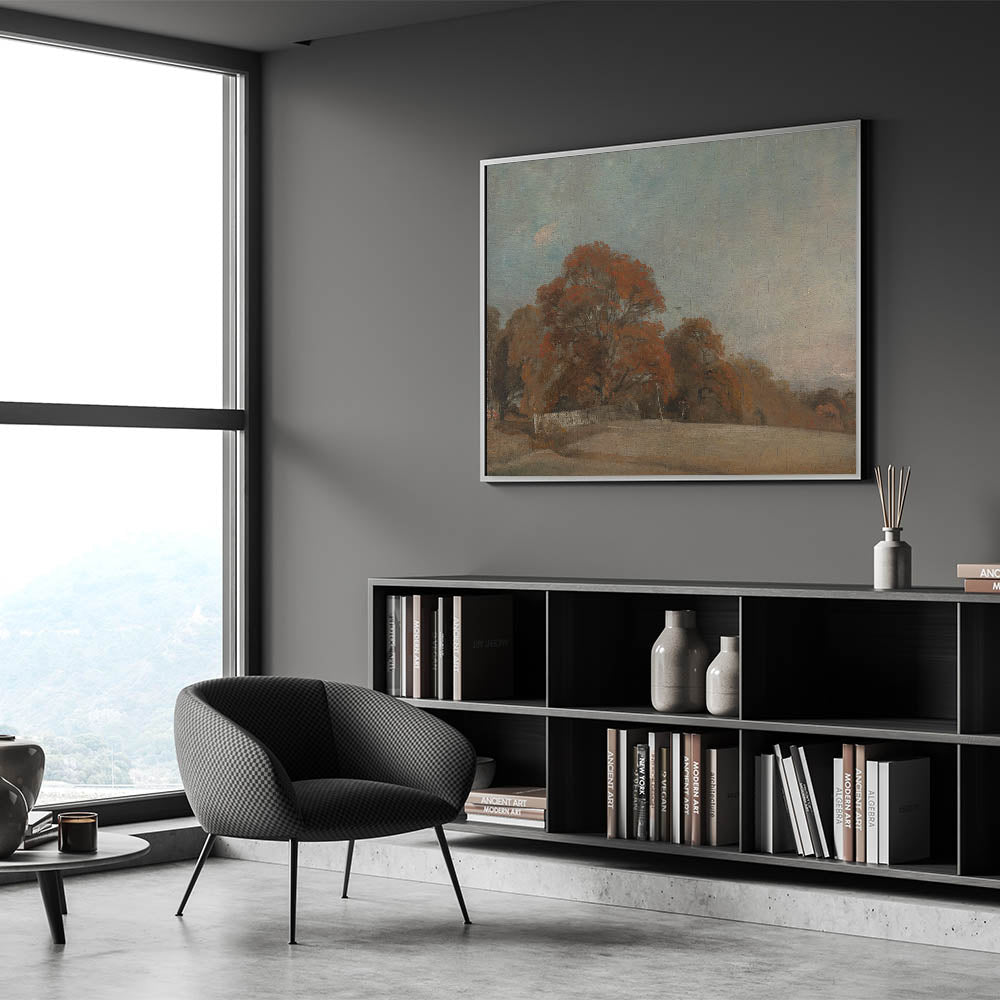 - Timeless Composition: Depicts an idyllic autumn landscape with vibrant trees and an open field under a serene sky.