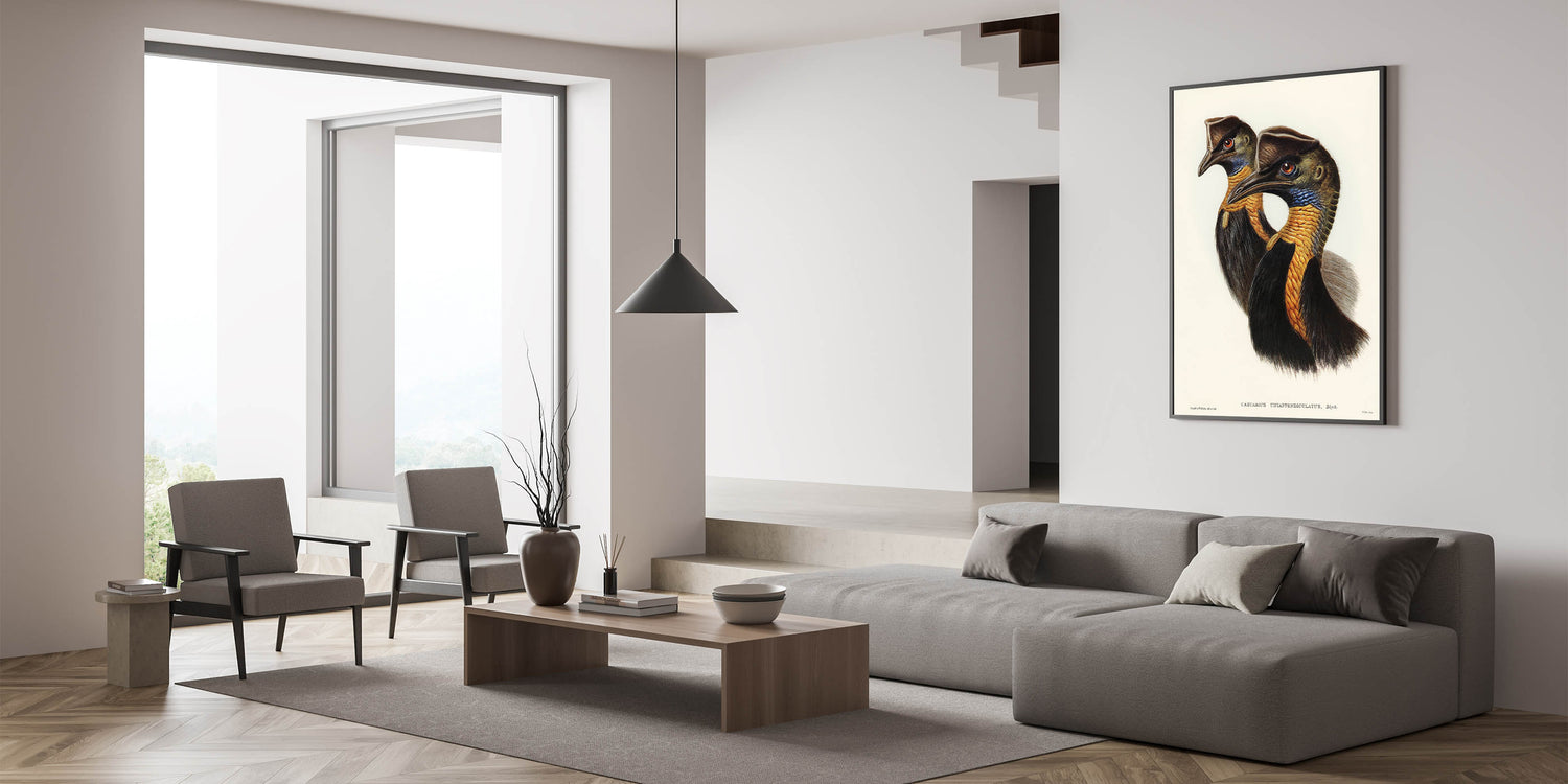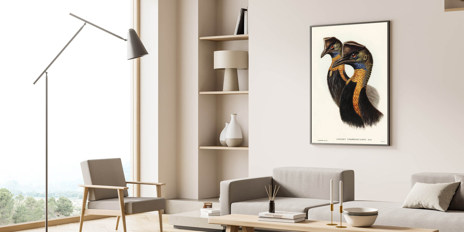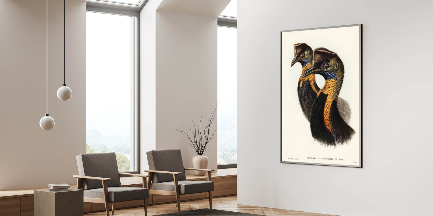 Celebrate the elegance of Romanticism and natural history with One-Carunculated Cassowary illustrated by Elizabeth Gould. This detailed artwork captures the exotic beauty of the cassowary, emphasizing its striking plumage and regal profile. The vibrant colors and meticulous attention to detail reflect the Romanticism style wall art's fascination with the natural world and its untamed elegance.