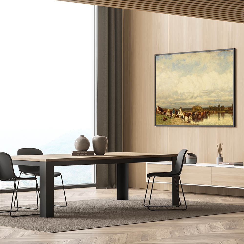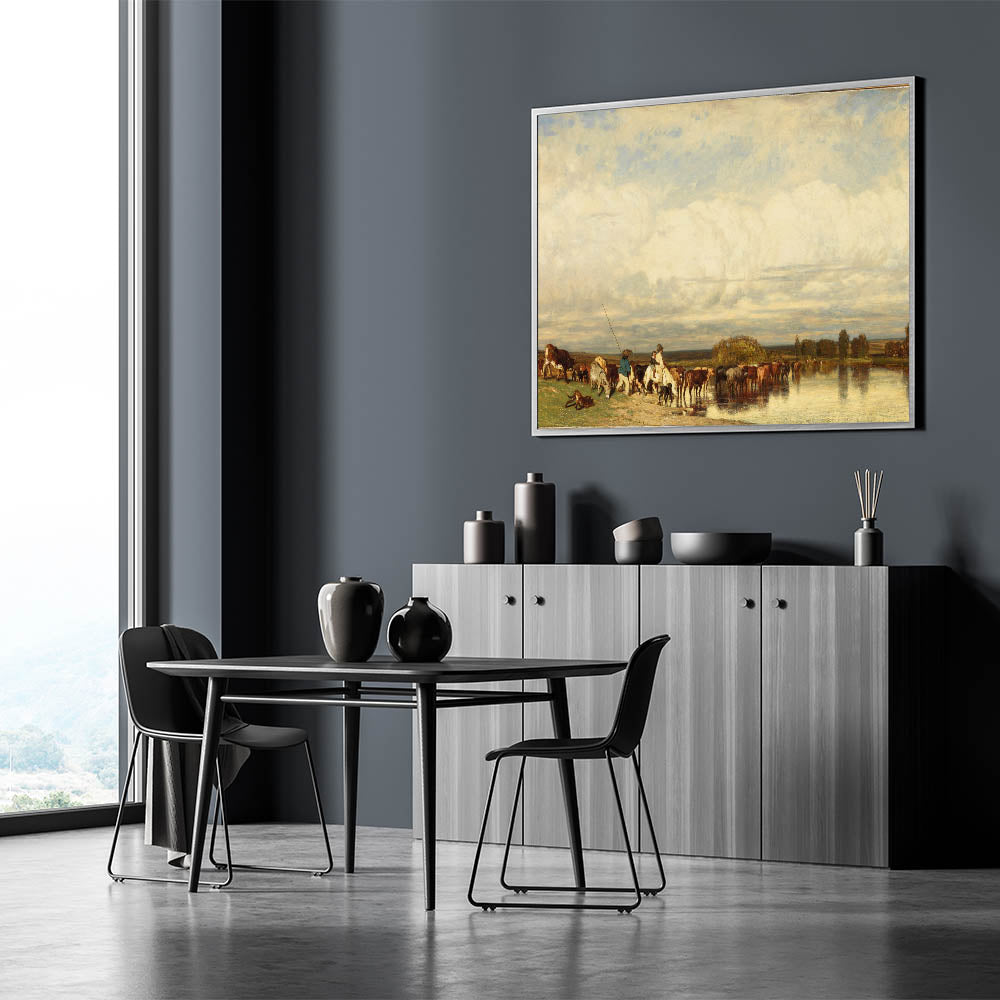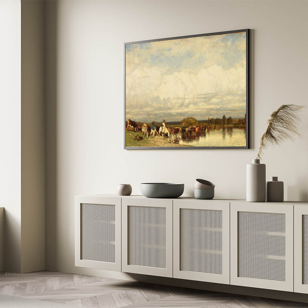 Experience the serene beauty of Romanticism with Cows Crossing a Ford by Jules Dupré, a masterful depiction of nature and rural life. This artwork showcases a tranquil scene of cattle wading through a river, accompanied by herders on horseback under a vast, soft-lit sky. The piece reflects the Romanticism style wall art with its emphasis on the emotional connection between humans, animals, and nature's grandeur.