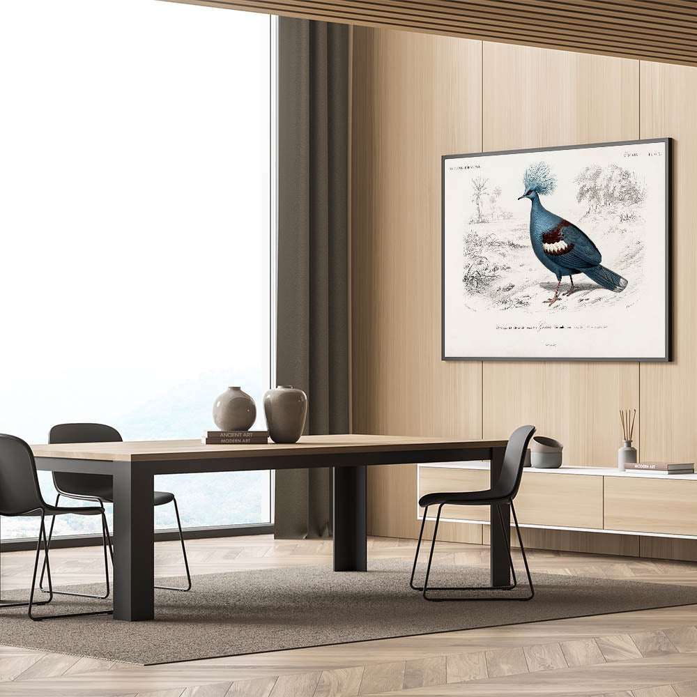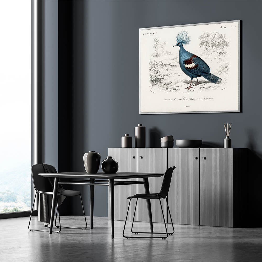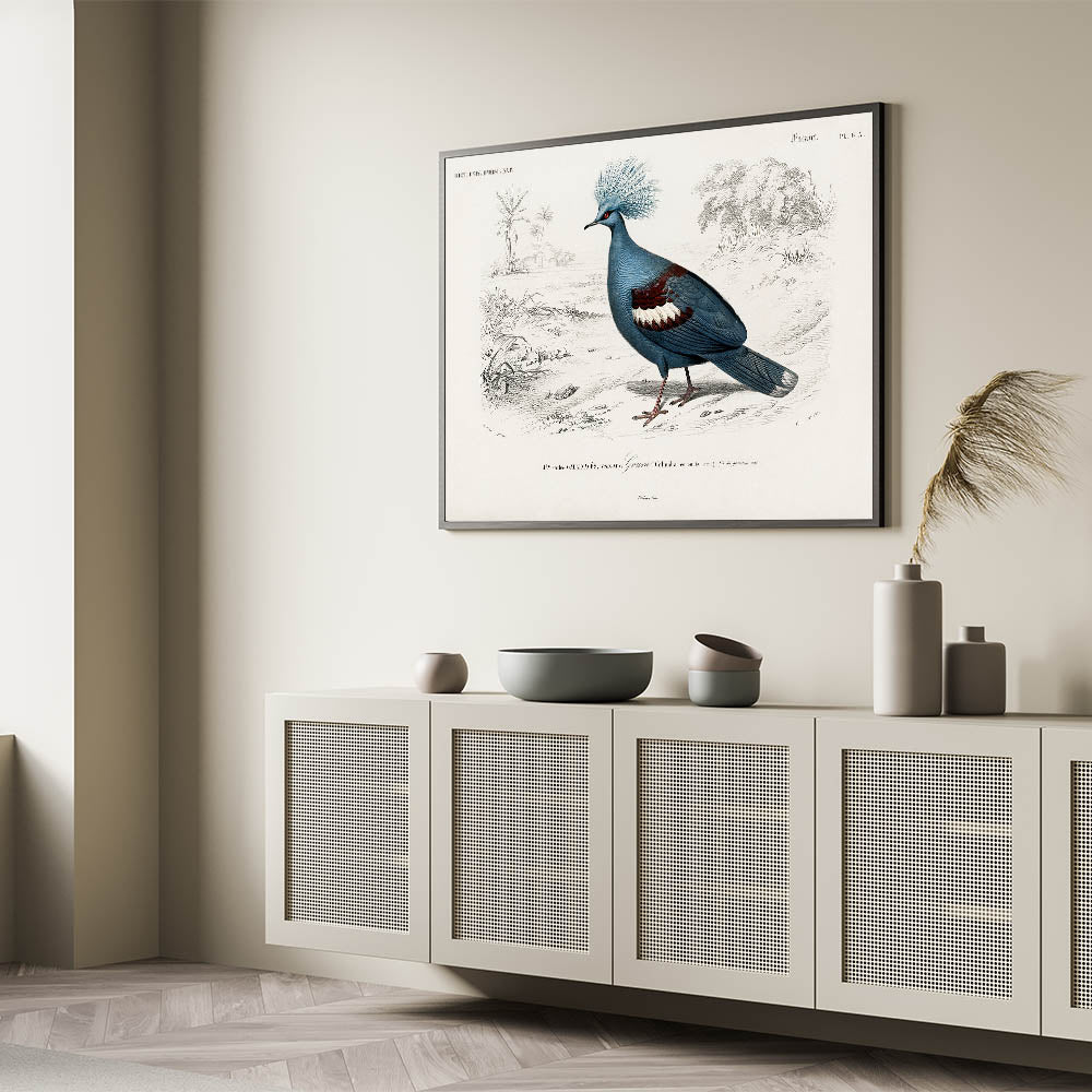 This detailed illustration of the Crowned Pigeon (Goura), created by Charles Dessalines D'Orbigny, showcases the perfect harmony of scientific accuracy and artistic elegance that defines Romanticism art. With its regal blue feathers, intricate crown, and vibrant red eye, this artwork captures the beauty and majesty of this exotic bird. The soft, natural background further enhances its timeless appeal, making it an exquisite piece for any art collection or decor setting.
