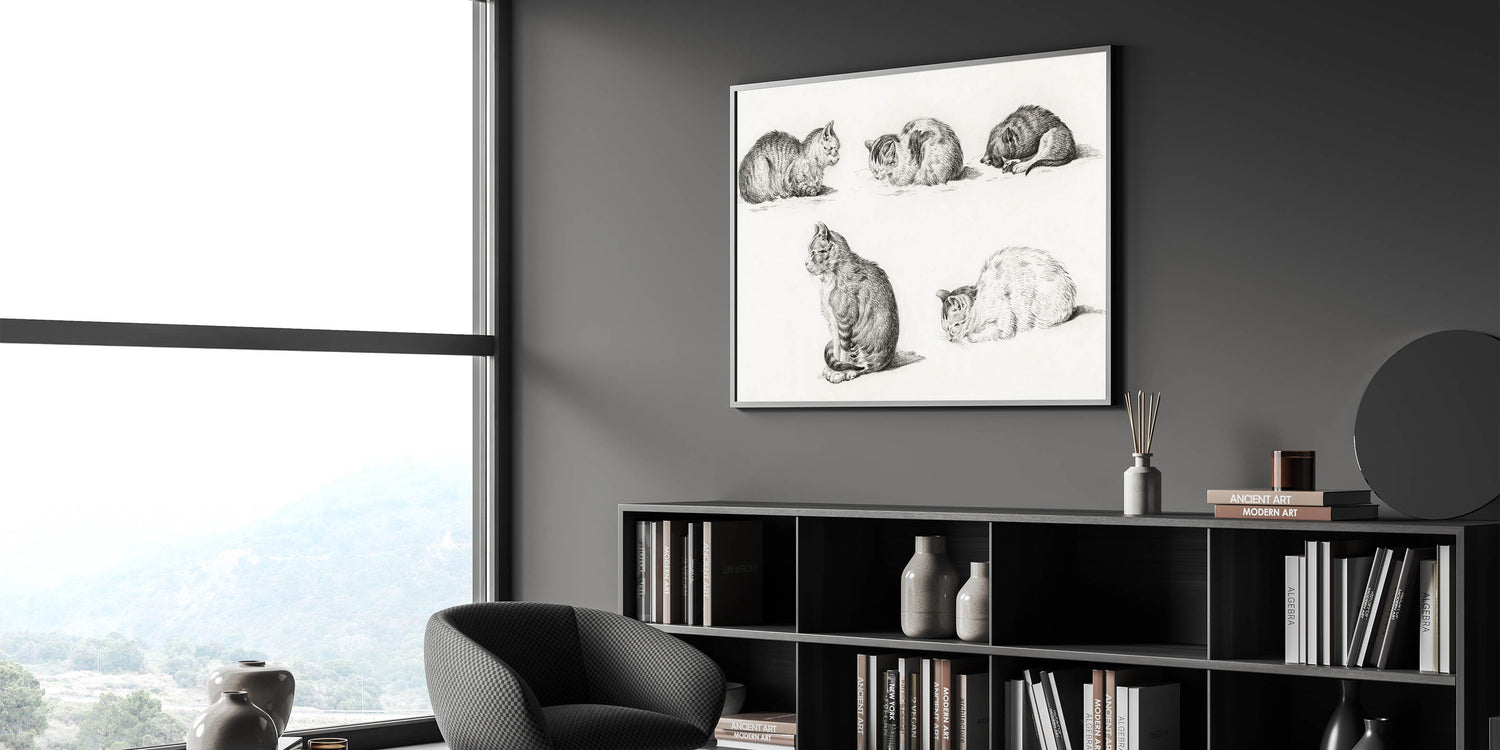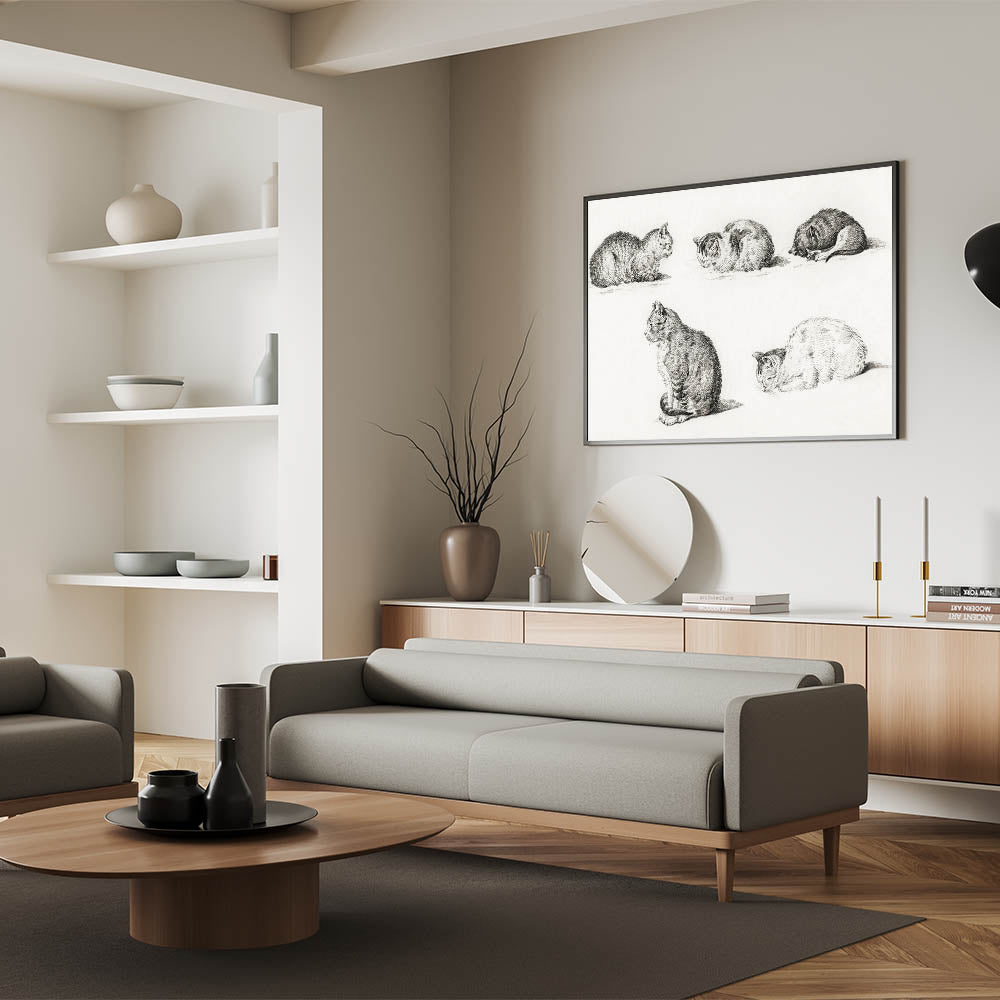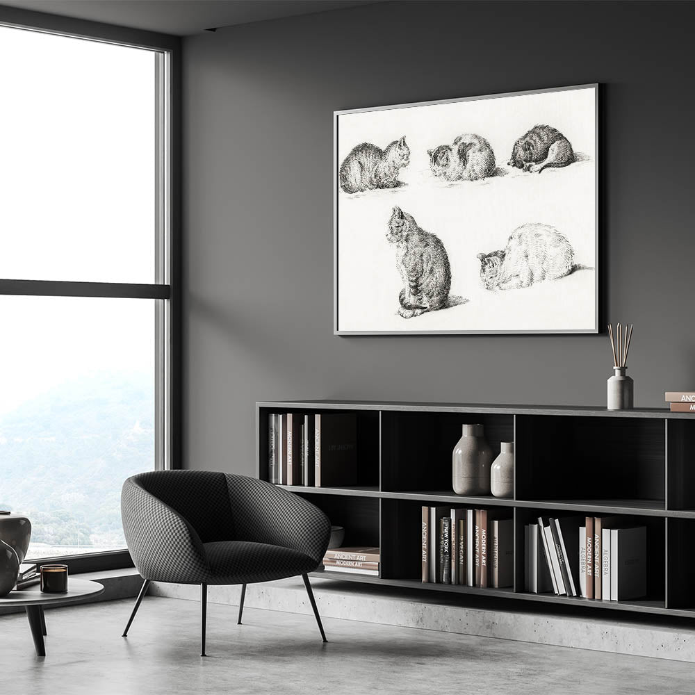 Delight in the charm of Jean Bernard's "Five Studies of Cats," a masterpiece that captures the serene beauty and natural grace of cats through the Romanticism lens. This detailed pencil illustration features five poses of resting cats, each rendered with exquisite precision and soft textures. The simplicity and elegance of this piece evoke a timeless sense of calm, making it a perfect addition to any art collection or interior decor.