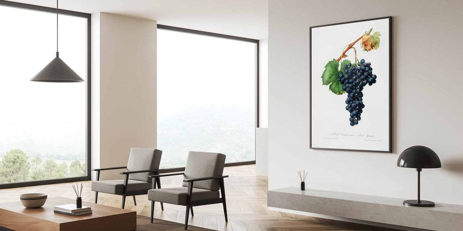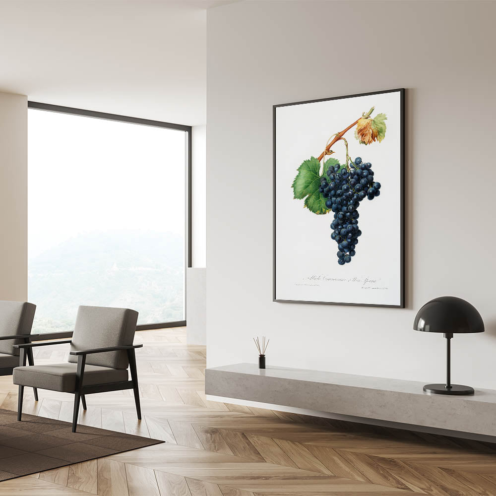 This exquisite botanical artwork showcases the Grape Spanna (Vitis vinifera Pedemontana), a timeless symbol of nature's bounty. Rendered with meticulous attention to detail, the illustration captures the richness of the deep blue grapes and the vibrant green leaves, blending artistic elegance with scientific precision. This piece embodies the Romanticism style’s admiration for natural beauty and botanical art, making it a perfect addition to any home or workspace.