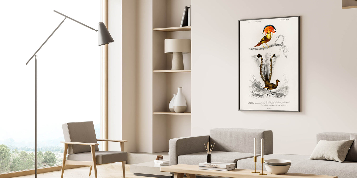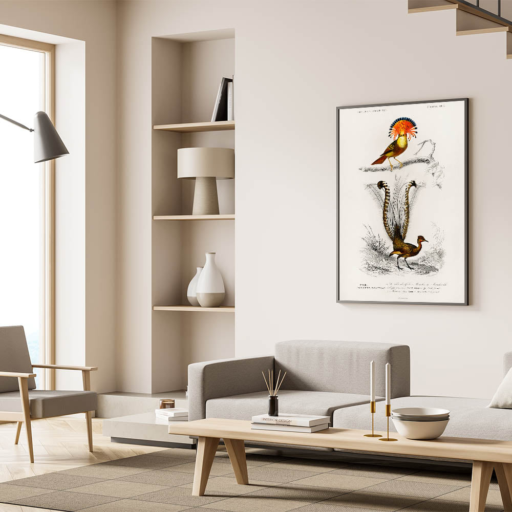 Enhance your home with this captivating artwork inspired by Romanticism, showcasing a detailed and elegant illustration of exotic birds. This exquisite piece reflects the Romantic era’s appreciation for nature, beauty, and intricate detail, making it a perfect addition to any art collection.