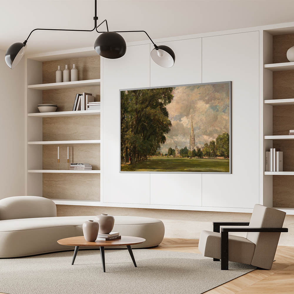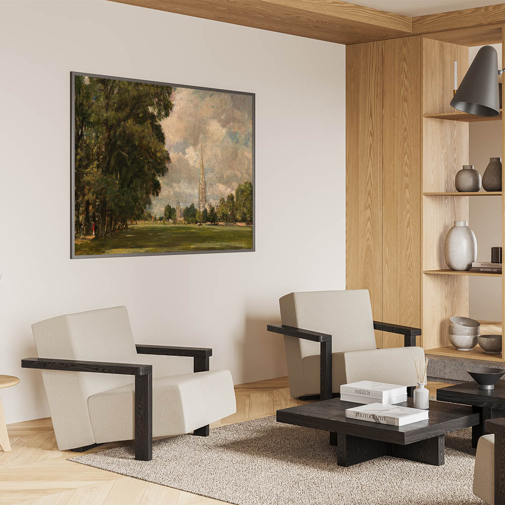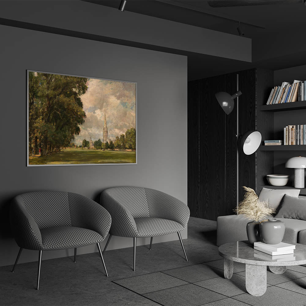 Step into the serene beauty of the English countryside with Salisbury Cathedral from Lower Marsh Close (1820) by John Constable. This iconic Romantic-era painting captures the cathedral’s towering spire as it rises gracefully above a lush green meadow, framed by a rich canopy of trees under a moody sky. Constable’s masterful depiction of light, texture, and natural beauty makes this piece a quintessential example of Romanticism style wall art.
