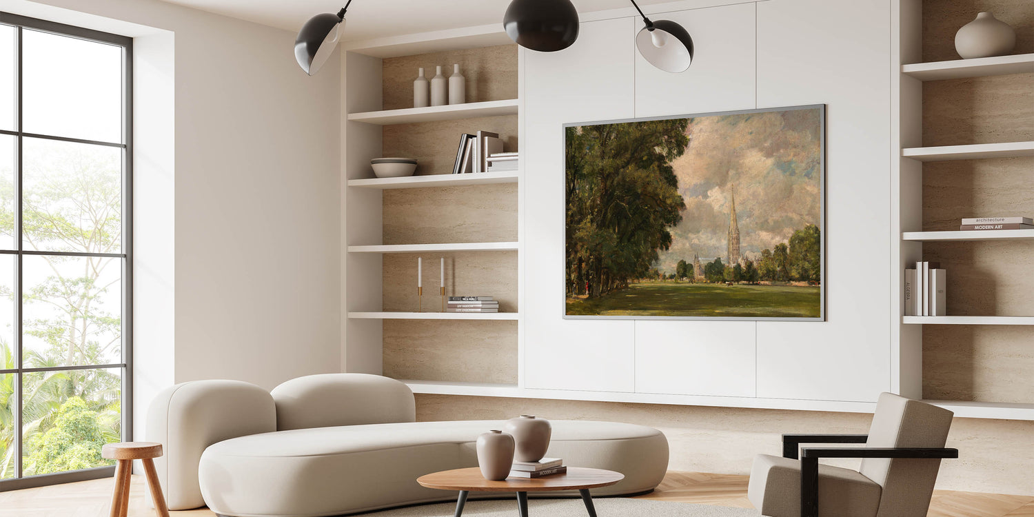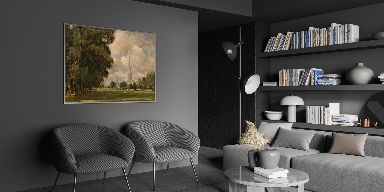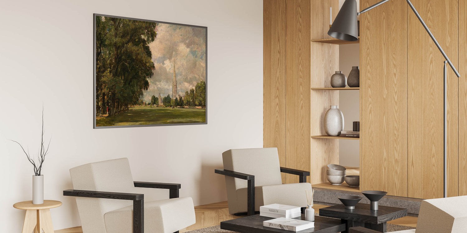 Step into the serene beauty of the English countryside with Salisbury Cathedral from Lower Marsh Close (1820) by John Constable. This iconic Romantic-era painting captures the cathedral’s towering spire as it rises gracefully above a lush green meadow, framed by a rich canopy of trees under a moody sky. Constable’s masterful depiction of light, texture, and natural beauty makes this piece a quintessential example of Romanticism style wall art.