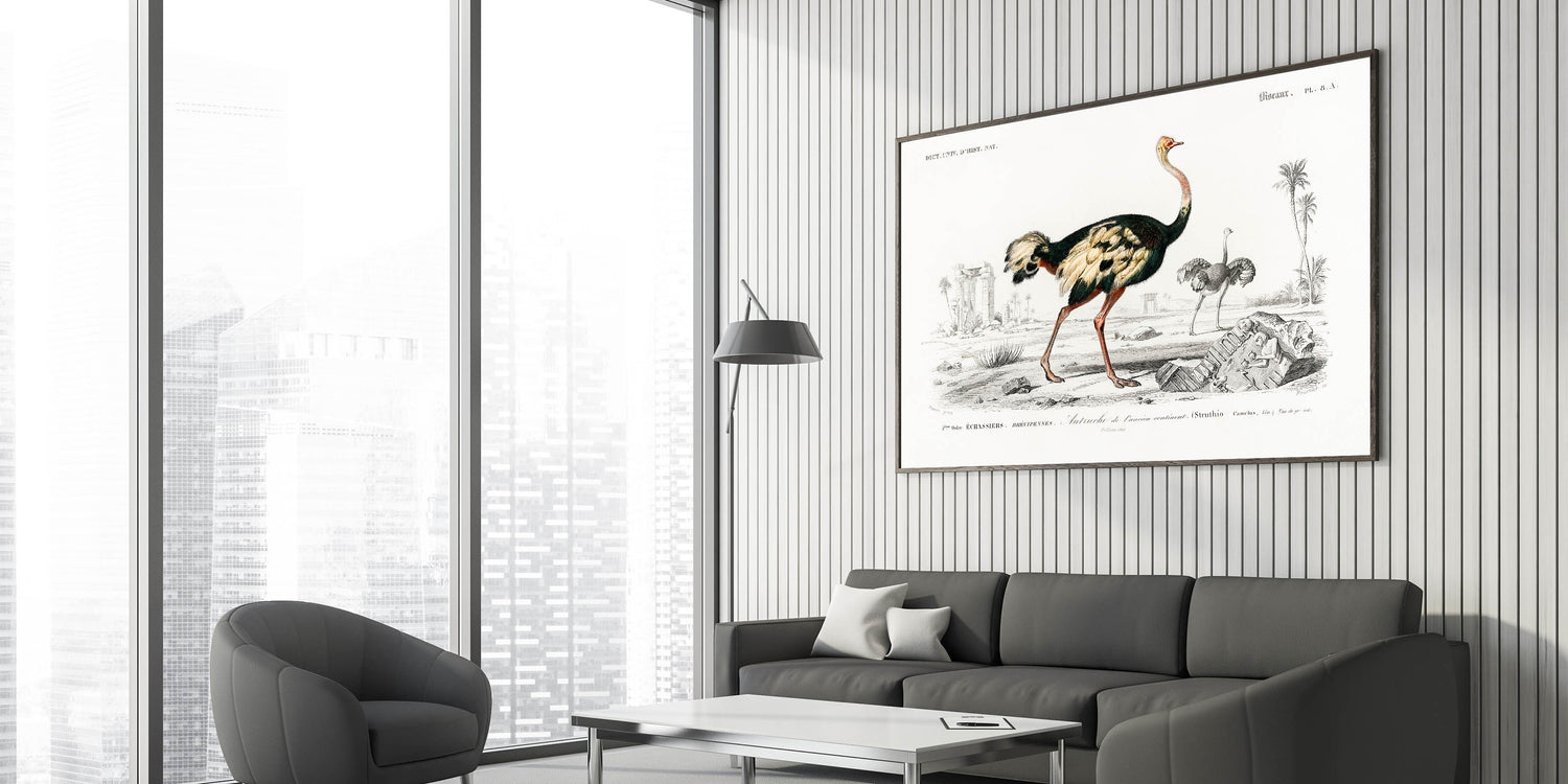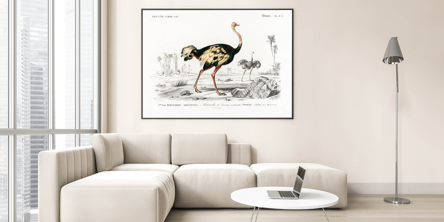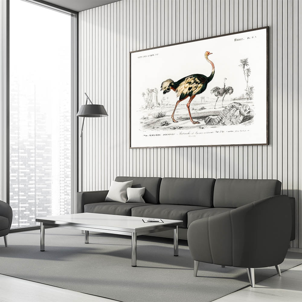 This classic art of the Romantic era is ideal for nature enthusiasts, history lovers, or those seeking unique, elegant decor. The vibrant tones of the ostrich’s plumage and the subtle details of the background create a visually striking piece that complements a variety of interior styles.