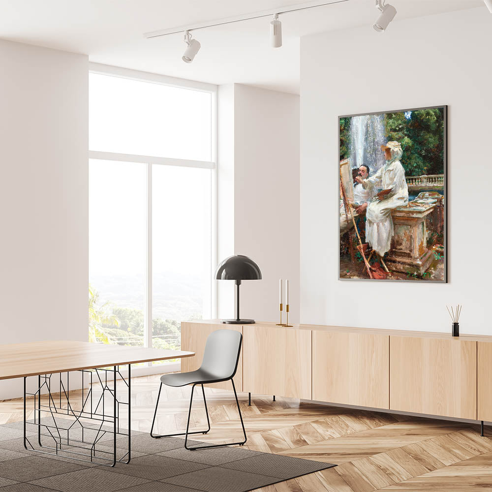 Step into a serene moment of artistic creation with The Fountain, Villa Torlonia, Frascati, Italy (1907) by John Singer Sargent. This beautiful piece of Romanticism style wall art captures an idyllic outdoor scene where nature and artistry blend harmoniously. Featuring an artist and model by a cascading fountain, surrounded by lush greenery and classical architecture, the painting embodies the charm and sophistication of the classic art of the Romantic era.