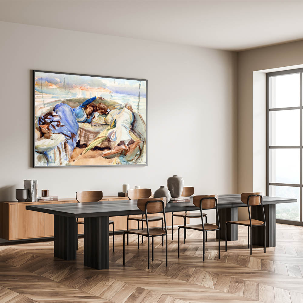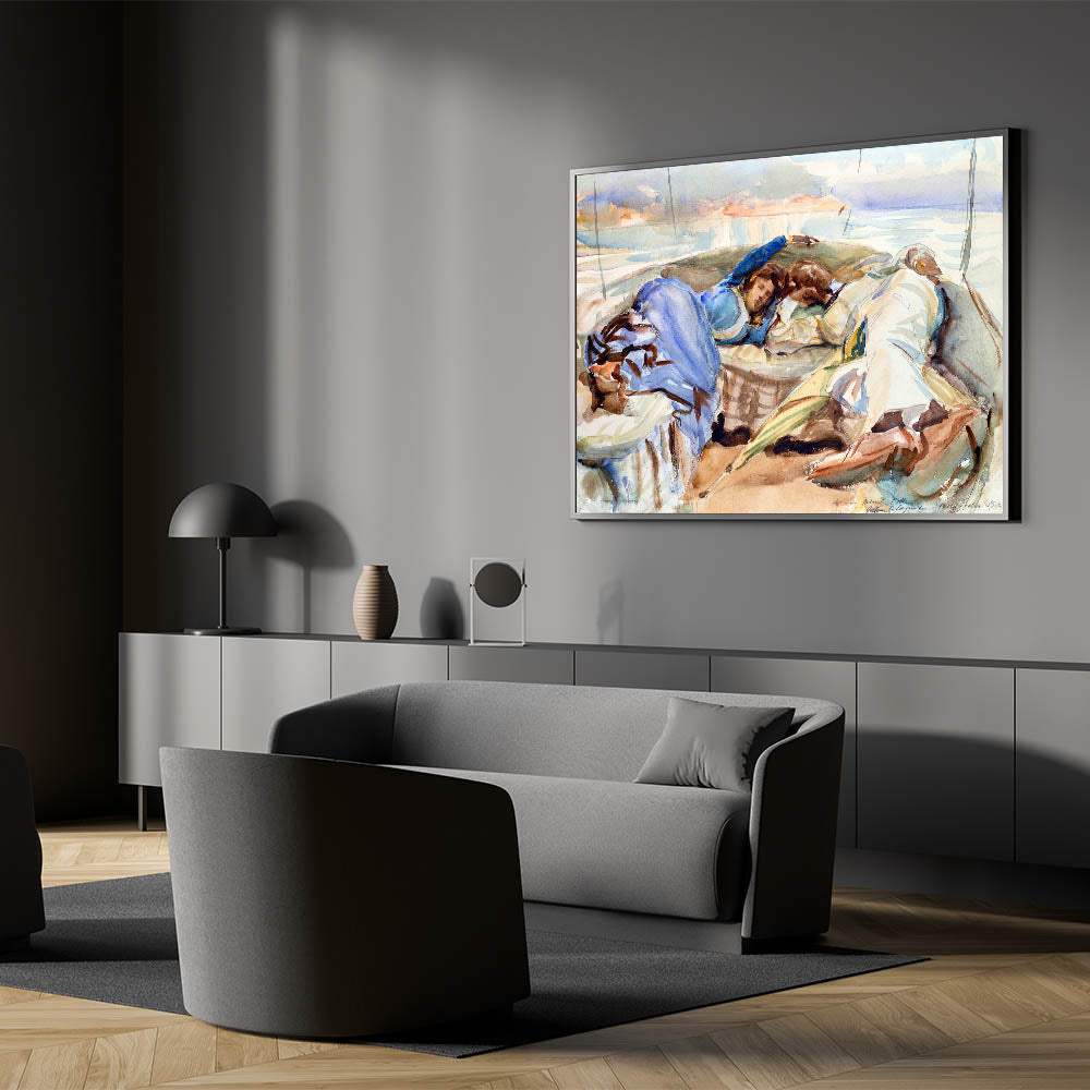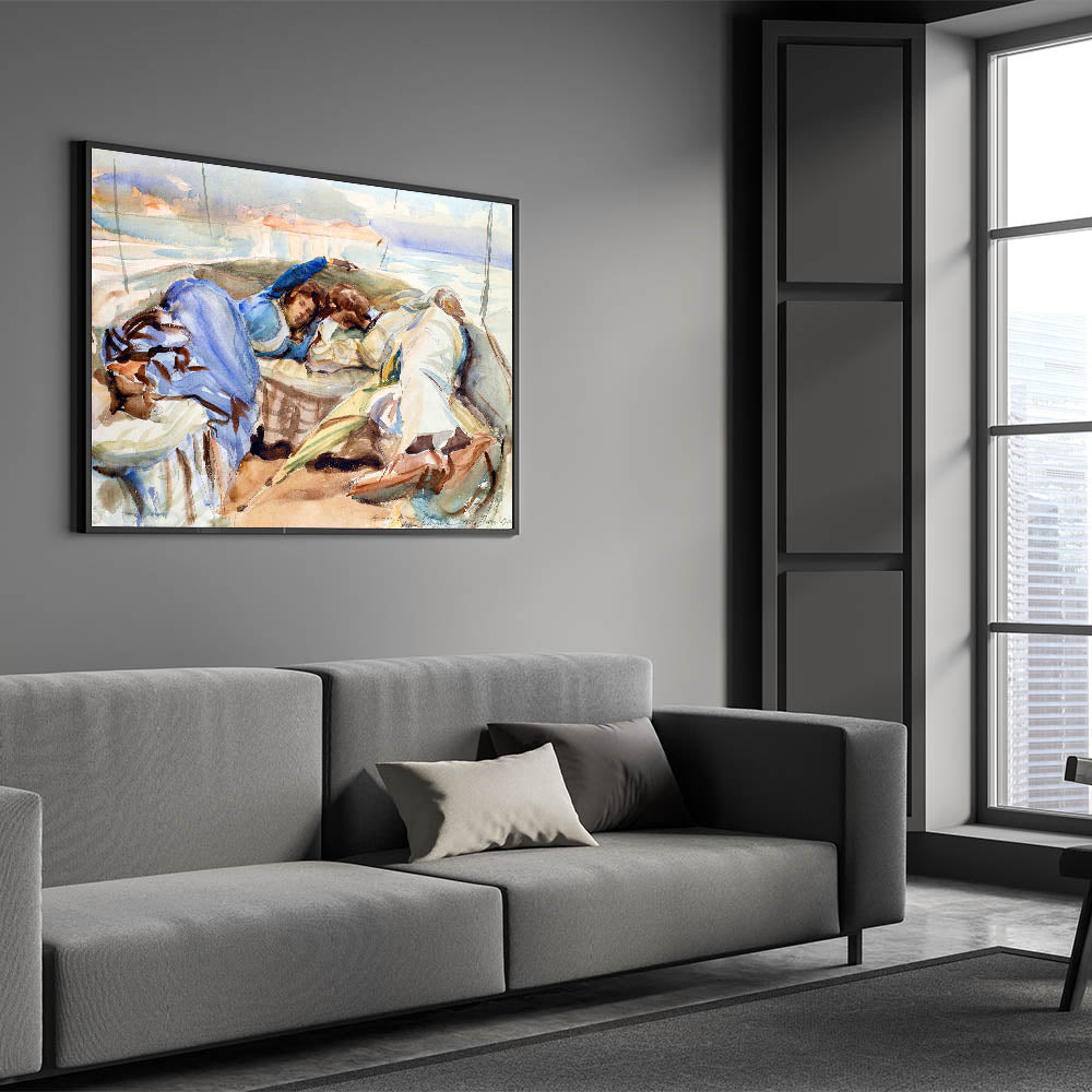 Celebrate the beauty and elegance of Romanticism with Two Figures in a Boat, Isola Bella, Italy (1902) by John Singer Sargent. This dreamy watercolor depicts two resting figures on a boat, surrounded by the tranquility of water and soft sunlight. The fluid brushstrokes and harmonious palette capture the Romanticism style wall art's emphasis on emotion, serenity, and the intimate connection between people and nature.