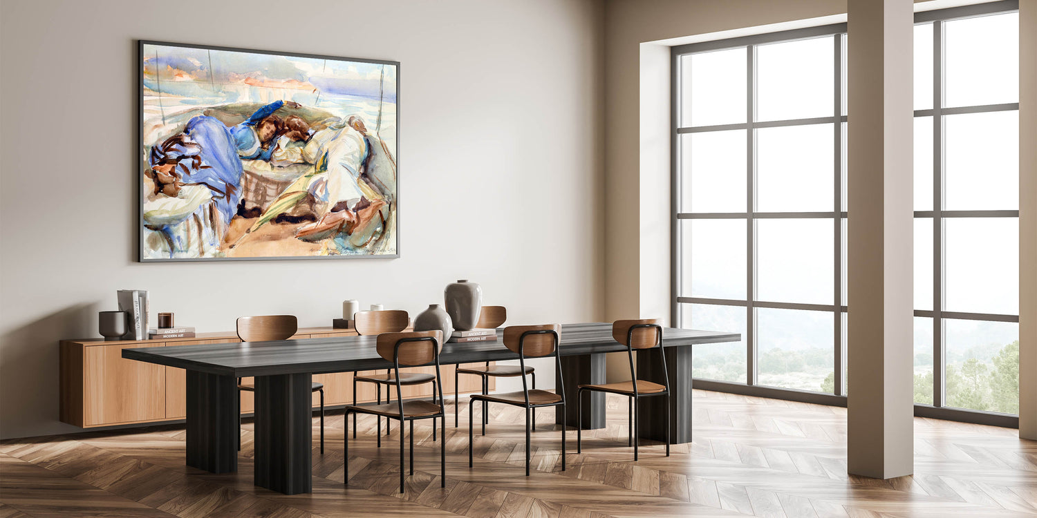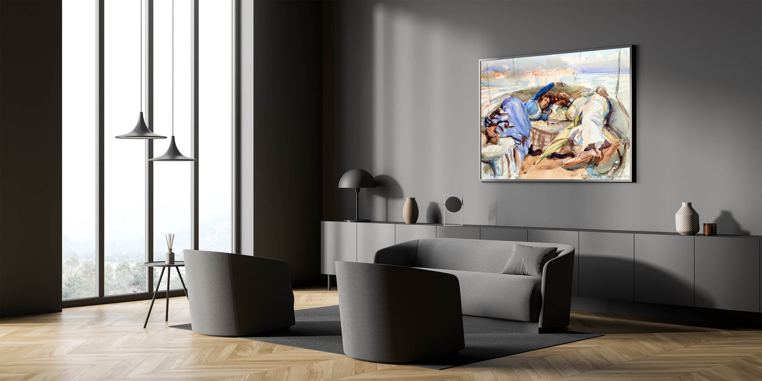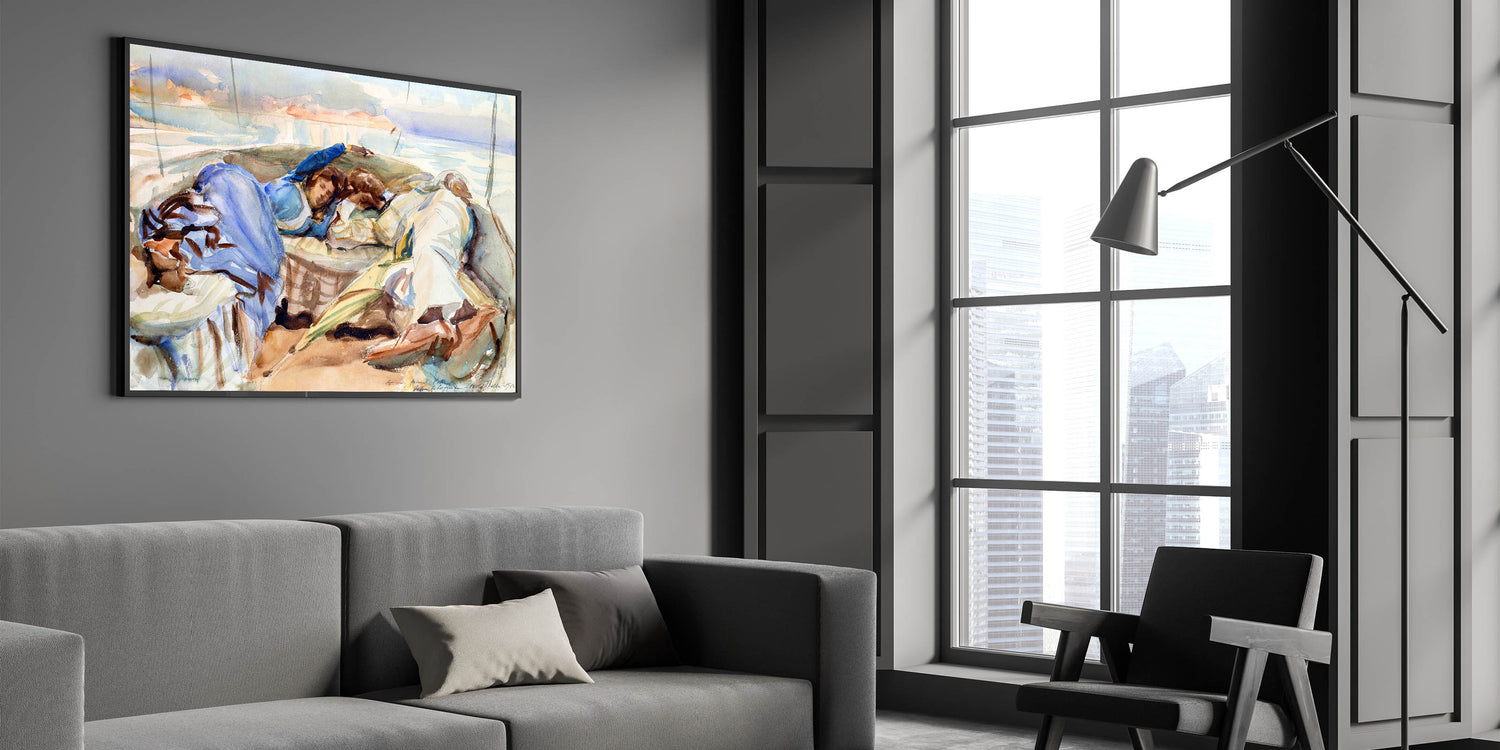 Celebrate the beauty and elegance of Romanticism with Two Figures in a Boat, Isola Bella, Italy (1902) by John Singer Sargent. This dreamy watercolor depicts two resting figures on a boat, surrounded by the tranquility of water and soft sunlight. The fluid brushstrokes and harmonious palette capture the Romanticism style wall art's emphasis on emotion, serenity, and the intimate connection between people and nature.