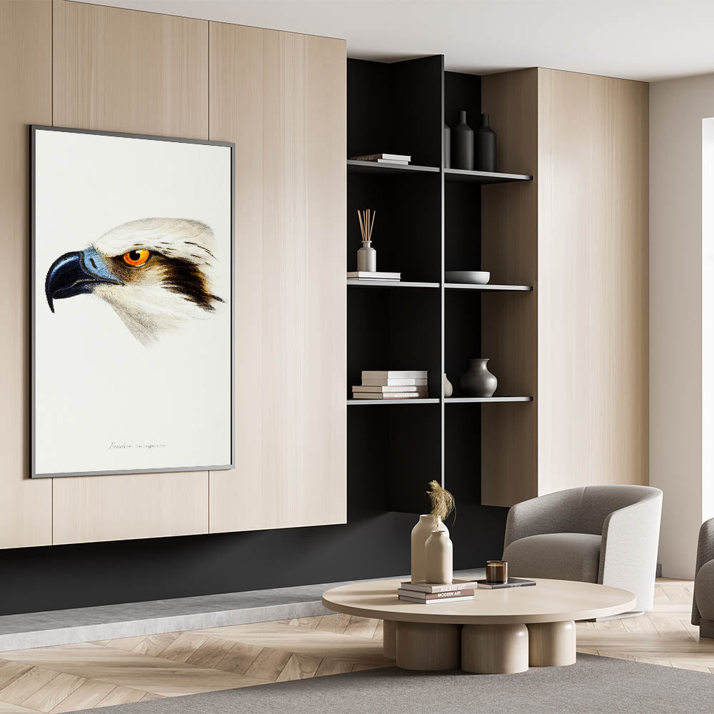 This exquisite illustration of the White-Headed Osprey (Pandion leucocephalus) celebrates the Romanticism art style's fascination with the natural world. Capturing the intensity and grace of this majestic bird, the artwork features striking details, from the piercing orange eye to the textured feathers and bold beak. This piece reflects the timeless elegance of Romantic-era wildlife studies, making it an ideal addition to your art collection or home decor.