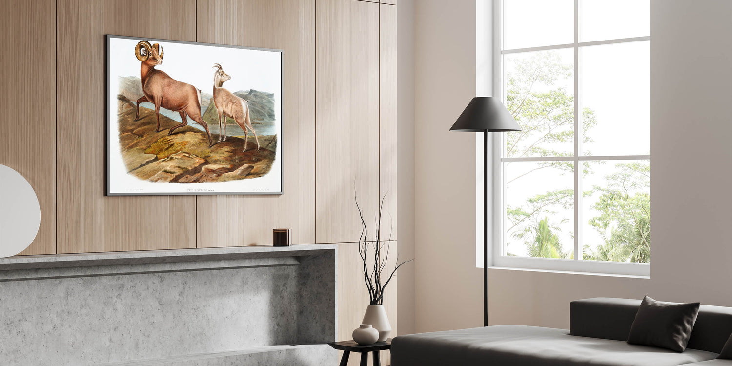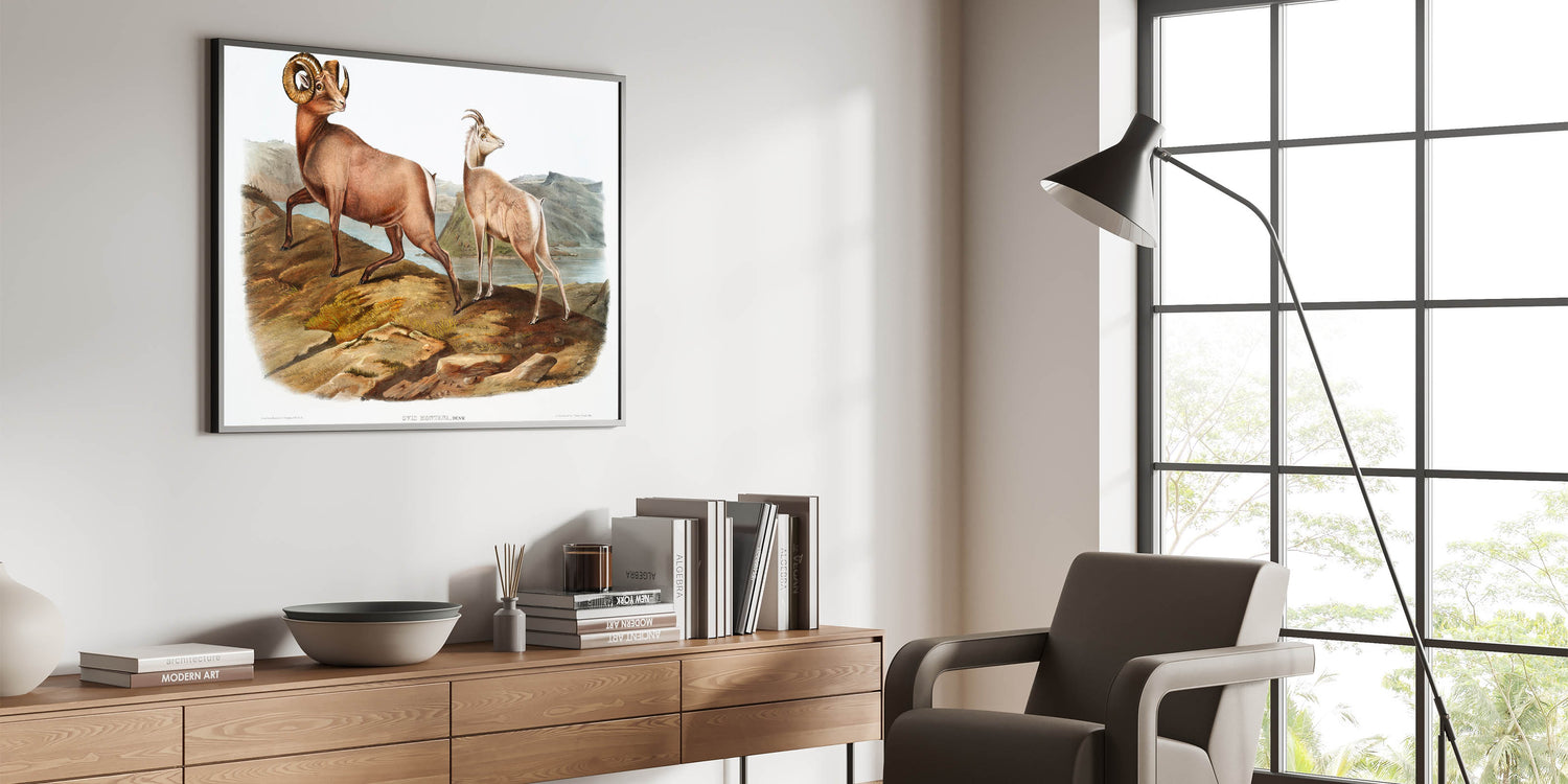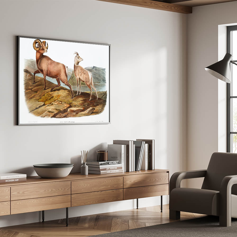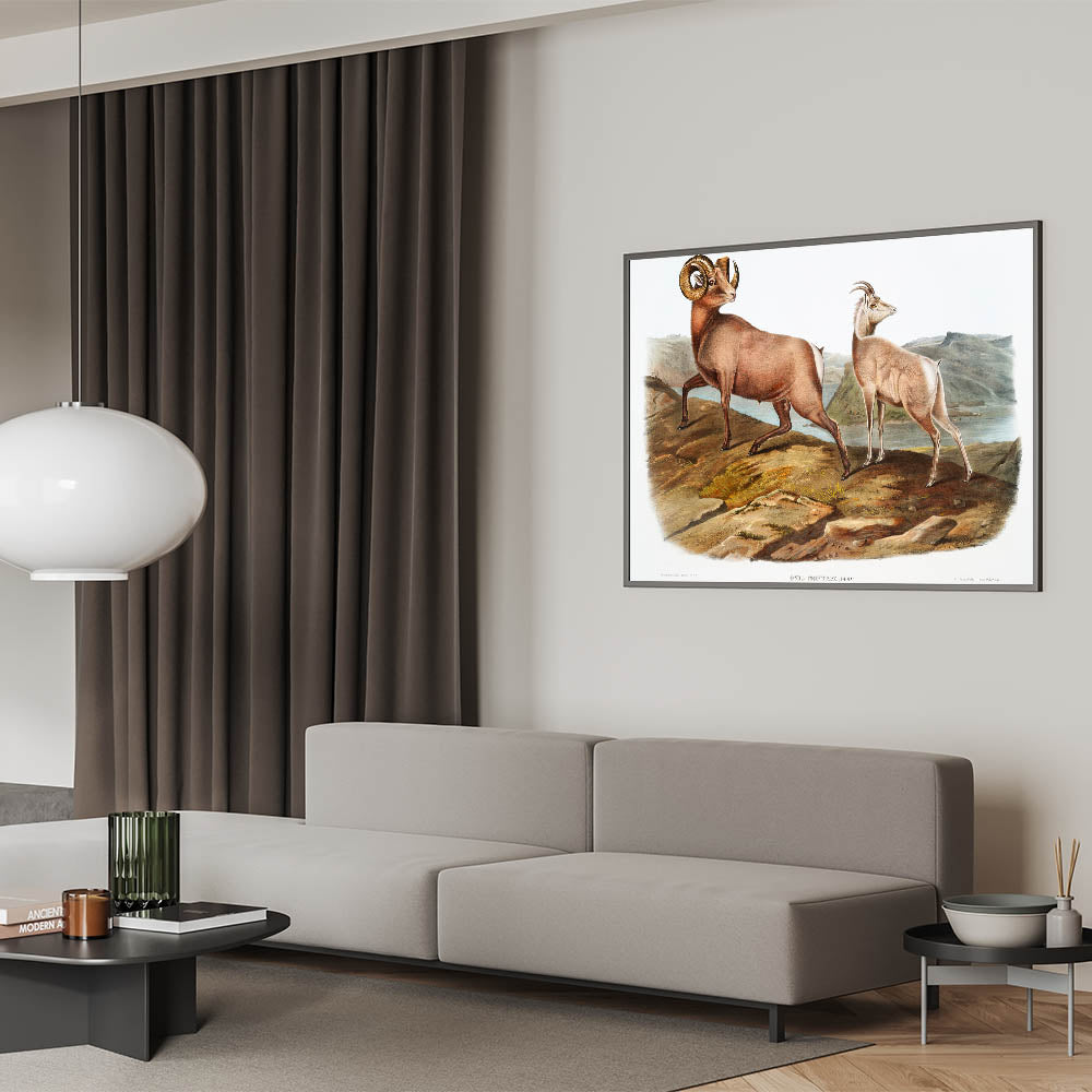 Celebrate the natural elegance of the Romantic era with Rocky Mountain Sheep (Ovis Montana), illustrated by John Woodhouse Audubon in 1845. This exquisite artwork from The Viviparous Quadrupeds of North America captures the strength and grace of these majestic animals amidst a rugged mountainous landscape. The finely detailed composition reflects the Romantic movement’s reverence for the natural world and its timeless beauty.