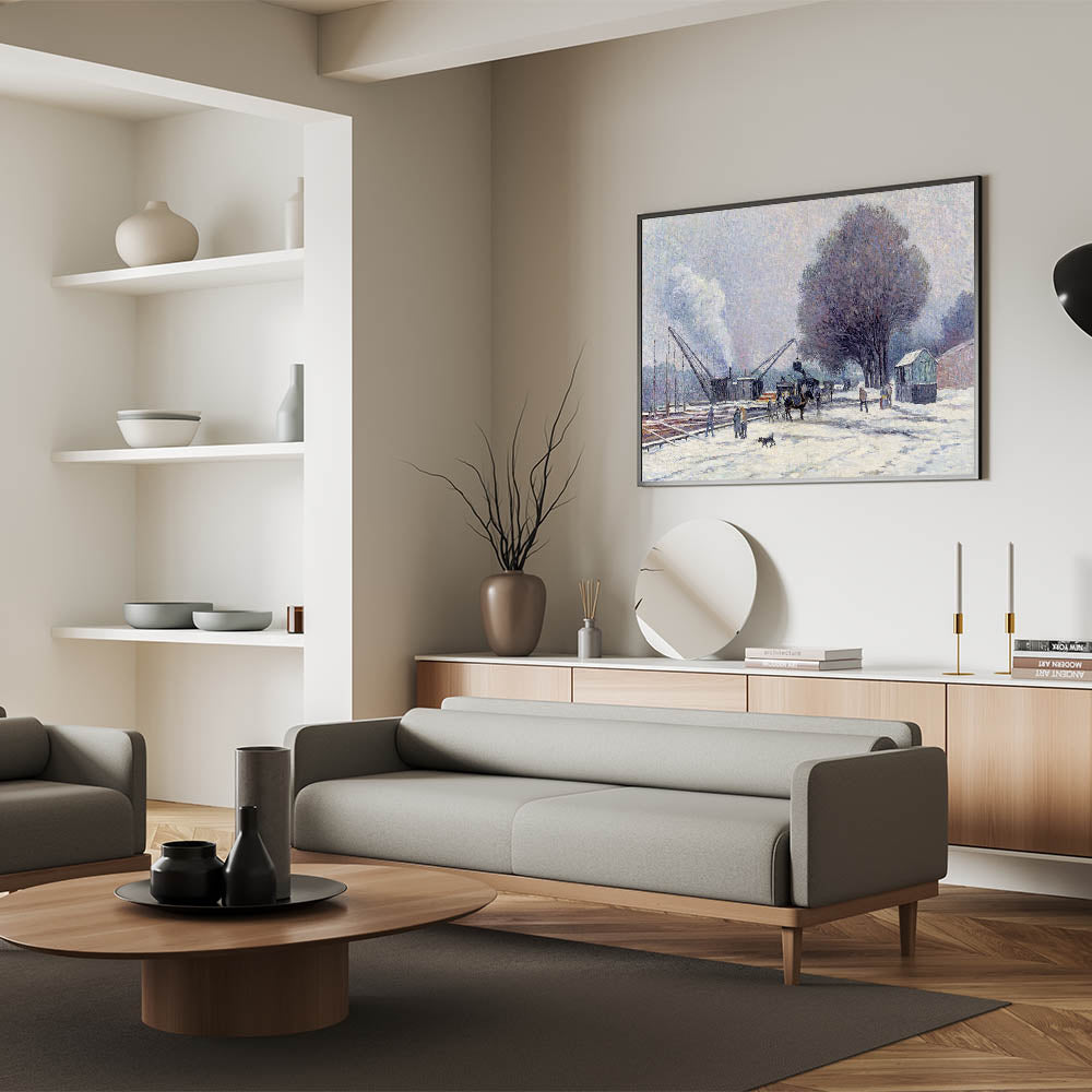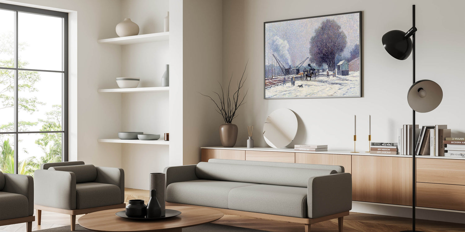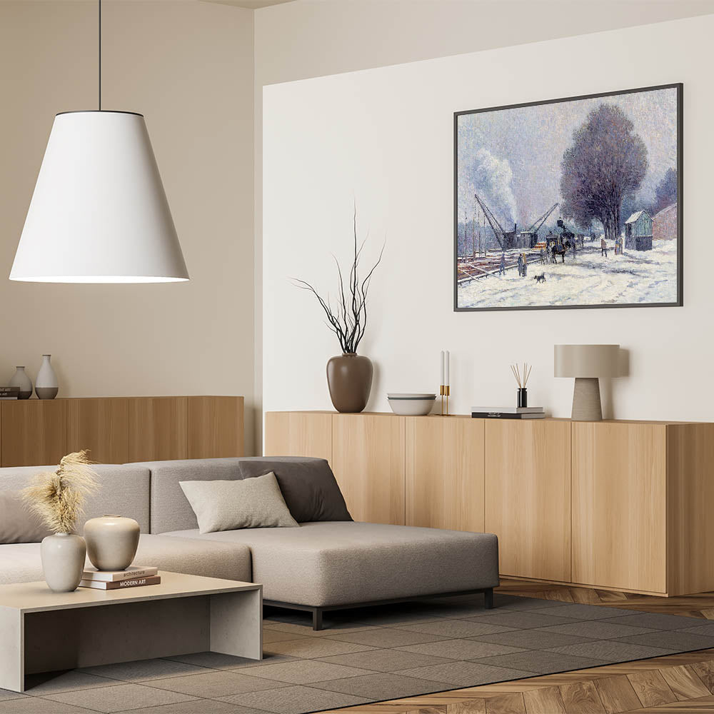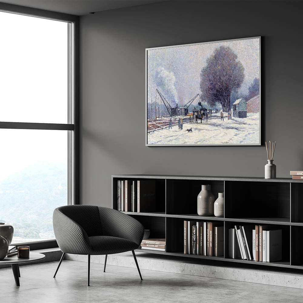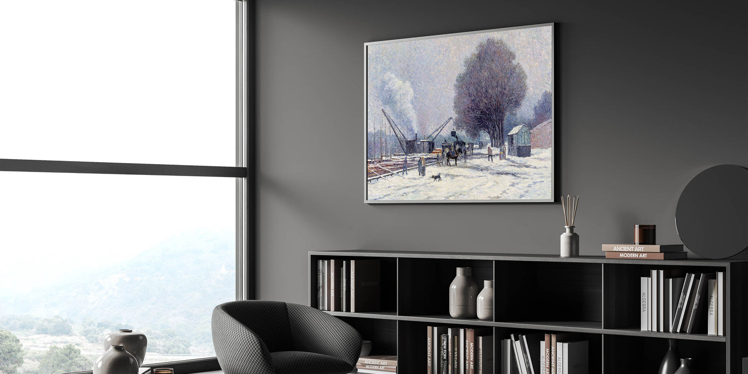Bring the quiet beauty of winter to your space with The Boulogne Embankment by Maximilien Luce. This Impressionist masterpiece captures a serene, snow-covered industrial landscape with subtle tones of blue, gray, and white. The smoke from the chimneys and the activity of workers and horses add life to the otherwise tranquil scene. Luce’s meticulous brushstrokes and keen observation of light create a captivating visual story.