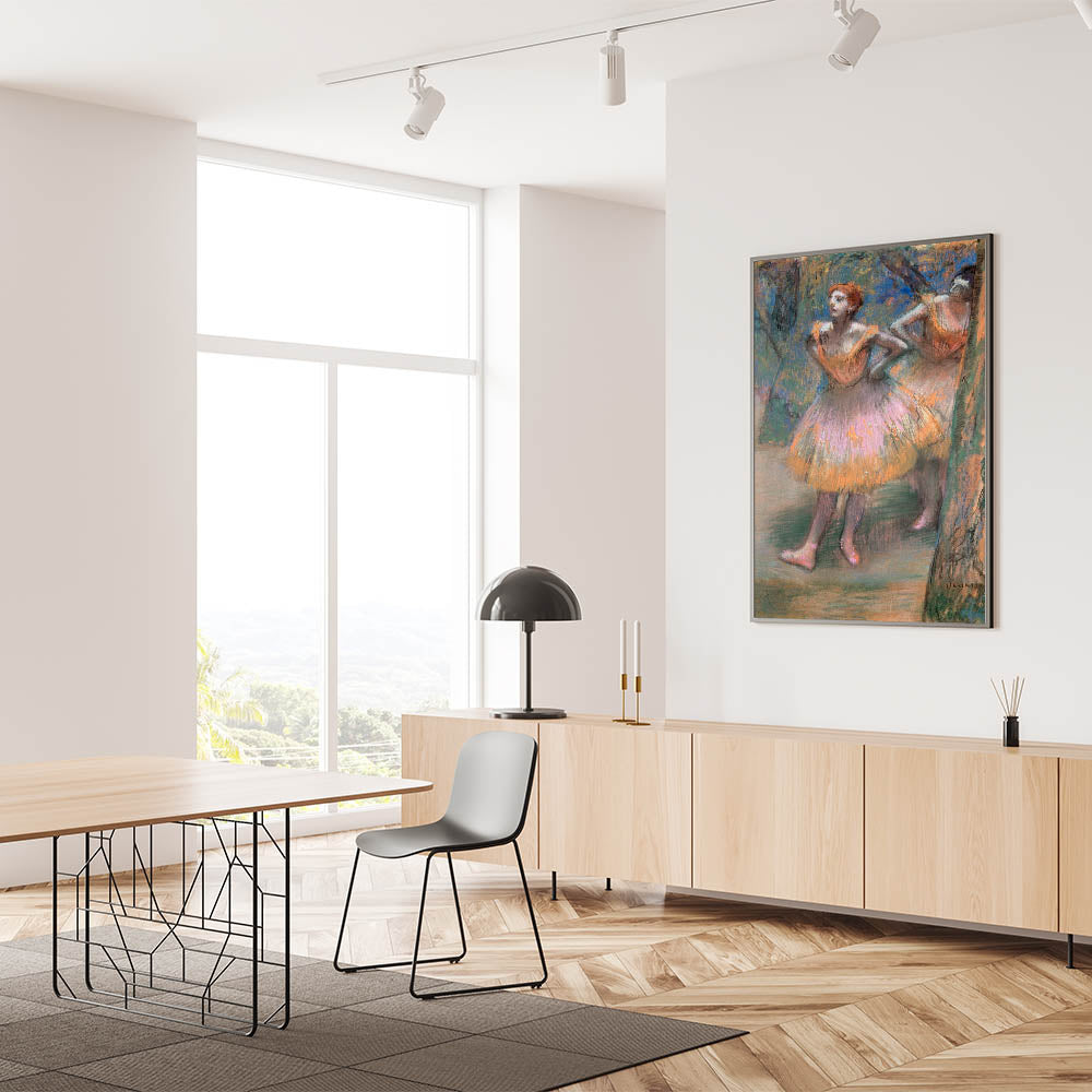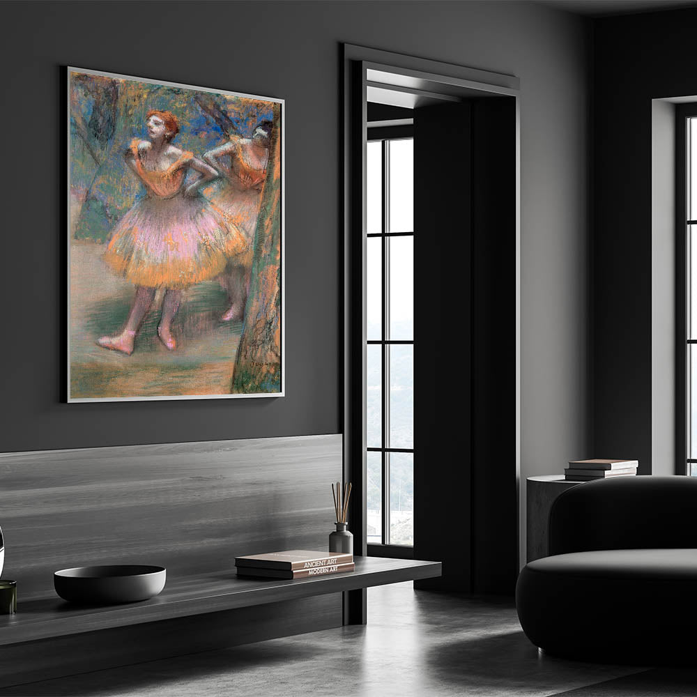 Two Dancers" by the legendary Edgar Degas captures the essence of French Impressionist art with its graceful depiction of ballerinas in vibrant, flowing attire. This timeless piece showcases Degas's mastery of color and movement, making it a stunning addition to any space.
