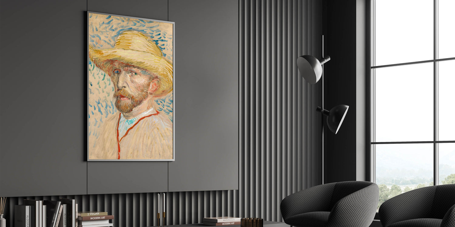 Discover the charm of Impressionism with Vincent van Gogh’s 1887 self-portrait featuring a straw hat. This masterpiece embodies Van Gogh’s distinctive style, showcasing textured brushstrokes and a harmonious blend of soft yellows and blues. The warm tones of the straw hat contrast beautifully with the vibrant, rhythmic background, creating a dynamic and captivating composition.