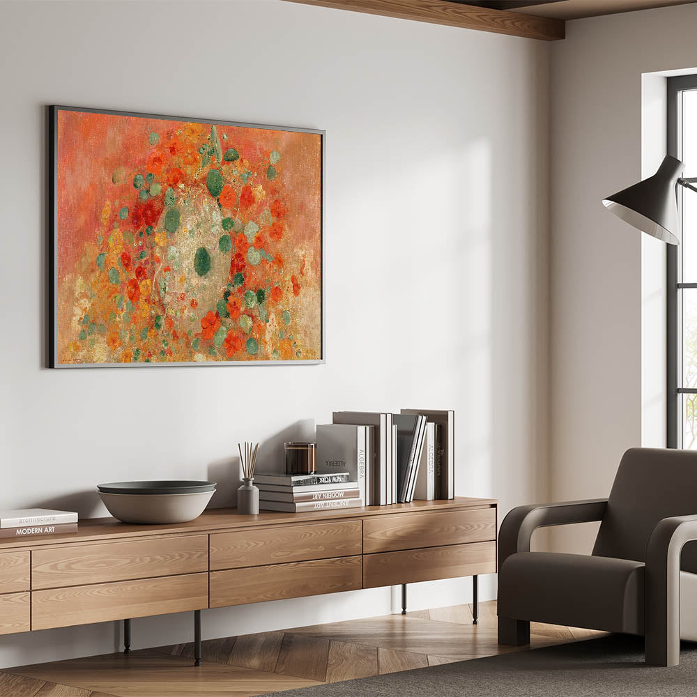 Bring the beauty of nature into your space with this vibrant modern wall art featuring a stunning arrangement of nasturtiums. The artwork showcases a symphony of orange, red, and green hues that create a lively and inviting atmosphere. With its abstract floral composition and warm tones, this piece is perfect for adding a touch of sophistication and energy to any room.