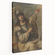 Bring a touch of historical art and mystery into your space with this captivating Baroque art print. The artwork features a blindfolded figure clad in shining armor, holding a glowing candle in one hand and a chalice in the other. The scene is steeped in symbolism, with flowing red hair, a mystical ambiance, and subtle background details like books and faint inscriptions. The composition perfectly exemplifies timeless artistic expression with its muted blue and beige tones contrasted against the glint of metal armor.