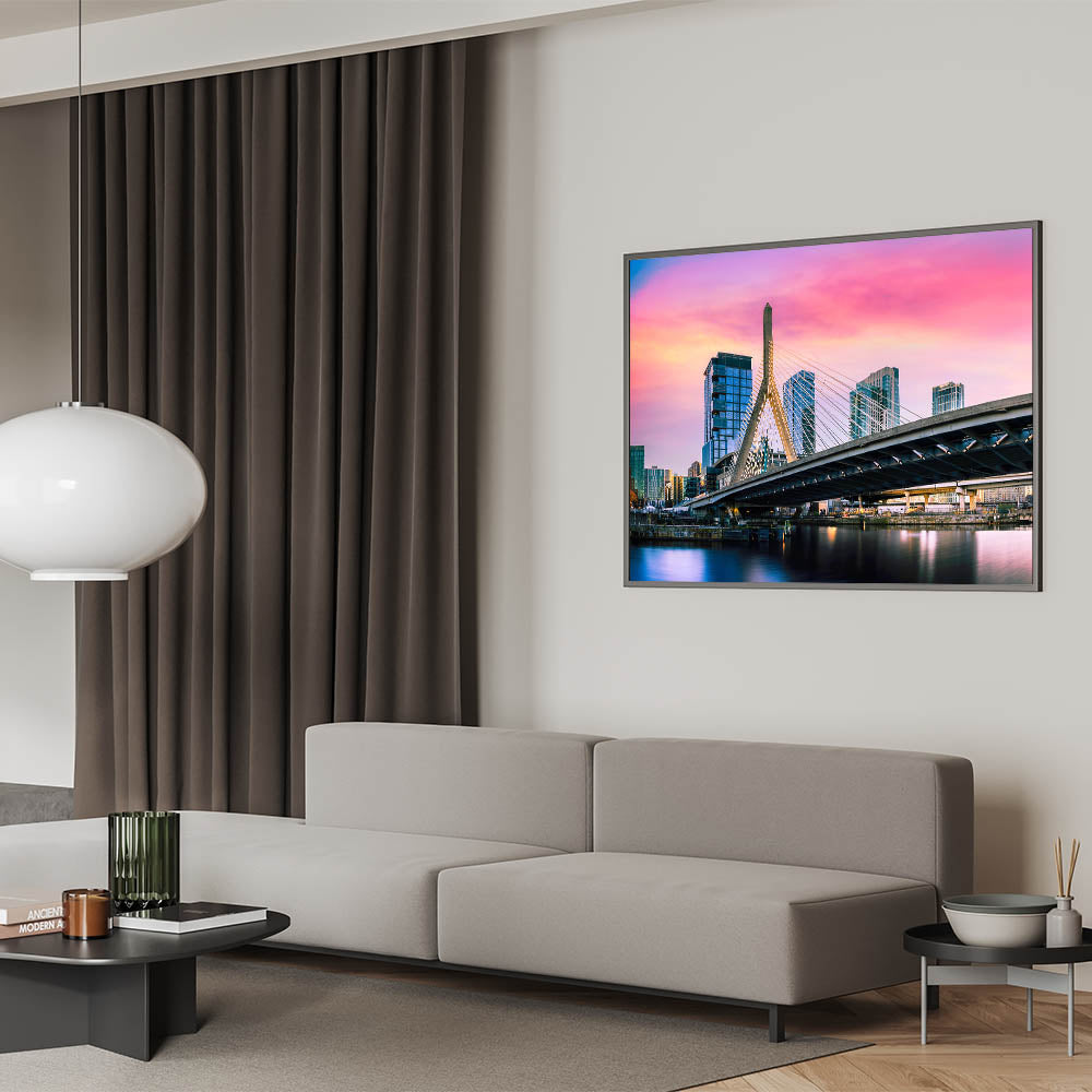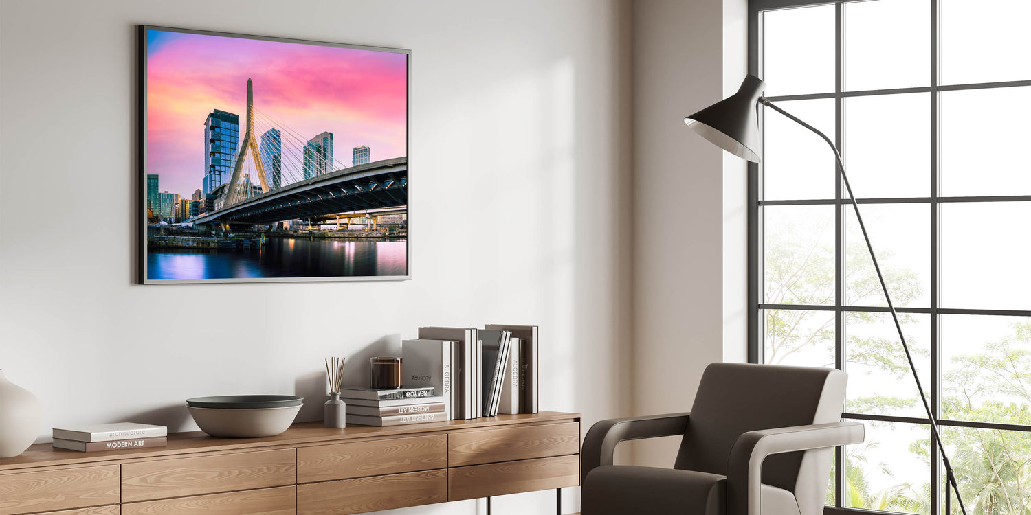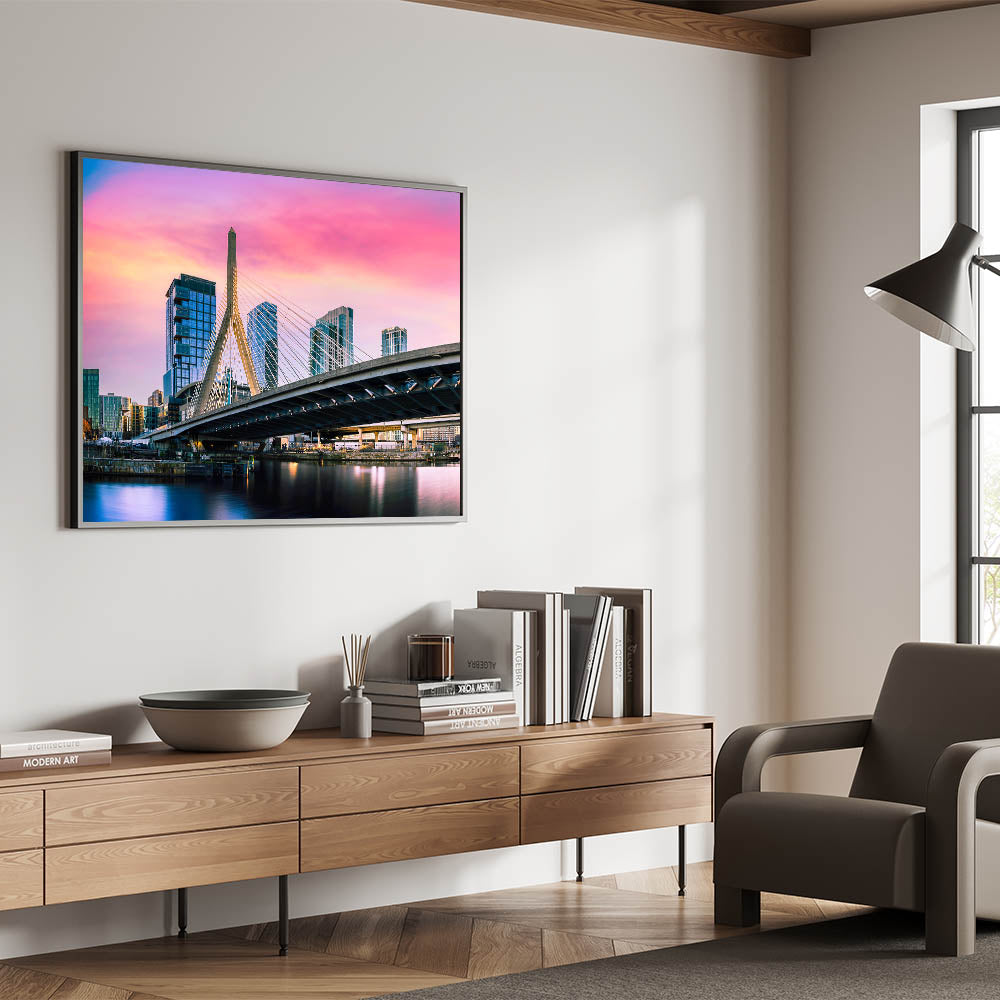 Capture the vibrant energy of Boston with this stunning wall art, featuring the Zakim Bridge against a colorful sunset sky. The dramatic hues of pink, orange, and purple create a breathtaking backdrop, highlighting the modern architectural marvel of the bridge as it stands tall over the city. Perfect for those who appreciate urban landscapes and striking colors, this piece brings a dynamic and lively atmosphere to any room.