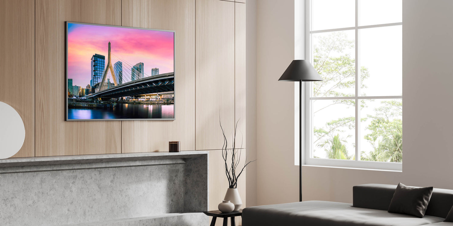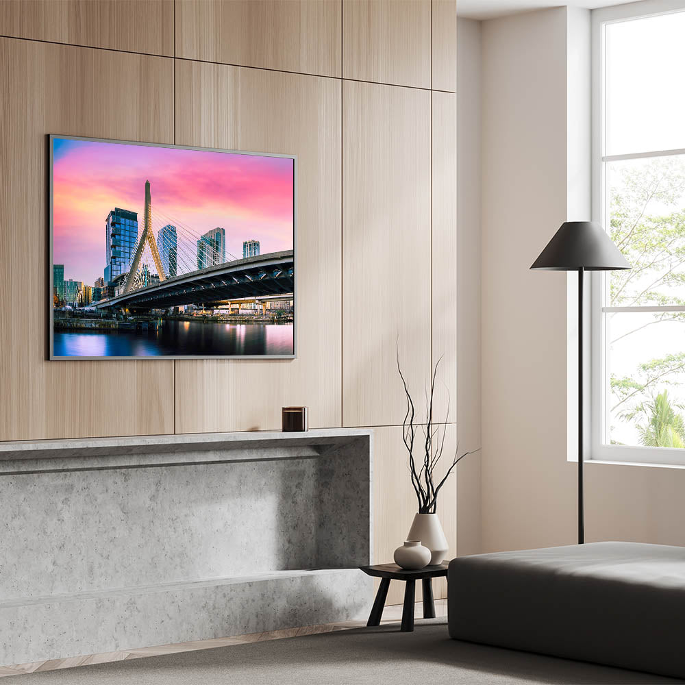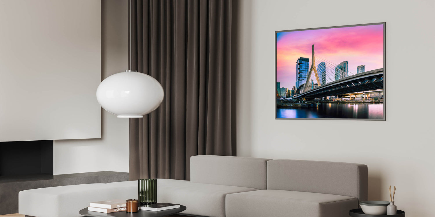 Capture the vibrant energy of Boston with this stunning wall art, featuring the Zakim Bridge against a colorful sunset sky. The dramatic hues of pink, orange, and purple create a breathtaking backdrop, highlighting the modern architectural marvel of the bridge as it stands tall over the city. Perfect for those who appreciate urban landscapes and striking colors, this piece brings a dynamic and lively atmosphere to any room.