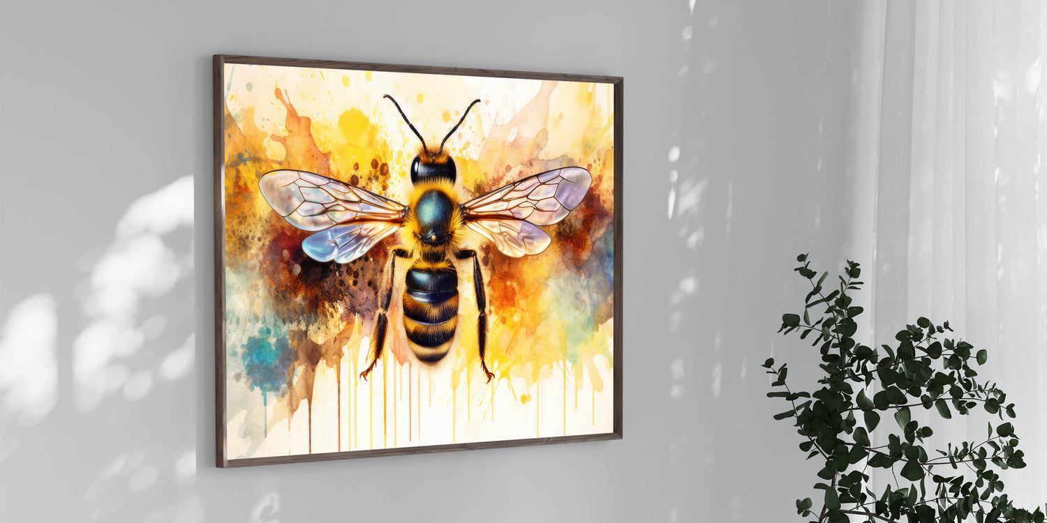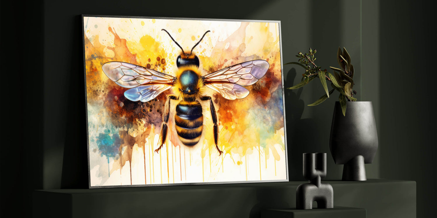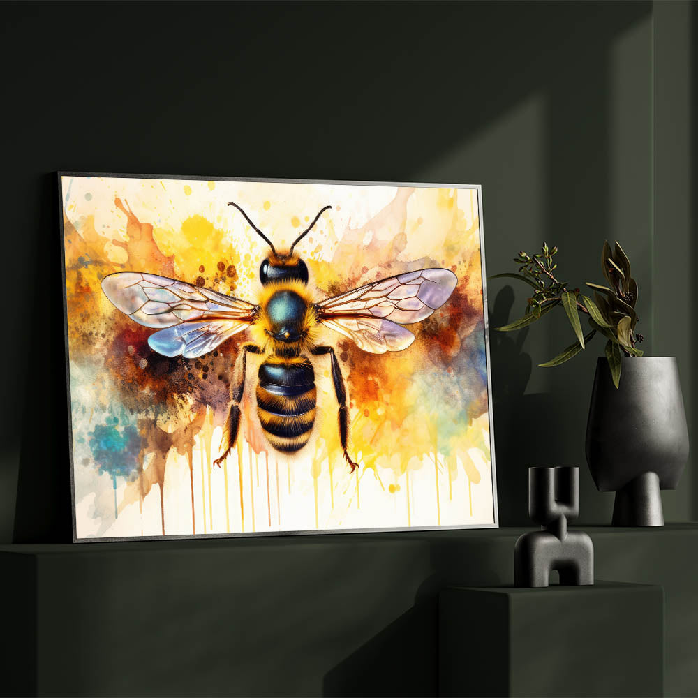 Transform your space with this striking abstract bee wall art, featuring a beautifully detailed bumblebee set against an explosion of vibrant watercolor splashes. The dynamic mix of yellow, blue, and orange hues creates an eye-catching piece that will instantly brighten any room. This artwork perfectly balances the intricacies of nature with the fluidity and creativity of abstract art, making it an ideal choice for both modern and eclectic decor styles.