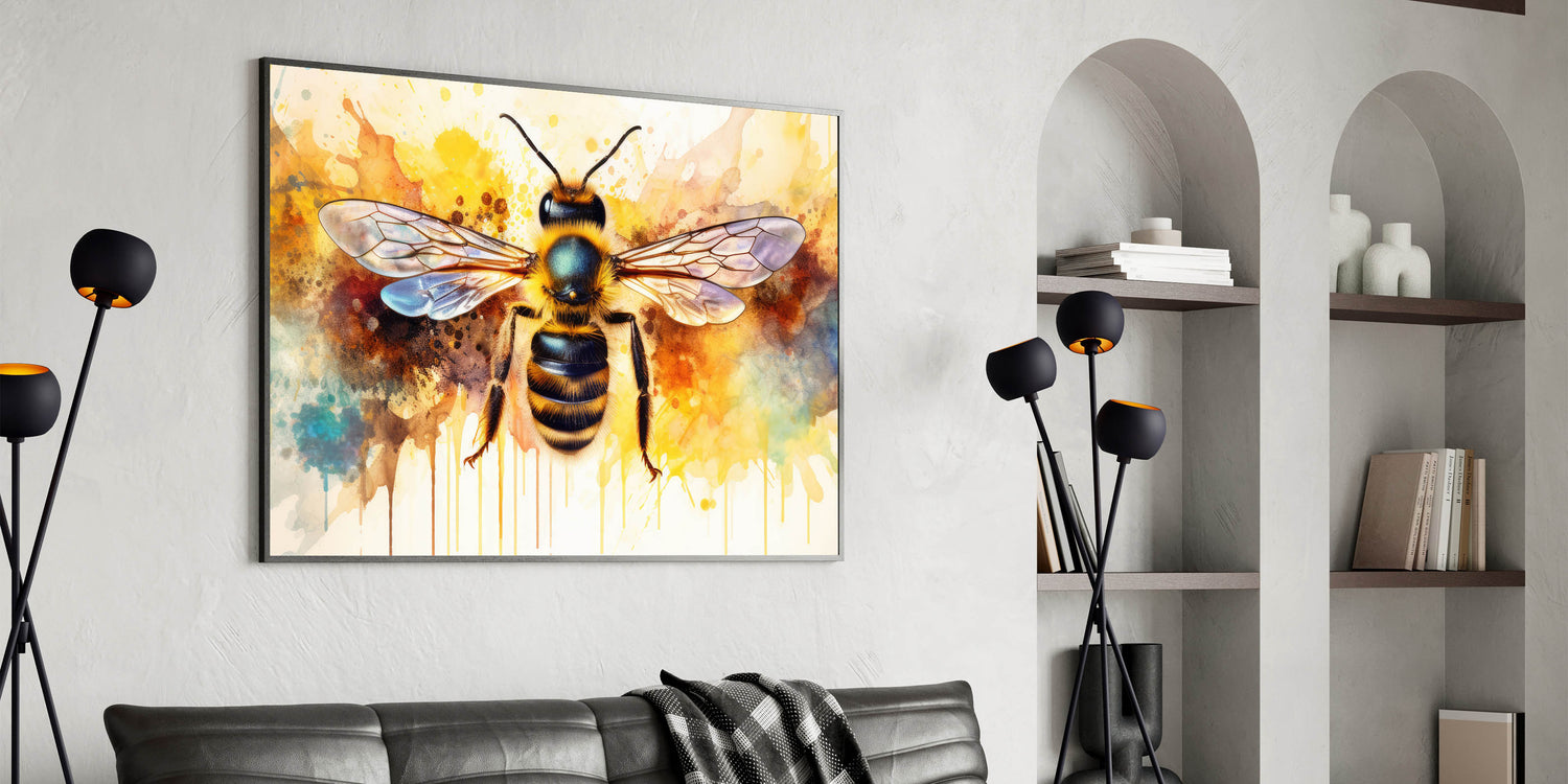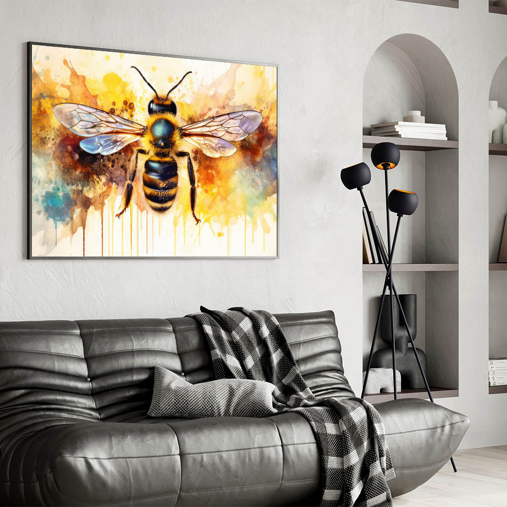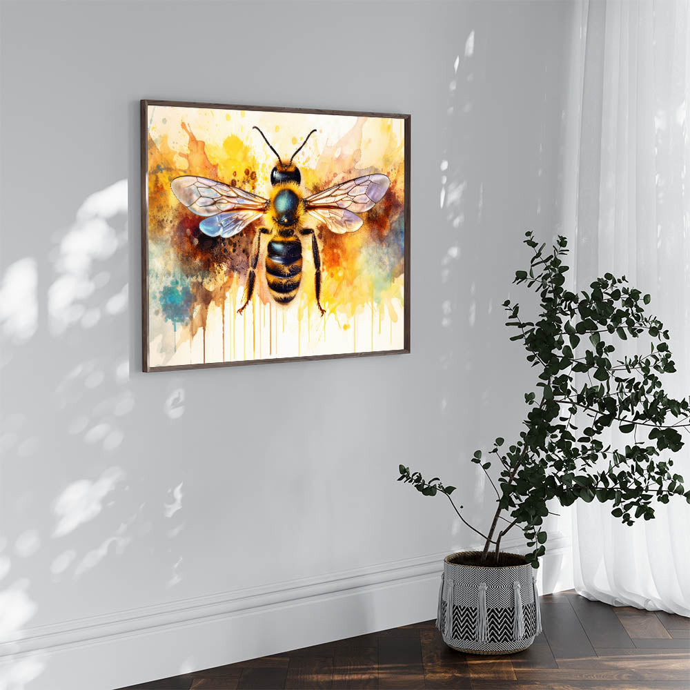 Transform your space with this striking abstract bee wall art, featuring a beautifully detailed bumblebee set against an explosion of vibrant watercolor splashes. The dynamic mix of yellow, blue, and orange hues creates an eye-catching piece that will instantly brighten any room. This artwork perfectly balances the intricacies of nature with the fluidity and creativity of abstract art, making it an ideal choice for both modern and eclectic decor styles.