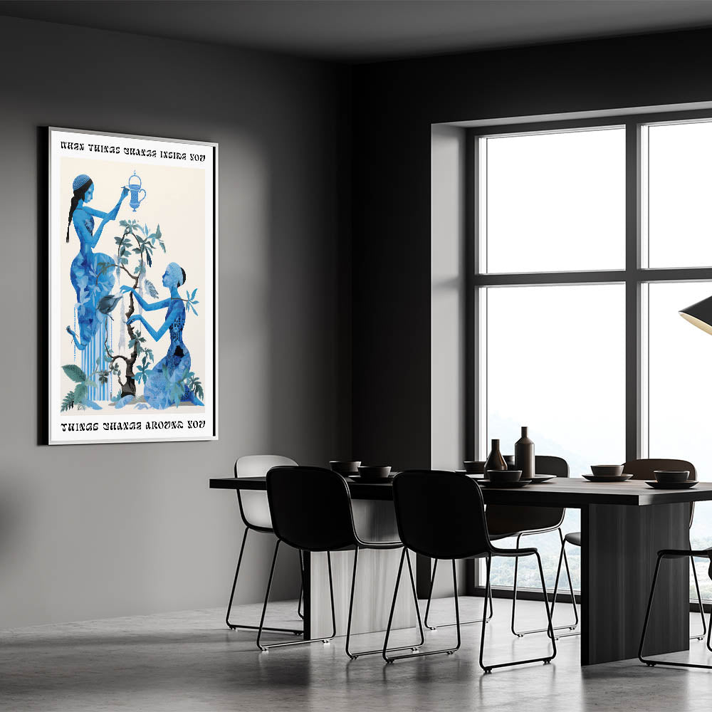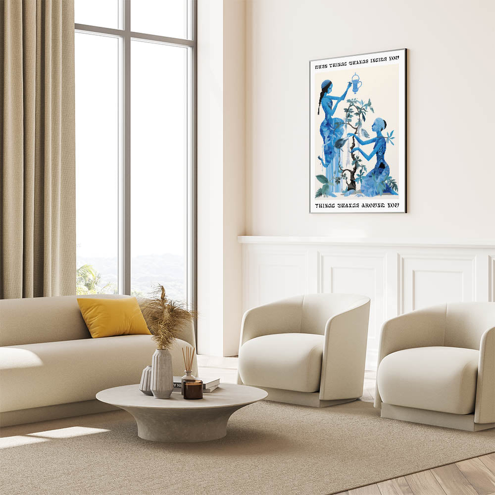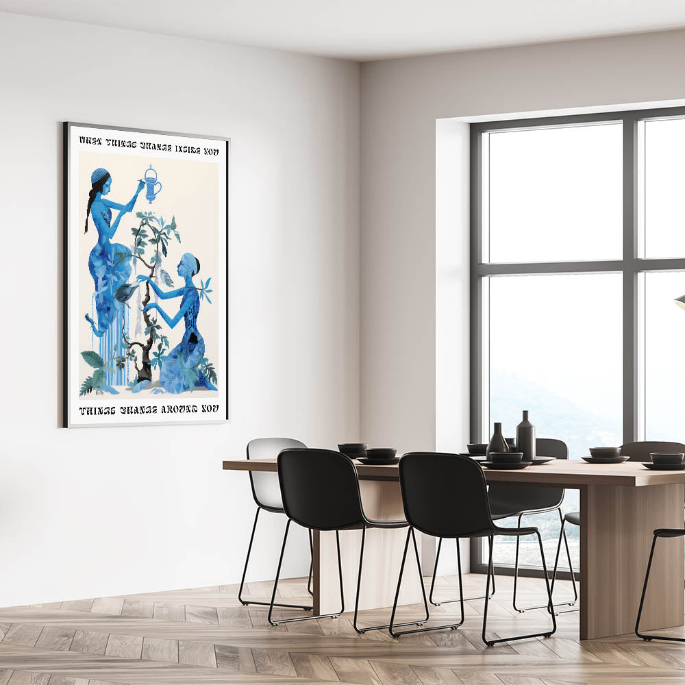 Transform your space with the Abstract Electric Blue Figures Canvas, an artistic representation of dynamic energy and transformation. This captivating piece features two blue figures surrounded by nature-inspired elements, all set against a bright backdrop. The design is accentuated with an electric blue palette, making it perfect for those who appreciate modern electric-themed decor. The motivational quote, “When things change inside you, things change around you,” adds an uplifting touch, making this piece both visually stunning and inspiring.