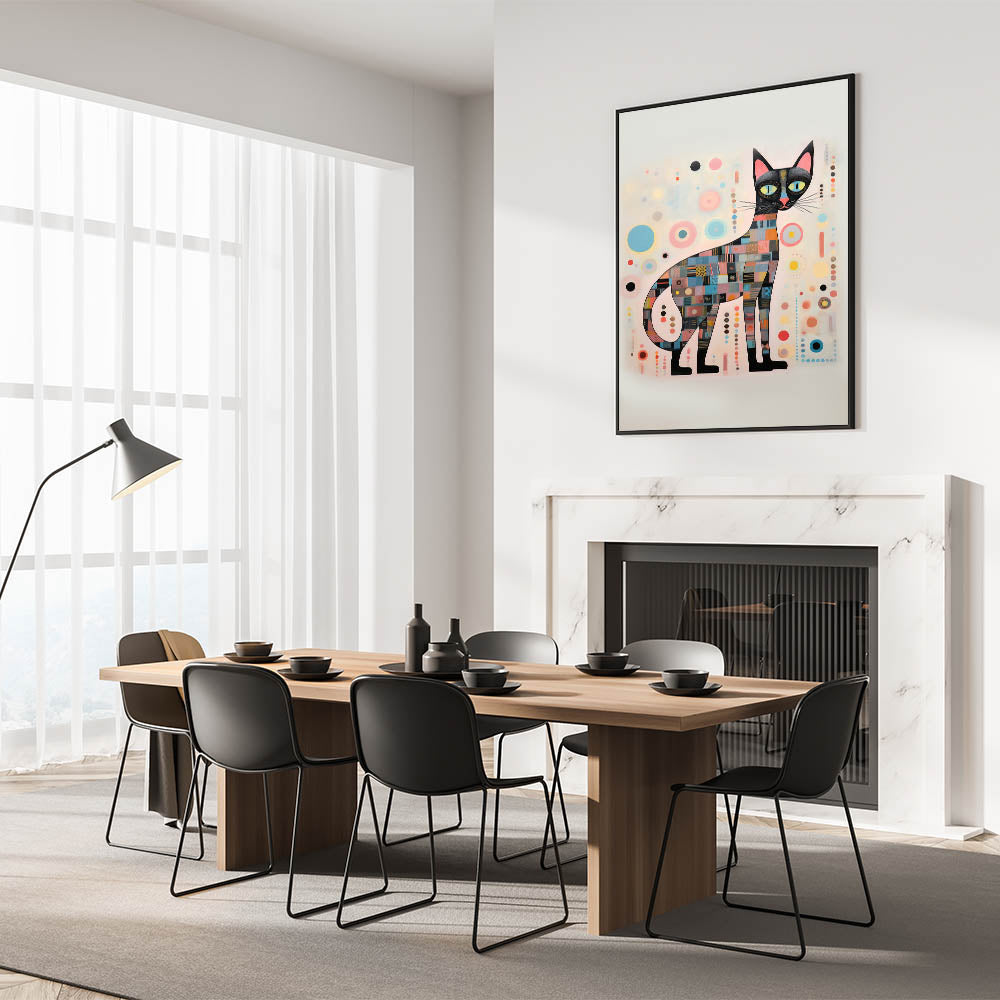 Introduce a playful and vibrant touch to your space with the "Abstract Electric Cat Canvas." This colorful piece of electric wall art showcases a stylized cat adorned with geometric and mosaic patterns, set against a lively background filled with circles and shapes in pastel and bold hues. Perfect for eclectic and contemporary interiors, this modern electric decor piece adds character and charm to any room.