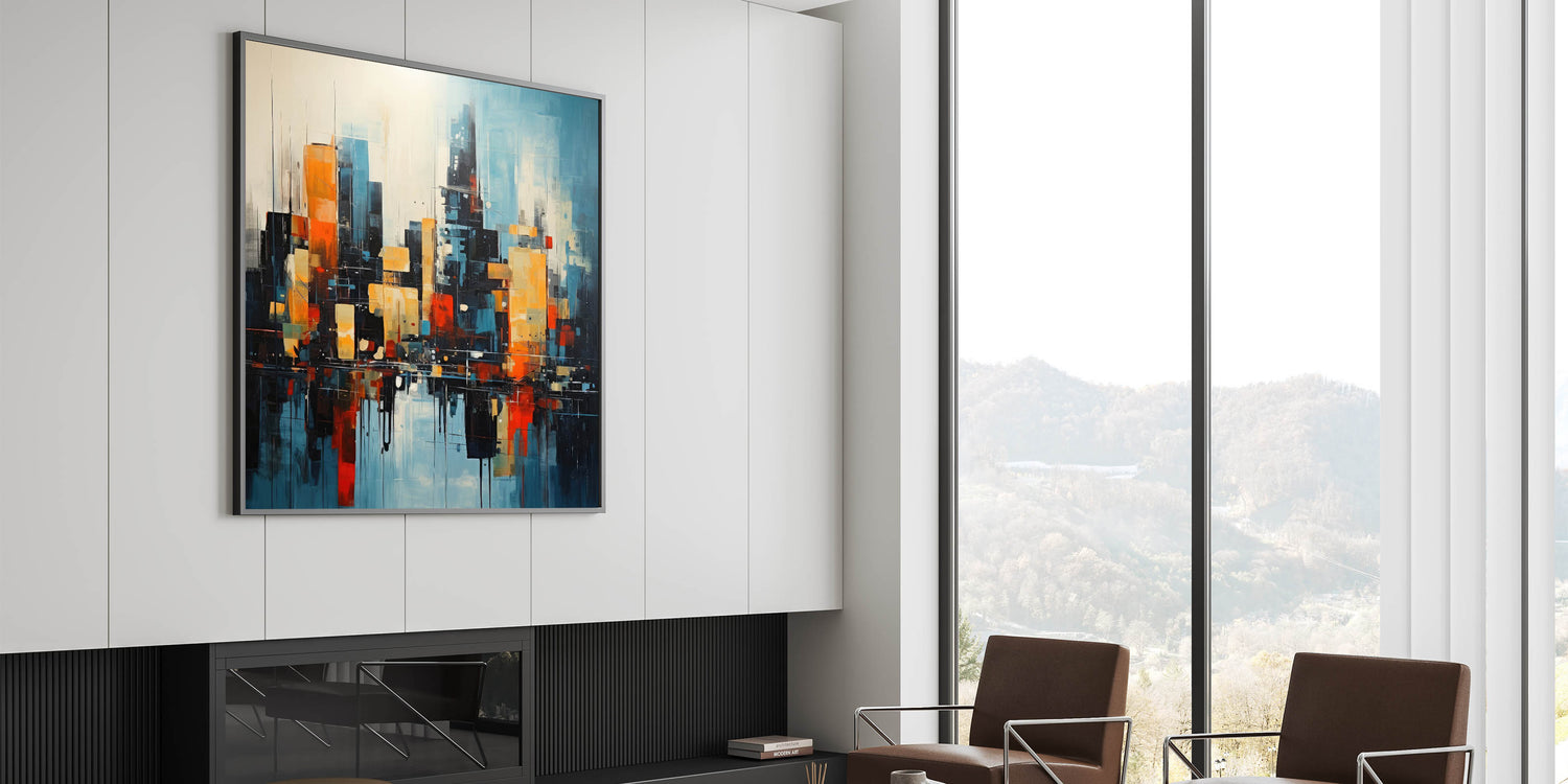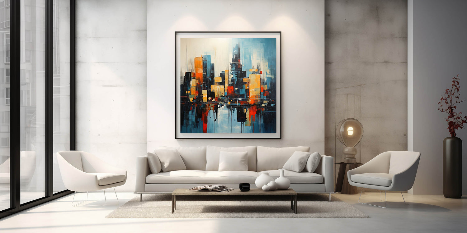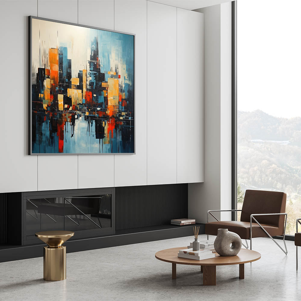 Bring the energy of New York City into your home with this bold abstract cityscape art. Featuring an array of geometric shapes in rich, vibrant colors, this artwork captures the essence of Manhattan’s skyline in a modern, dynamic way. The mix of warm oranges, cool blues, and subtle yellows creates a striking contrast that makes this high-quality Manhattan art print a perfect centerpiece for contemporary and urban-inspired interiors. Available in various formats, including stretched canvas, framed prints, and acrylic glass, this unique piece of New York City wall decor is ideal for adding a touch of modern art to your space.