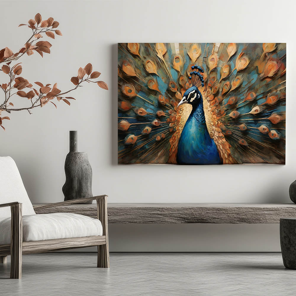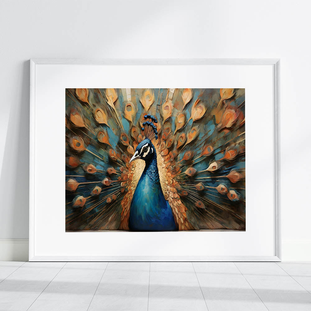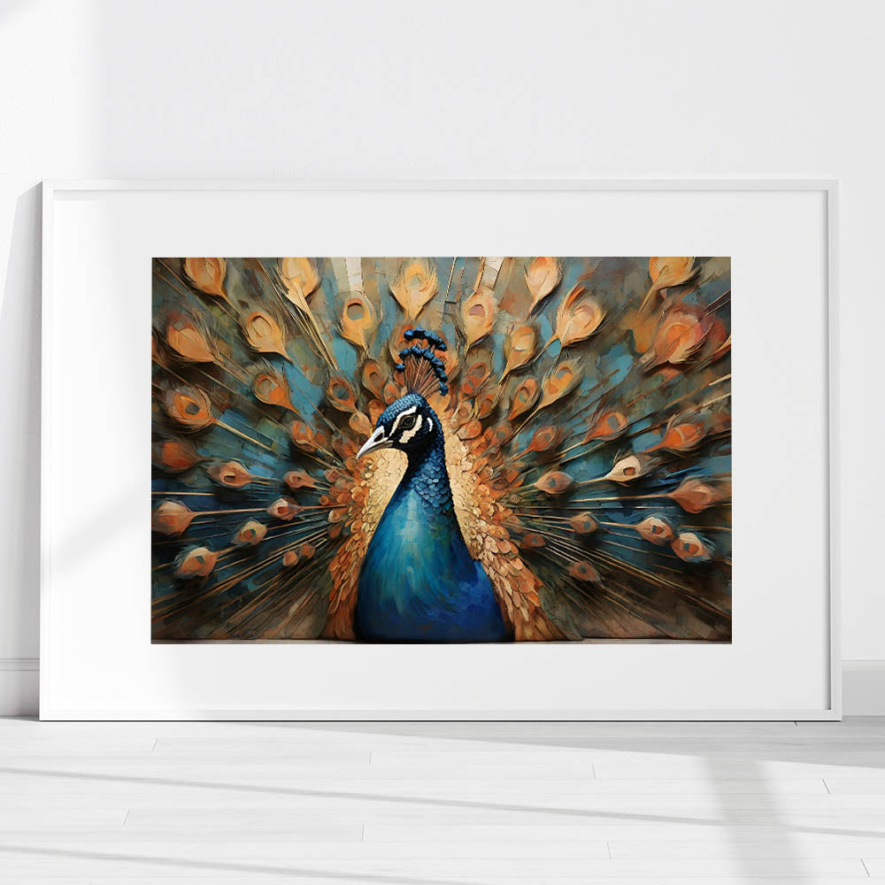 - Bold and Textured Design: Features a peacock with radiating feathers in a mix of blue and orange, with abstract and textured details that add a modern flair.