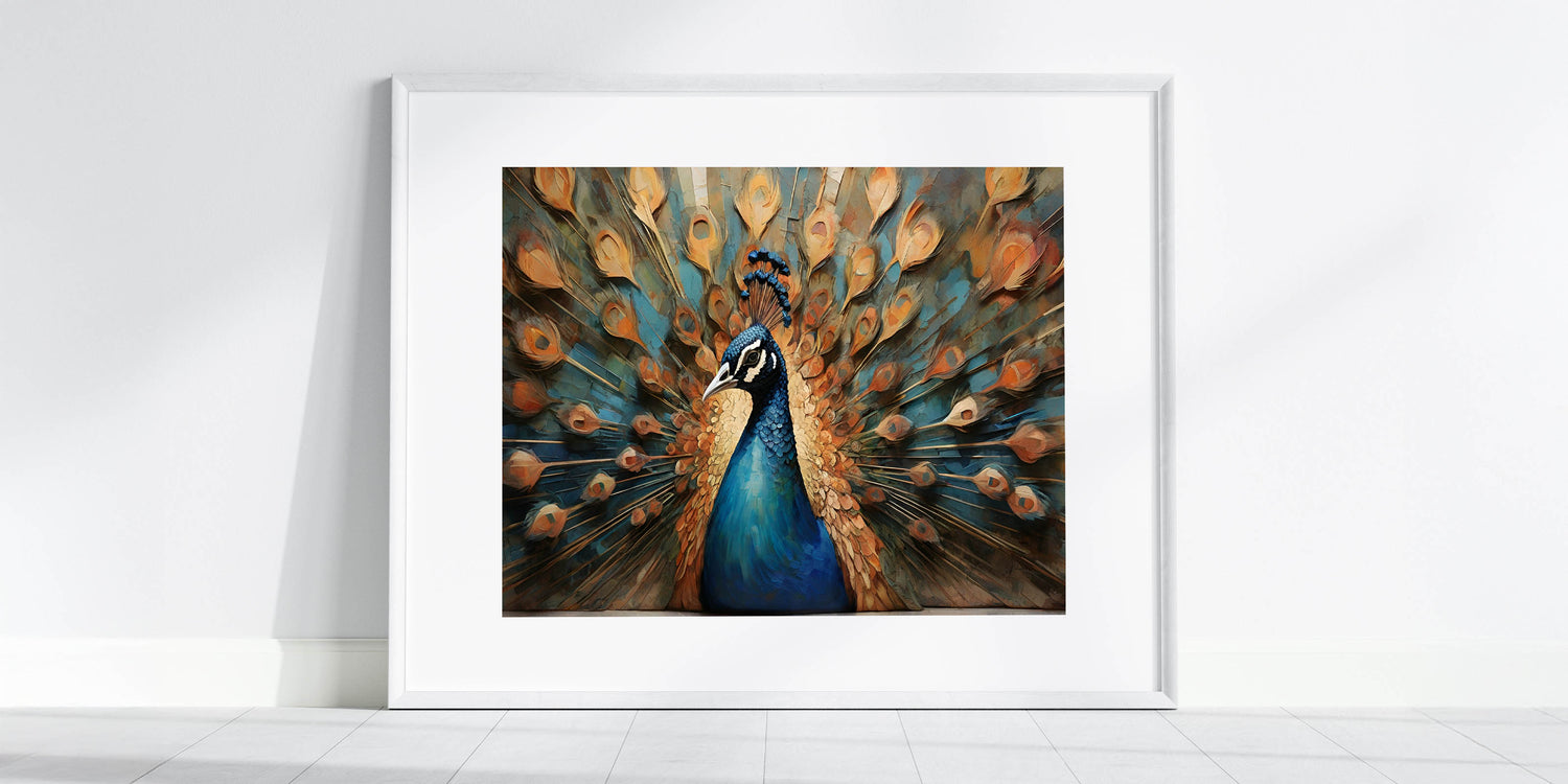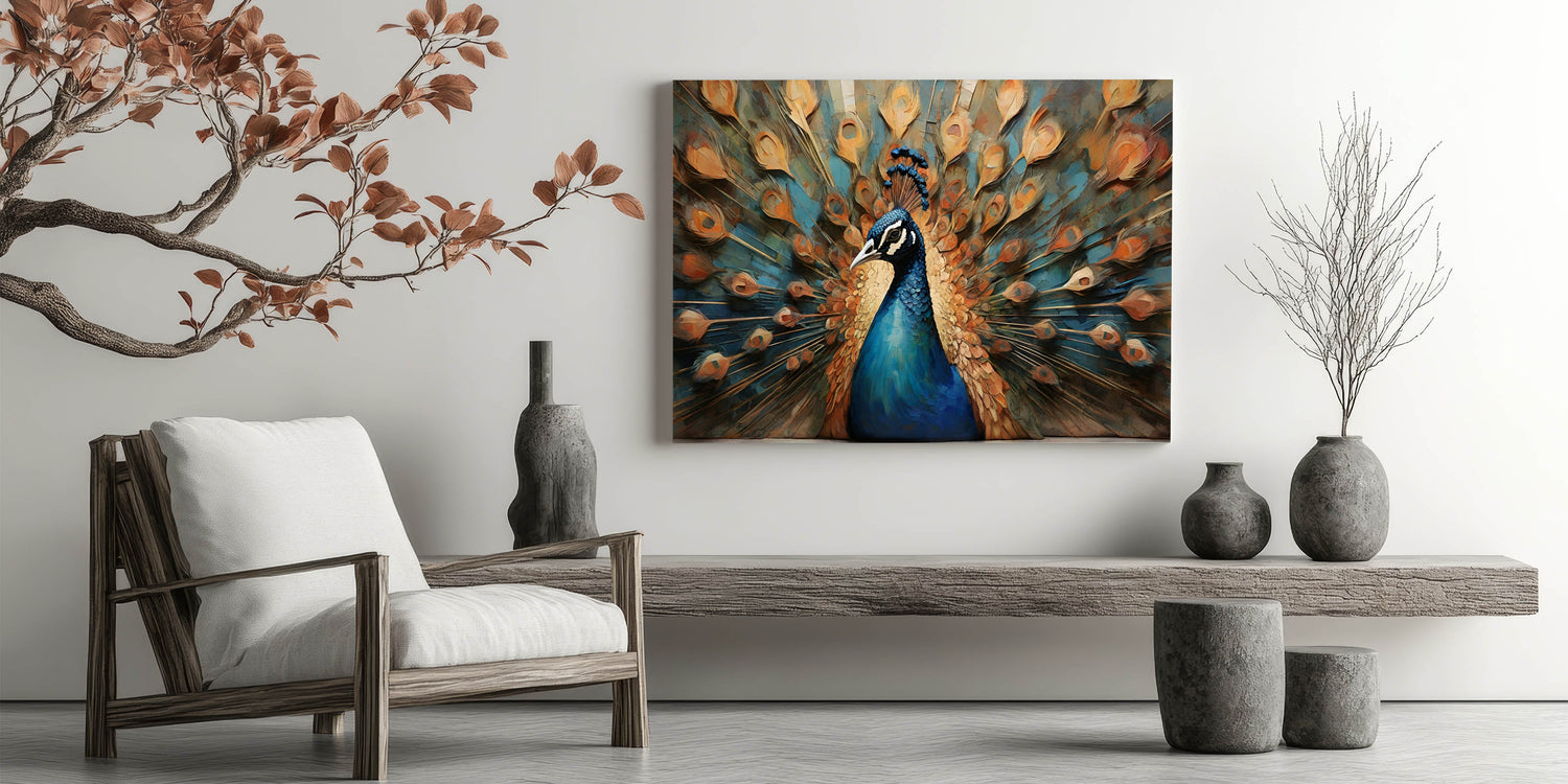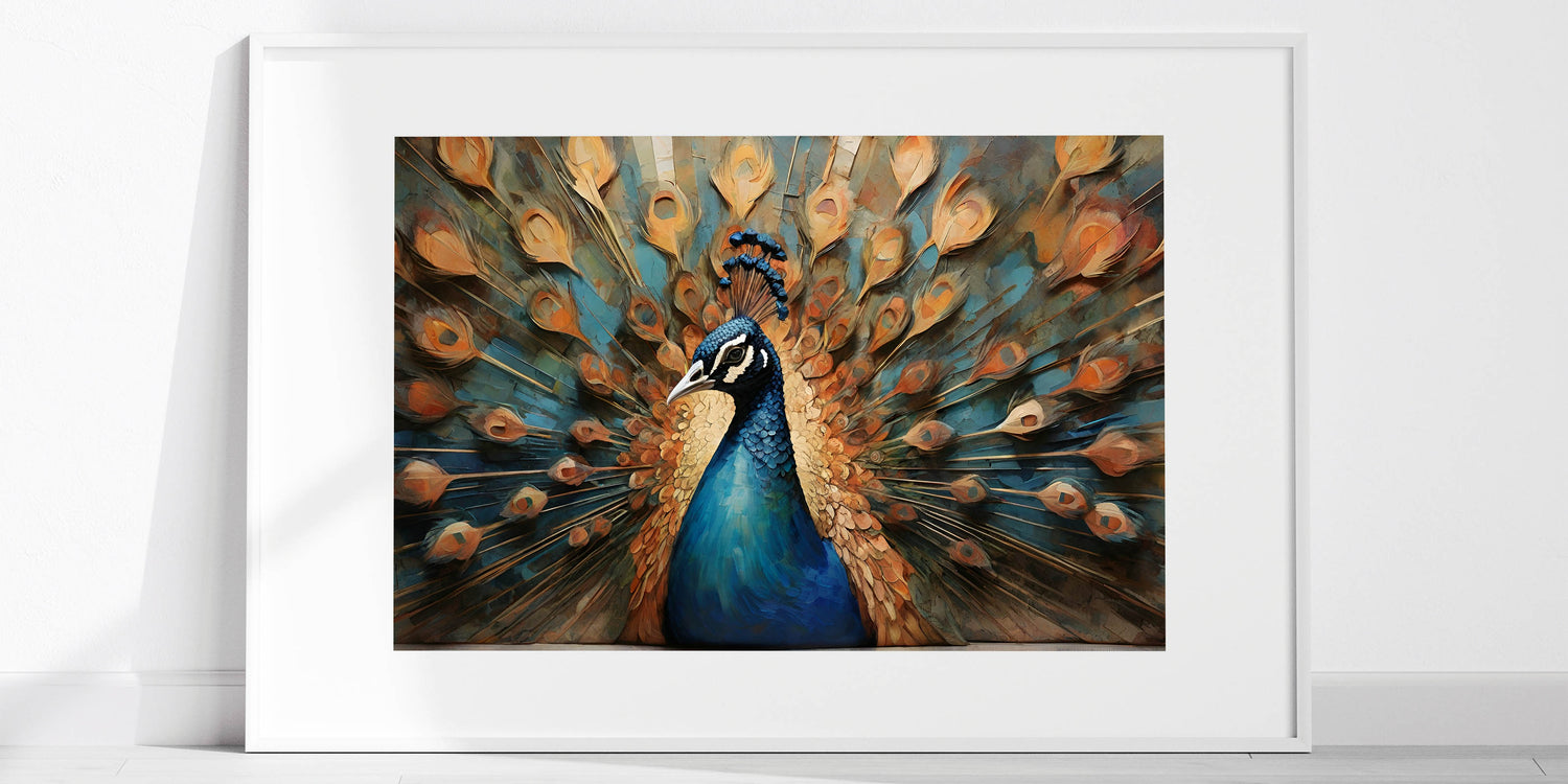 - Bold and Textured Design: Features a peacock with radiating feathers in a mix of blue and orange, with abstract and textured details that add a modern flair.