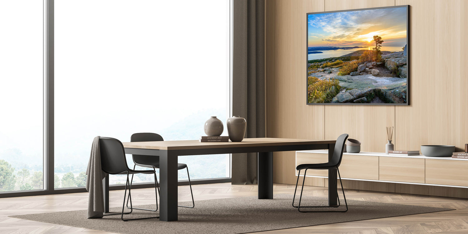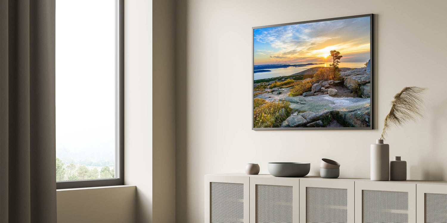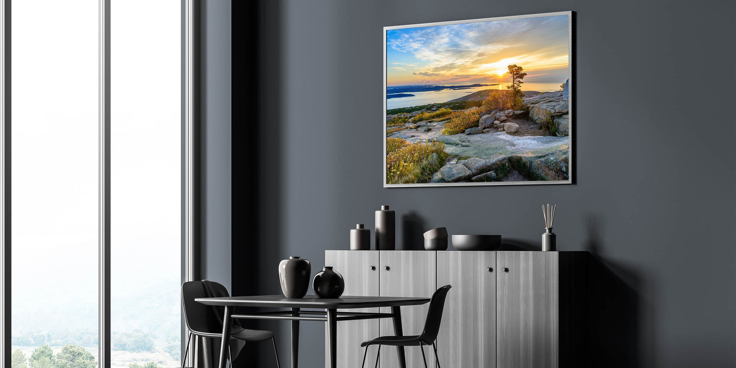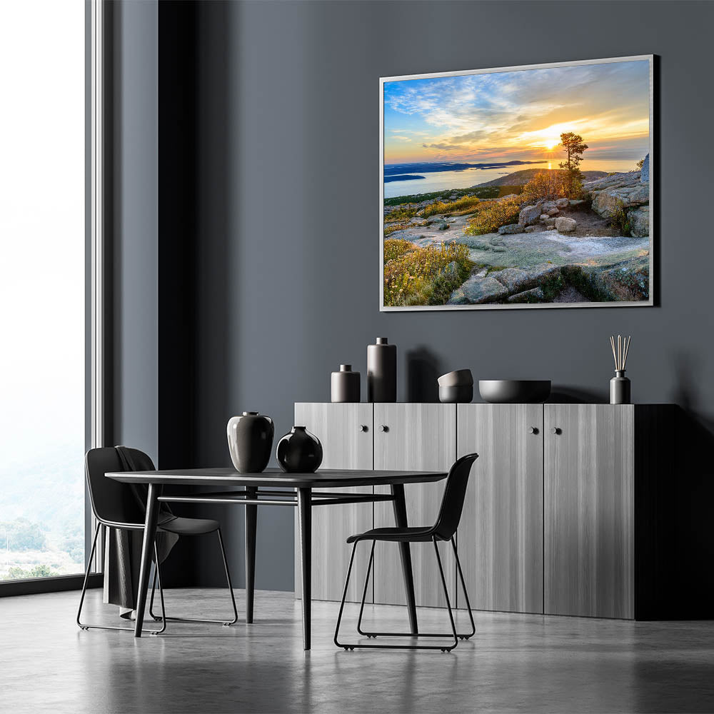 Experience the breathtaking beauty of Acadia National Park with this stunning piece of wall art. Capturing the serene sunrise over the rocky coast of Maine, this artwork offers a perfect blend of nature’s beauty and tranquility. The rich colors of the sky, ocean, and rugged landscape make this a must-have for lovers of scenic photography.