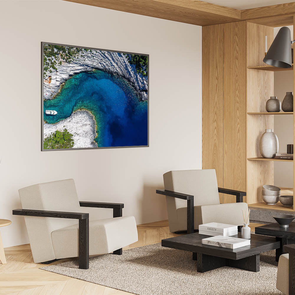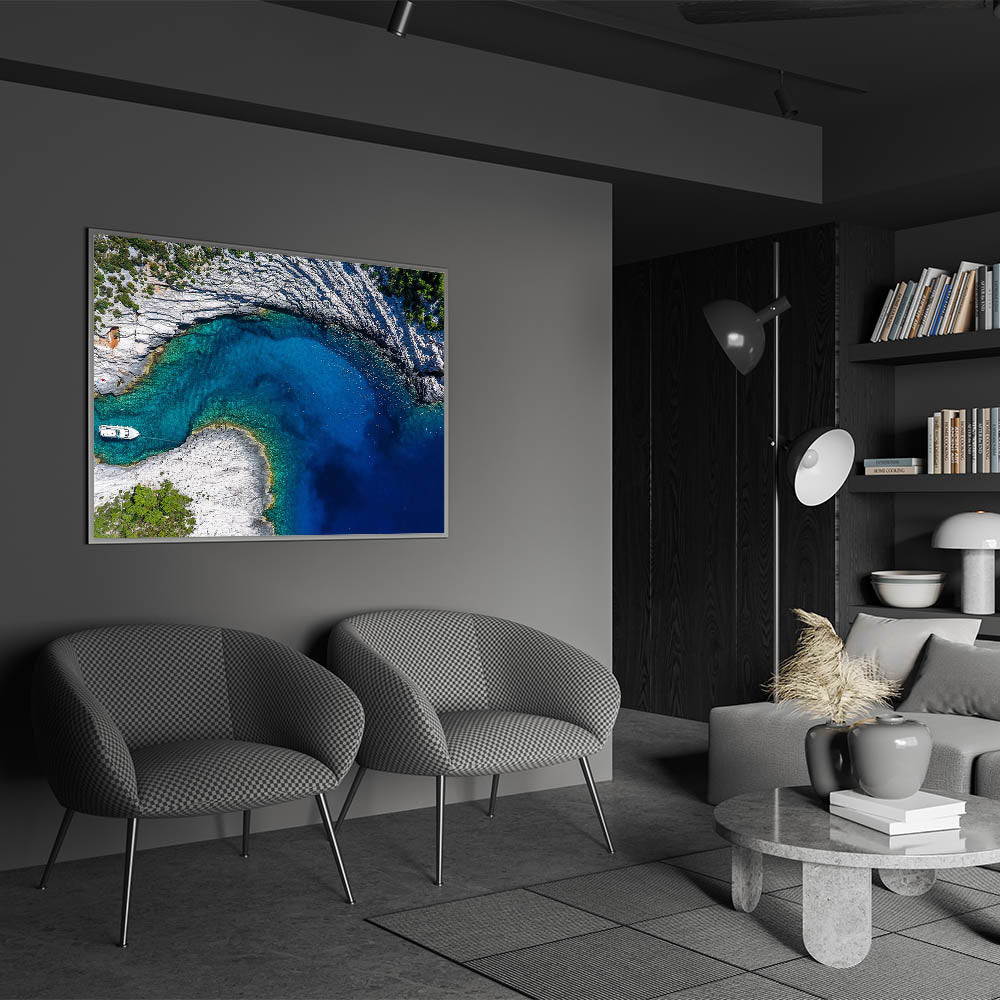 Elevate your decor with our "Aerial View of Croatian Cove Print" from the Croatia Scenery By Region Collection. This striking piece captures the untouched beauty of a secluded Croatian cove, where azure waters meet rugged limestone cliffs, creating a breathtaking panorama that’s both vibrant and serene.