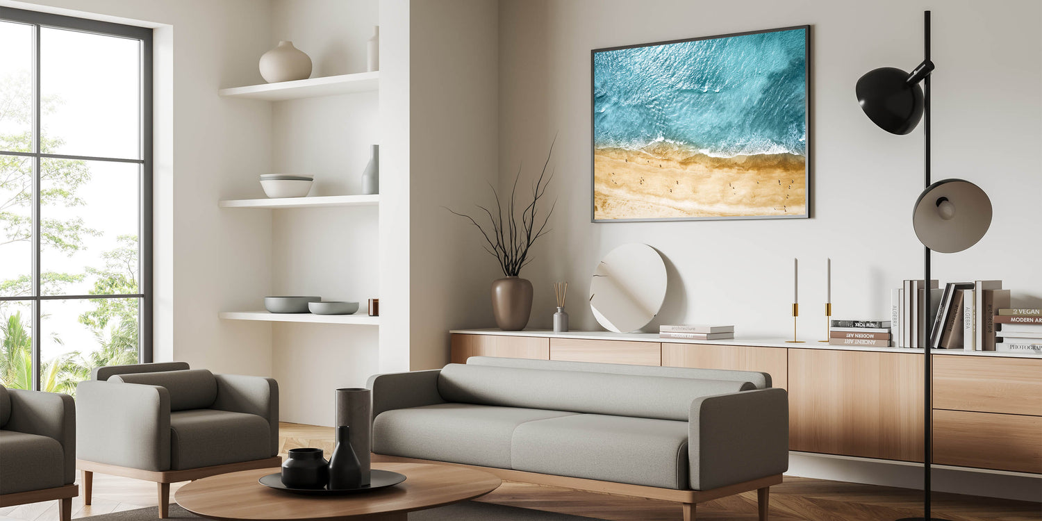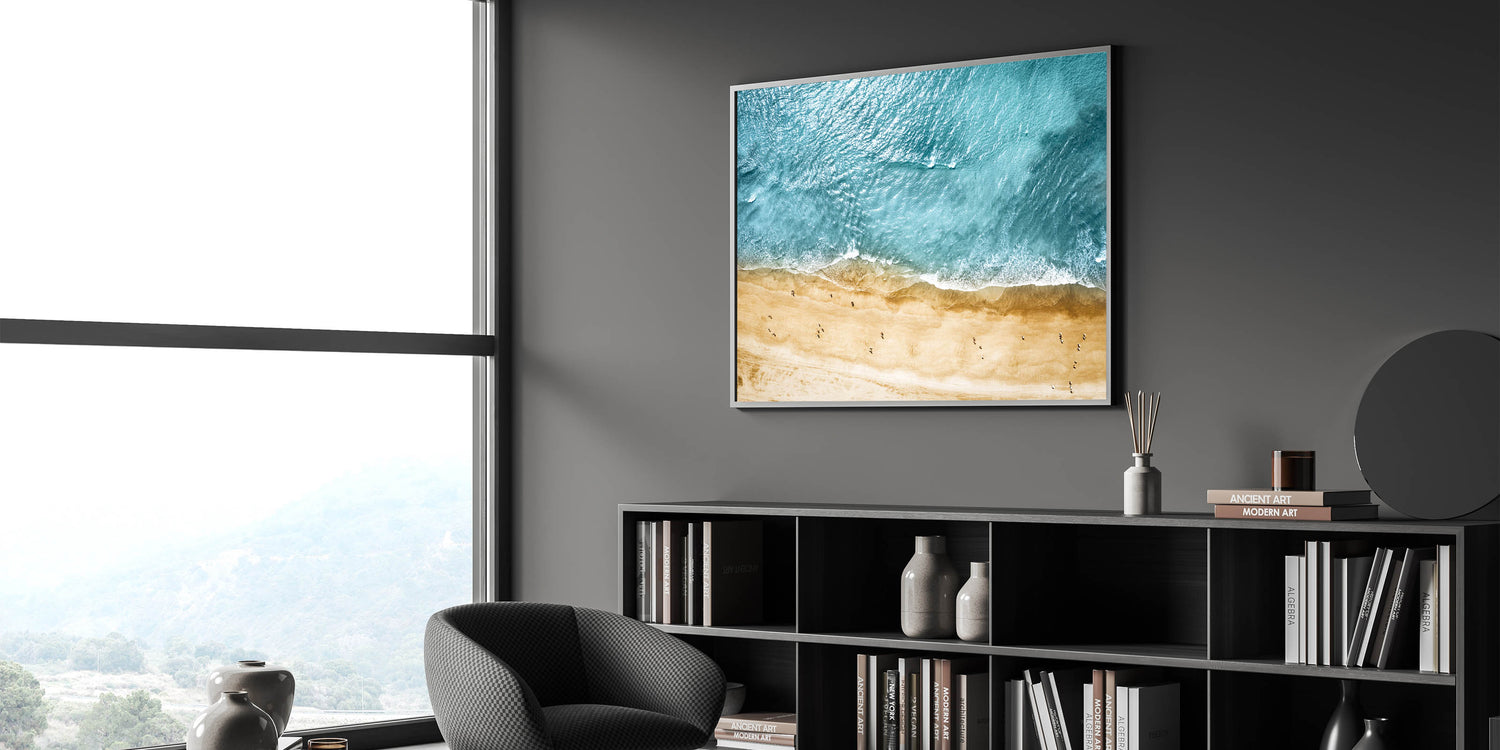 Transform your space with the tranquil beauty of this aerial beach shoreline scene. Perfect for those who love the ocean and want to create a peaceful retreat in their living space.