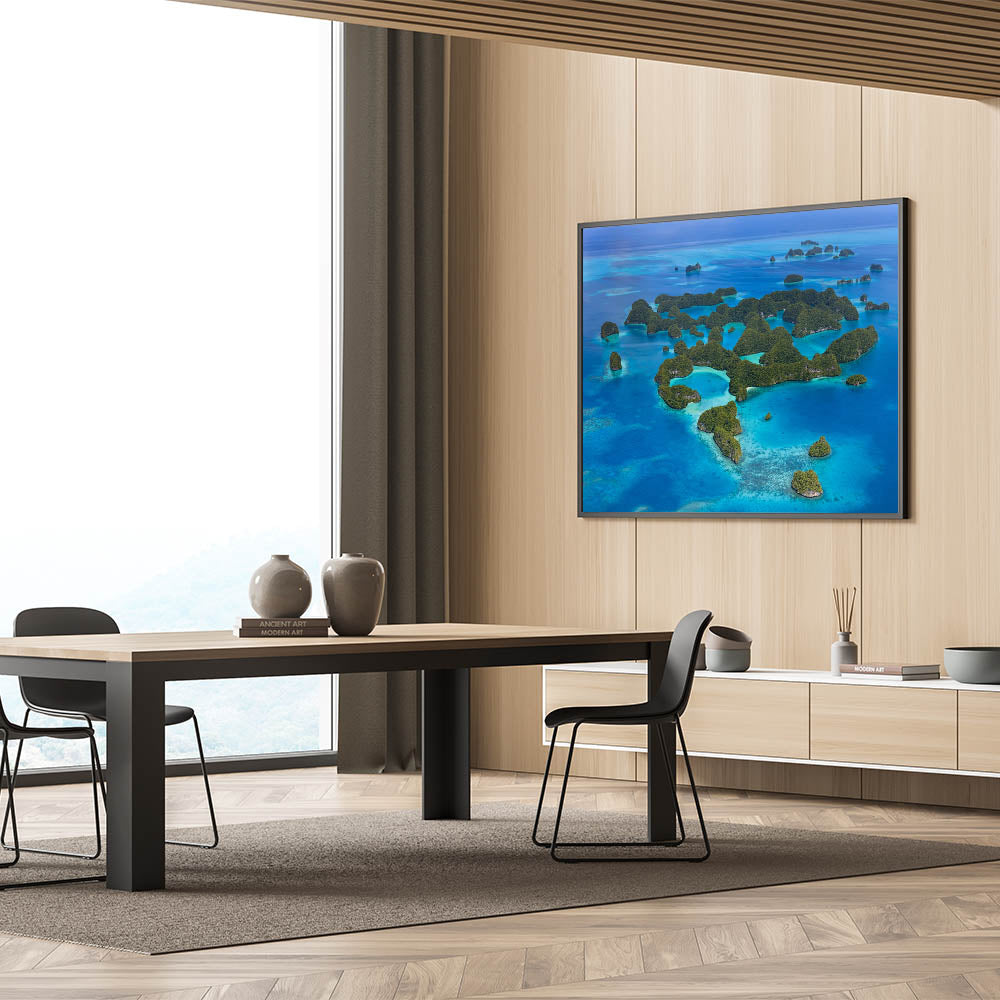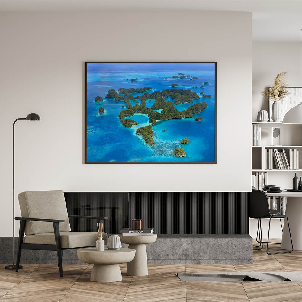 Explore the breathtaking aerial view of Micronesia with our "Aerial View of Micronesia" print, part of our Pacific Ocean Art collection. This magnificent artwork captures the stunning blue waters and lush green islands, offering a bird's-eye view of paradise.