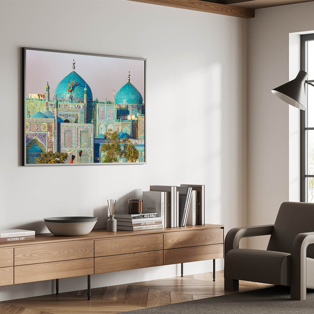 This stunning piece of Afghan wall art captures the vibrant and intricate beauty of a traditional Afghan mosque. The turquoise domes and detailed tile work make this image a true representation of Afghanistan's architectural heritage. The unique color palette and design of this canvas print make it an ideal piece for anyone looking to add a cultural and historic touch to their home decor.