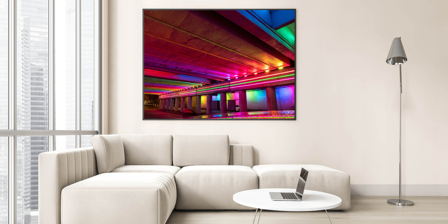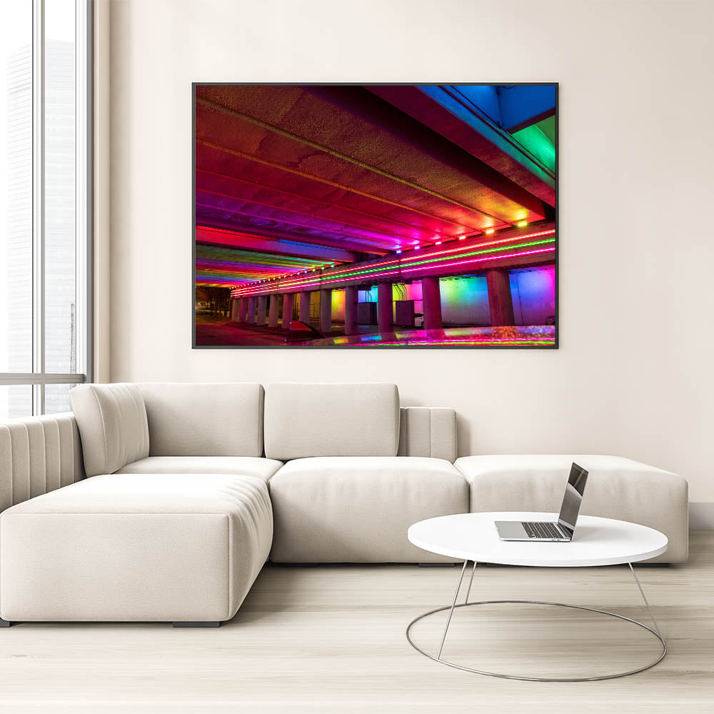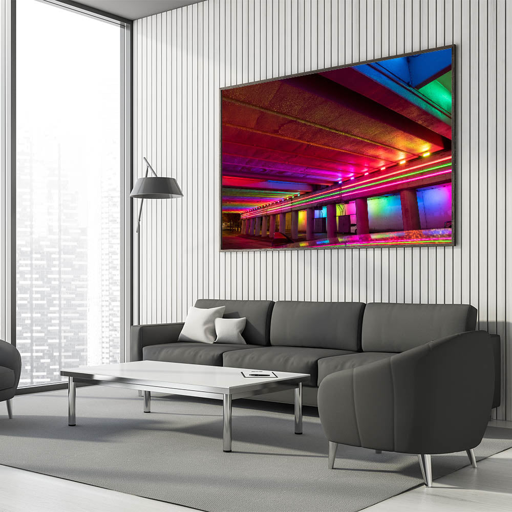 Bring a pop of color and energy to your space with this stunning Alabama cityscape wall art. Featuring a vivid display of neon lights under a city underpass, this Alabama artwork captures the dynamic spirit of urban life with its electric hues of red, pink, blue, and green. Perfect for modern interiors, this piece adds a bold touch to any room, creating a striking focal point.