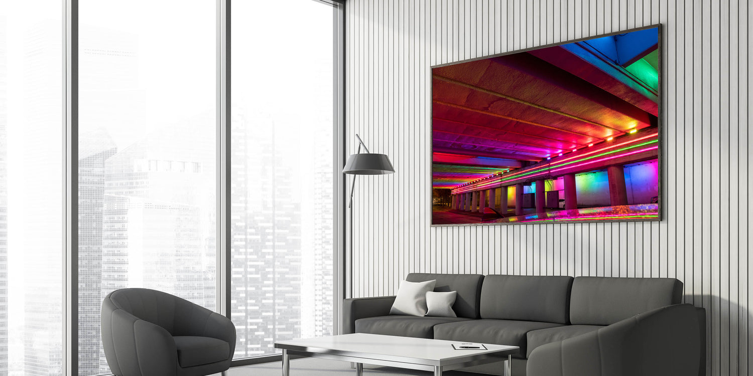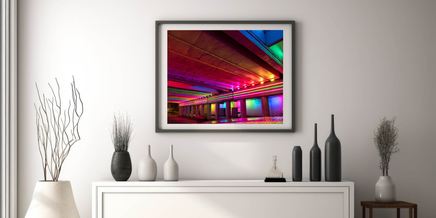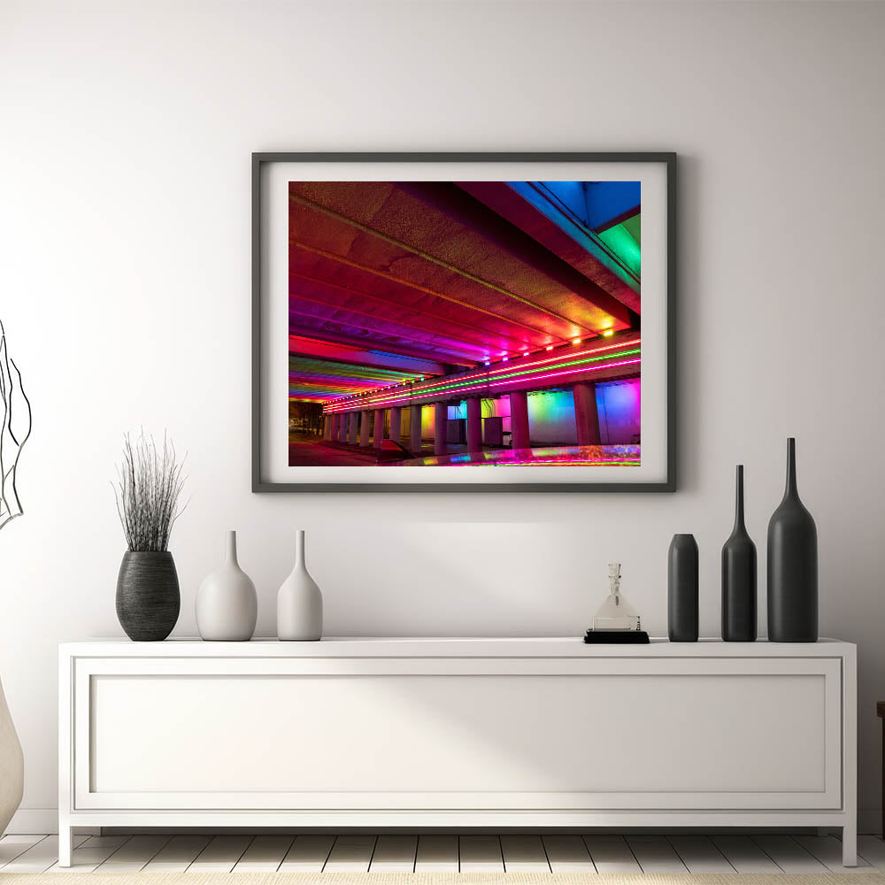 Bring a pop of color and energy to your space with this stunning Alabama cityscape wall art. Featuring a vivid display of neon lights under a city underpass, this Alabama artwork captures the dynamic spirit of urban life with its electric hues of red, pink, blue, and green. Perfect for modern interiors, this piece adds a bold touch to any room, creating a striking focal point.